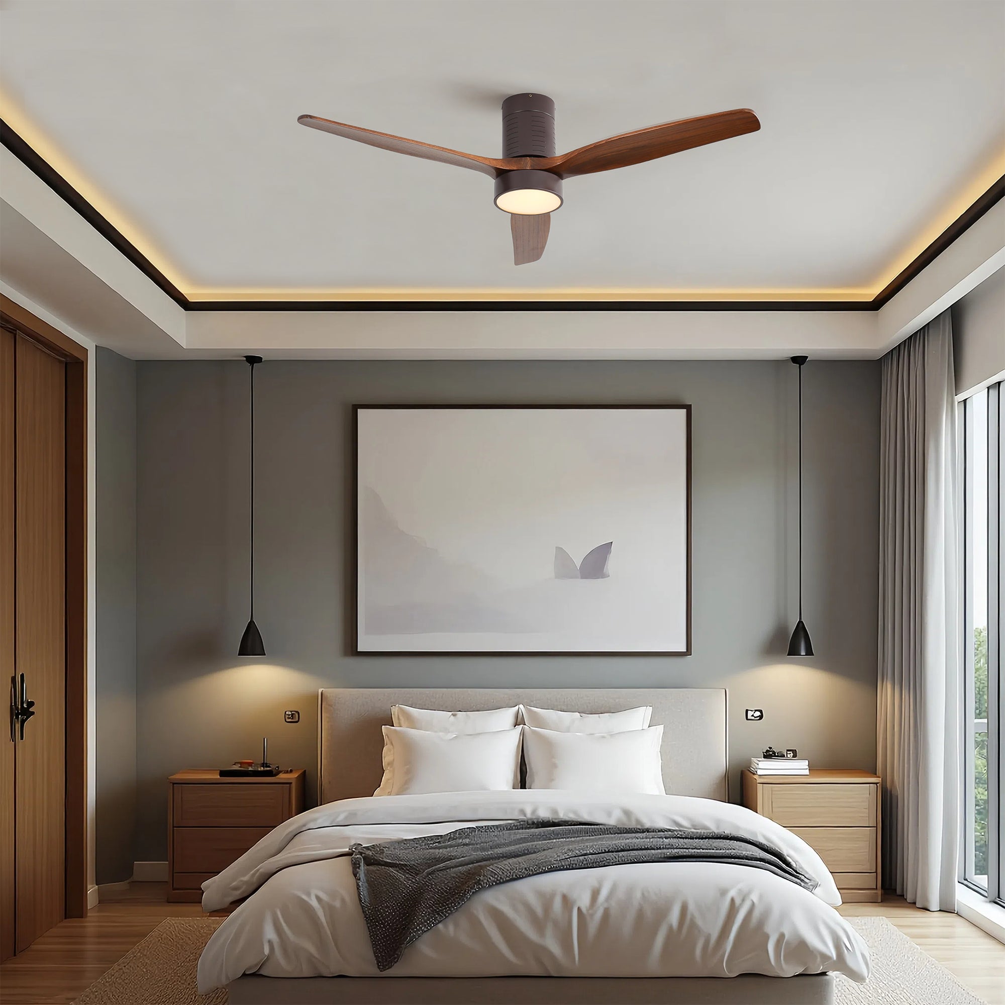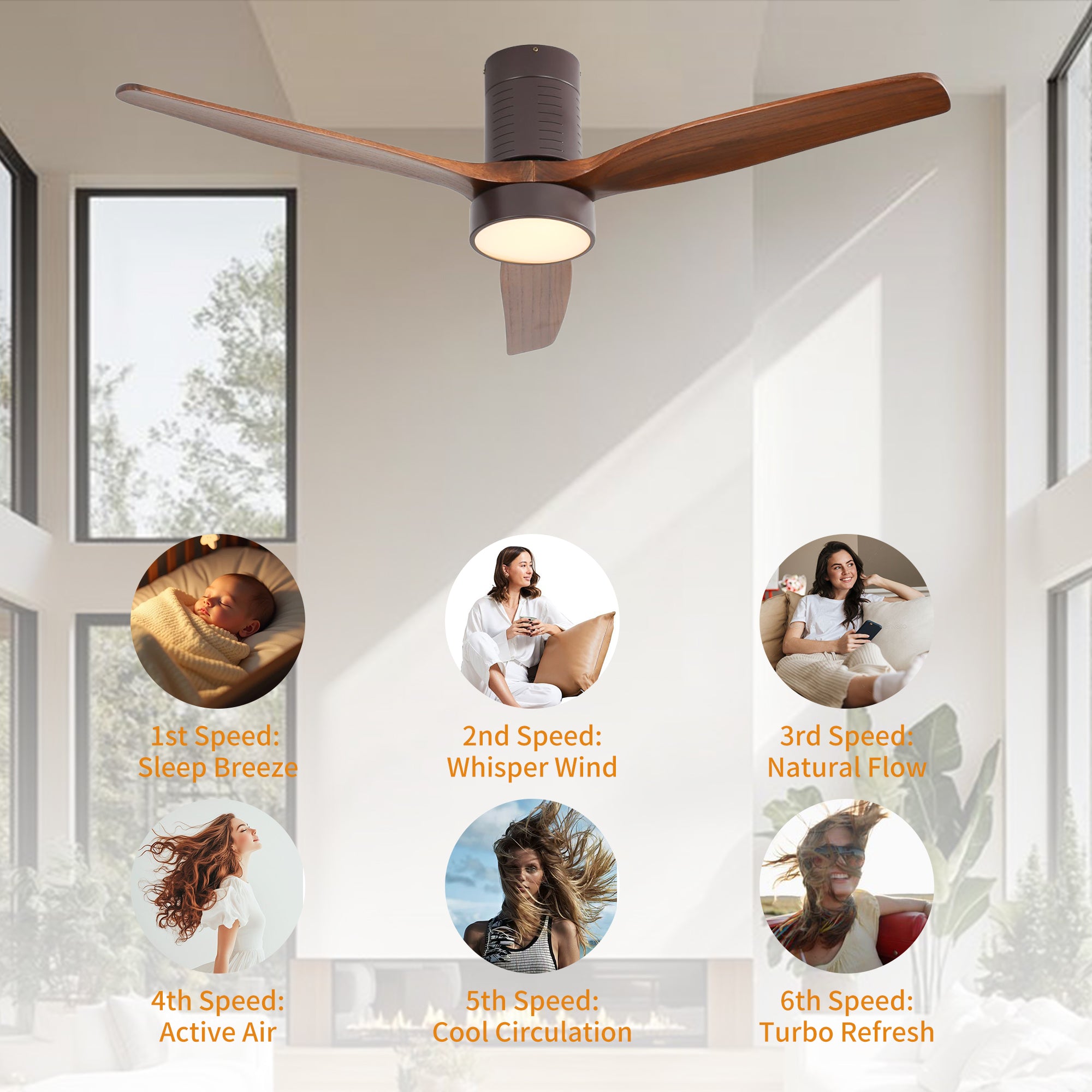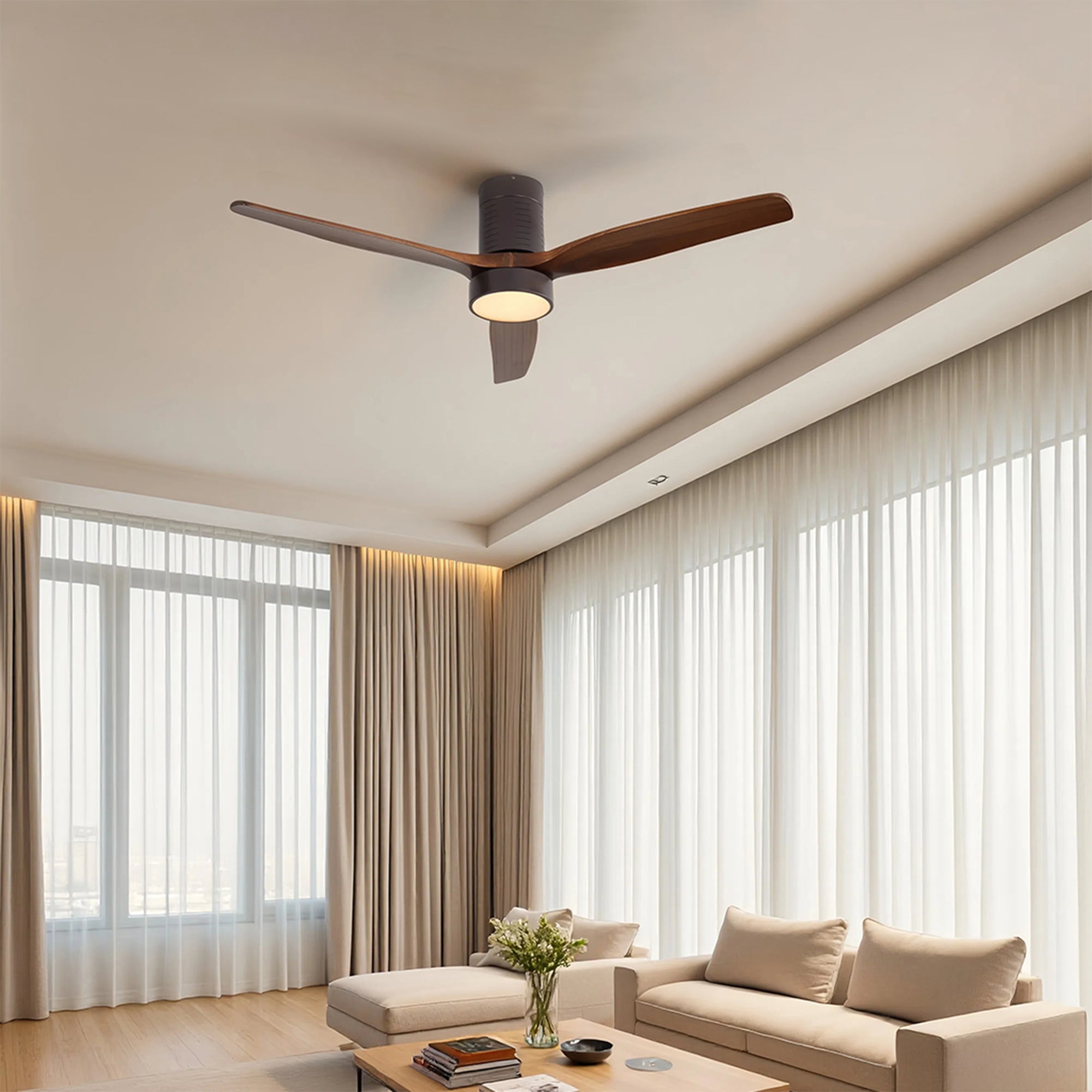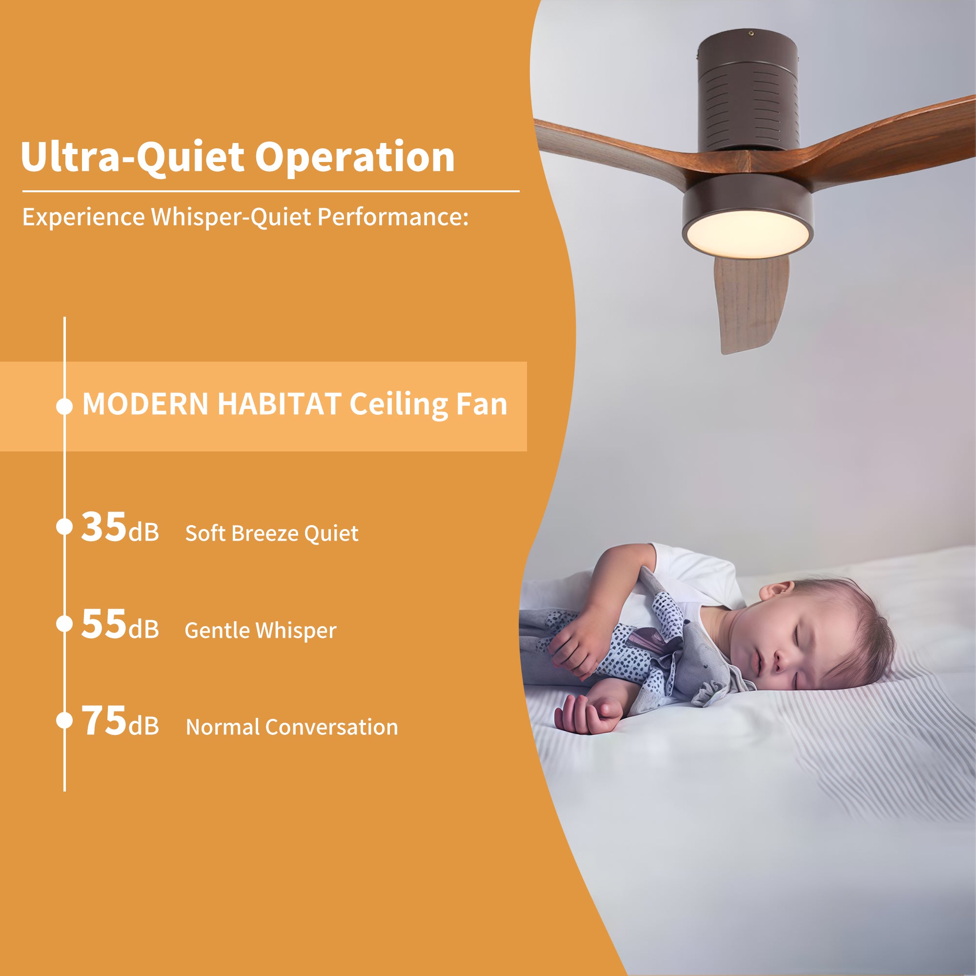 Enjoy your summer with the Serenityshine 52 in. Natural Matte Walnut ceiling fan with light-aquiet, flush-mount design from Modern Habitat Inc. The three wood blades feature amodern farmhouse style with a quiet DC motor that provides six adjustable speeds and two timeisettings with remote control. With a 13 in. height and 6 in. footprint, it providesample airflow for spaces between 200-400 square feet, perfect for living rooms, kitchens, and homoffice bedrooms-ideal for compact spaces. The fan features easy-install Quiet Motor technology with two airflow modes, quaranteeing minimal noise.