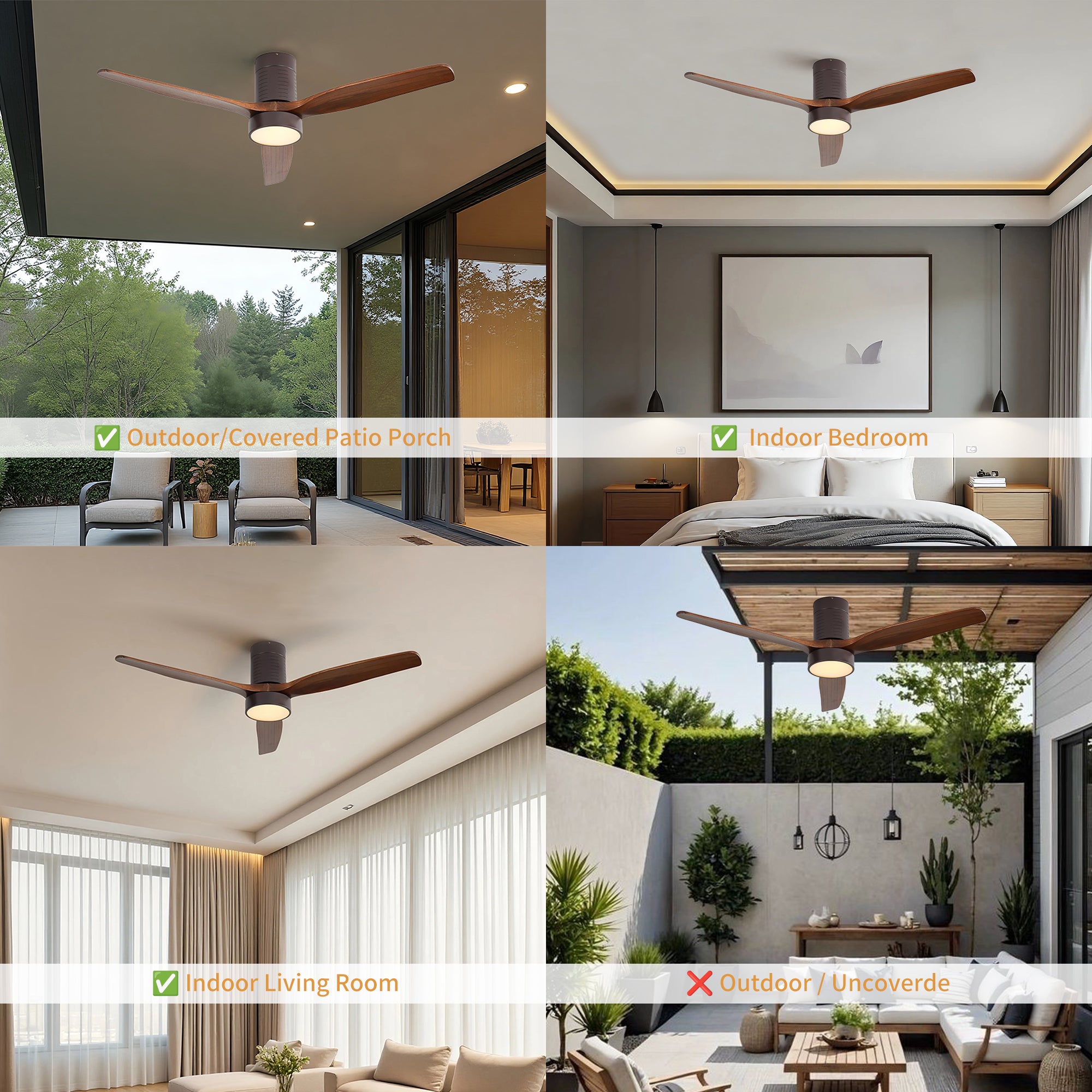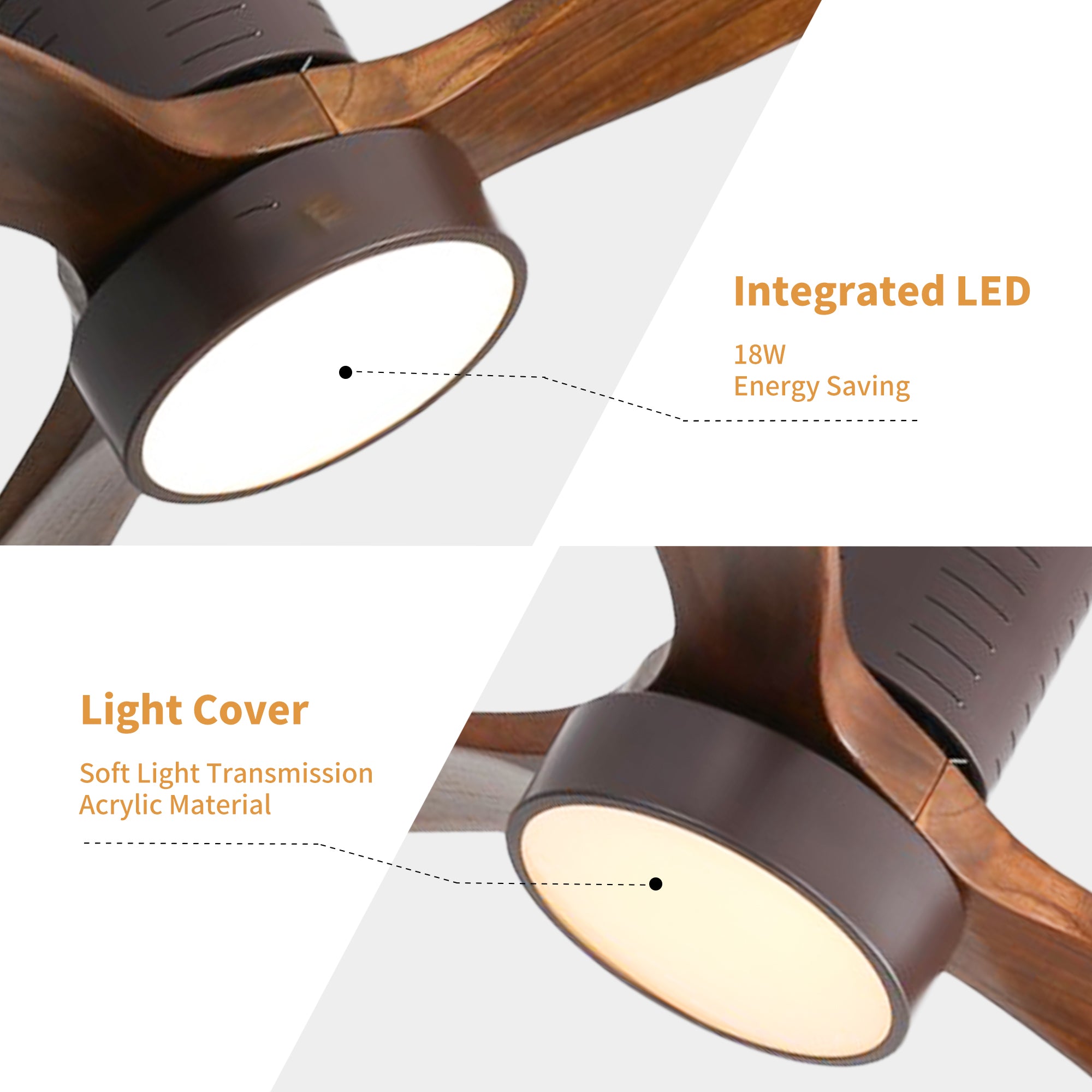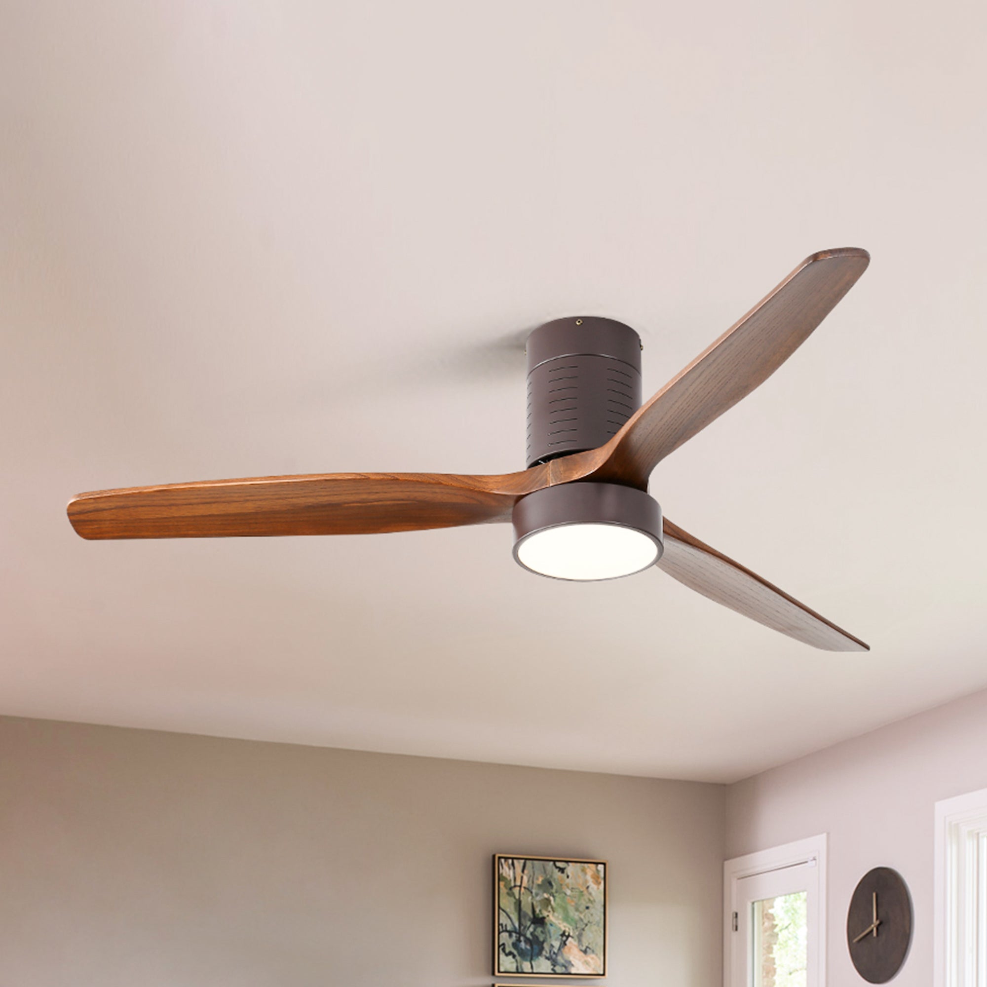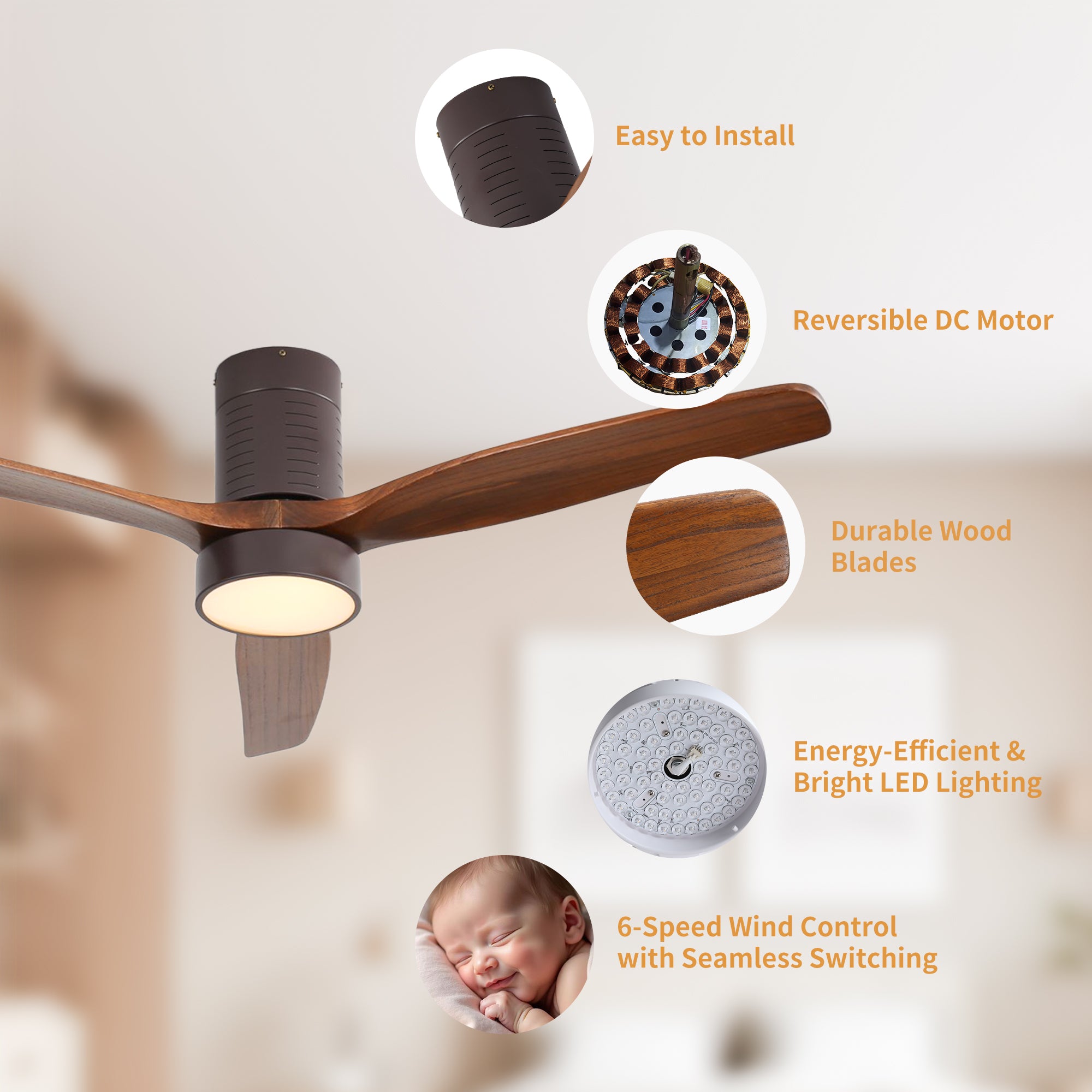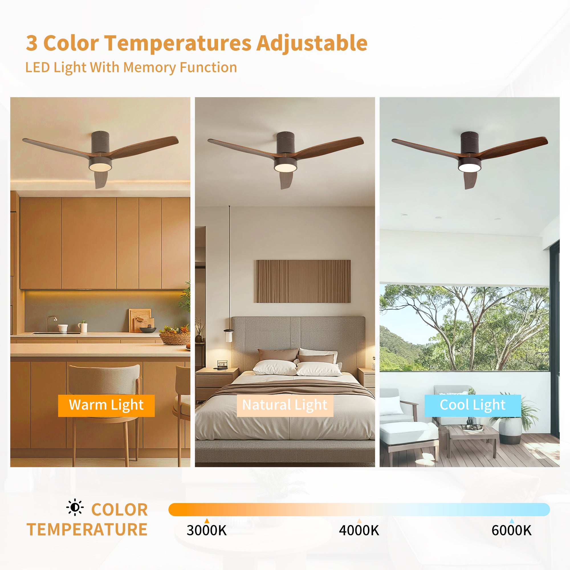 Enjoy your summer with the Serenityshine 52 in. Natural Matte Walnut ceiling fan with light-aquiet, flush-mount design from Modern Habitat Inc. The three wood blades feature amodern farmhouse style with a quiet DC motor that provides six adjustable speeds and two timeisettings with remote control. With a 13 in. height and 6 in. footprint, it providesample airflow for spaces between 200-400 square feet, perfect for living rooms, kitchens, and homoffice bedrooms-ideal for compact spaces. The fan features easy-install Quiet Motor technology with two airflow modes, quaranteeing minimal noise.