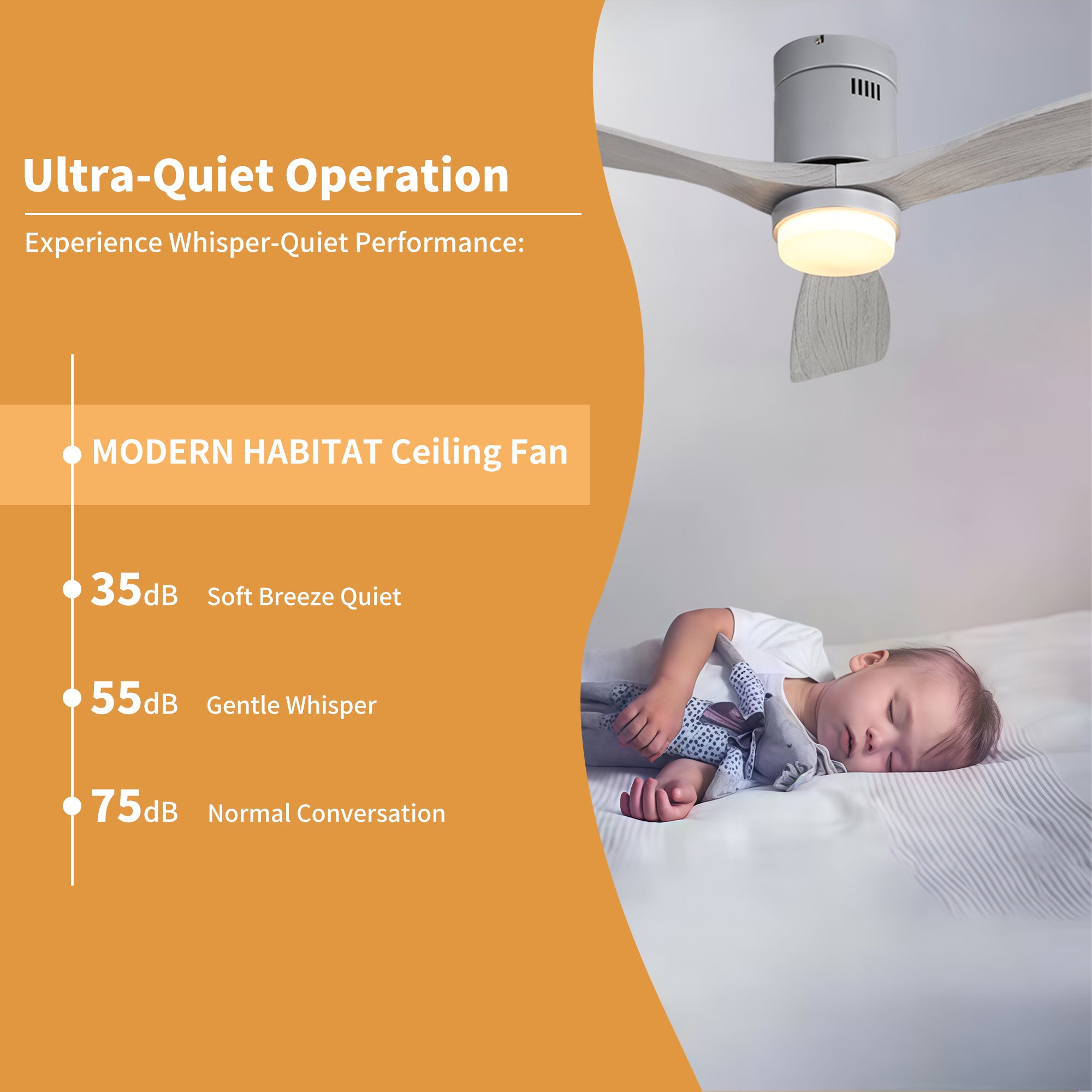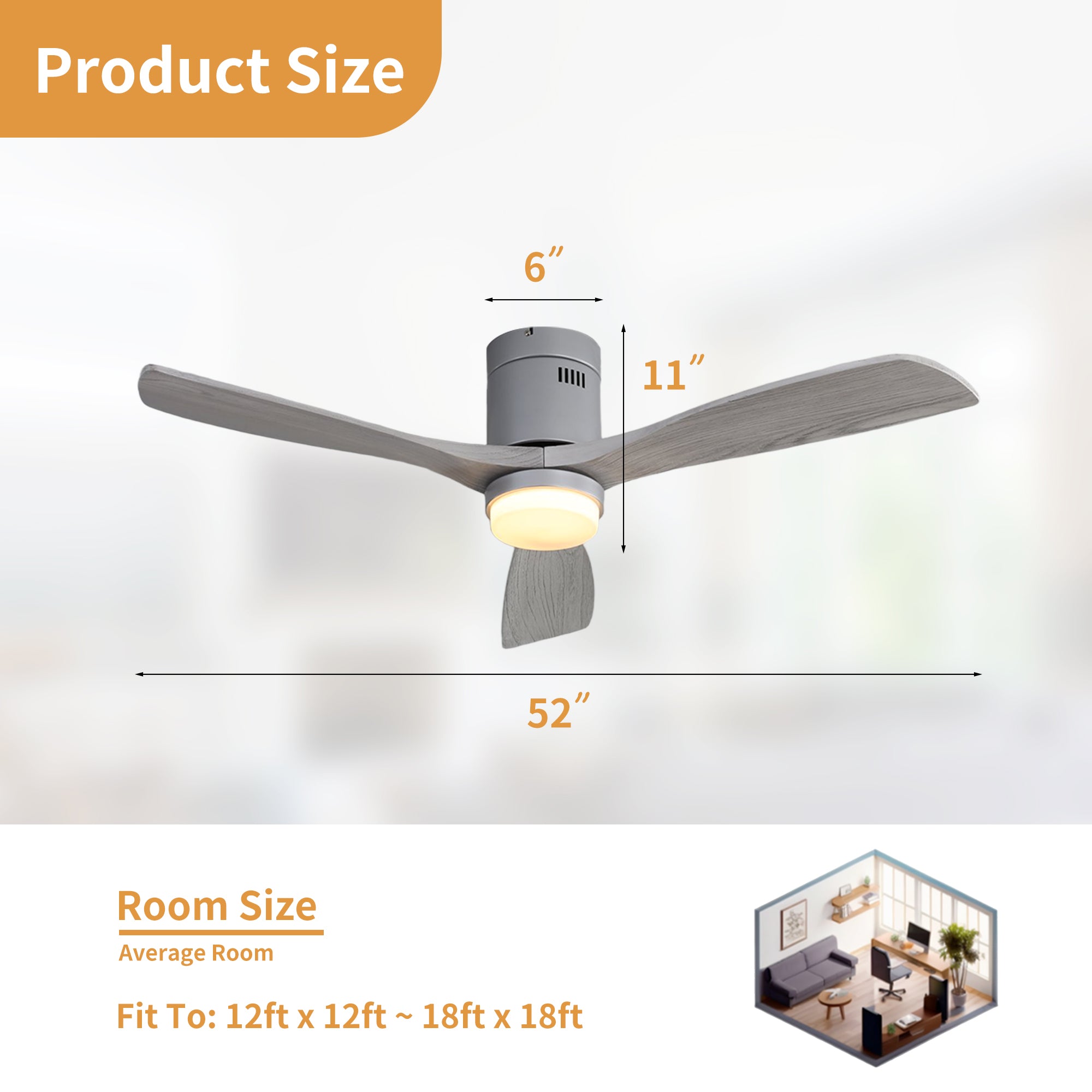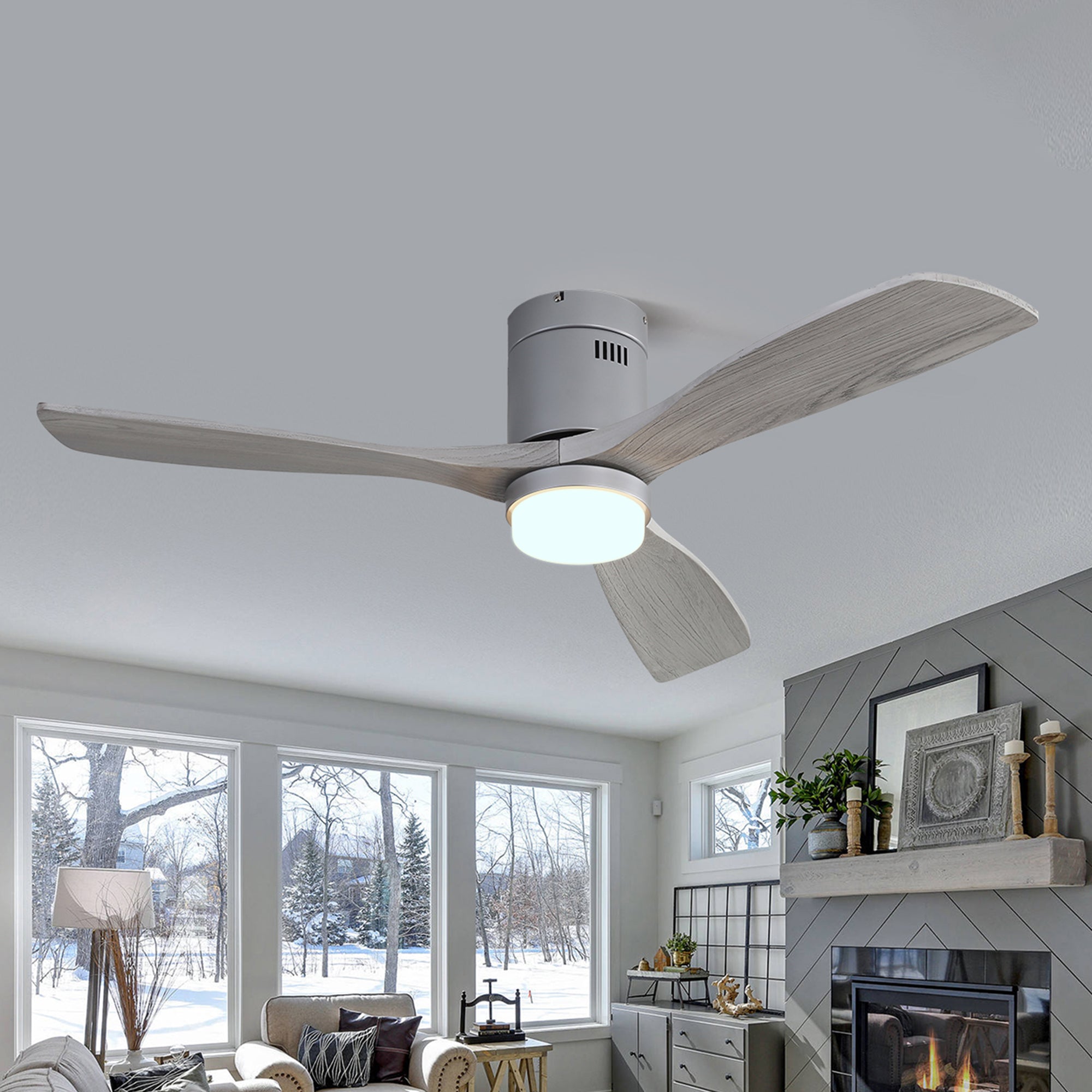 Enjoy your summer with the SerenityShine 52 in. Natural Matte Silver ceiling fan with light-aquiet, flush-mount design from Modern Habitat Inc. The three wood blades feature amodern farmhouse style with a quiet DC motor that provides six adjustable speeds and three timeisettings with remote control. With a 11.14 in. height and 6 in. footprint, it providesample airflow for spaces between 200-400 square feet, perfect for living rooms, kitchens, and homoffice bedrooms-ideal for compact spaces. The fan features easy-install Quiet Motor technology with two airflow modes, quaranteeing minimal noise.
