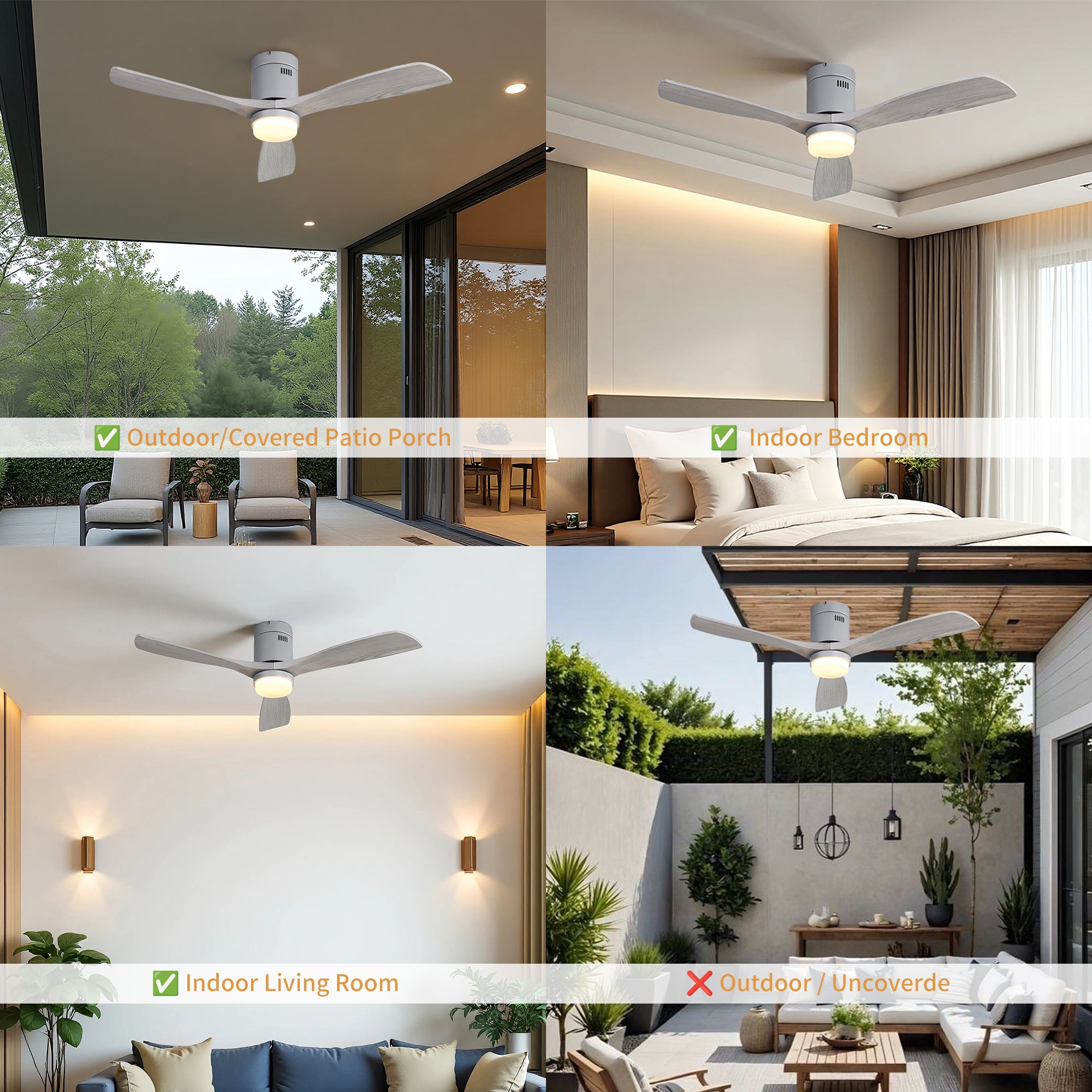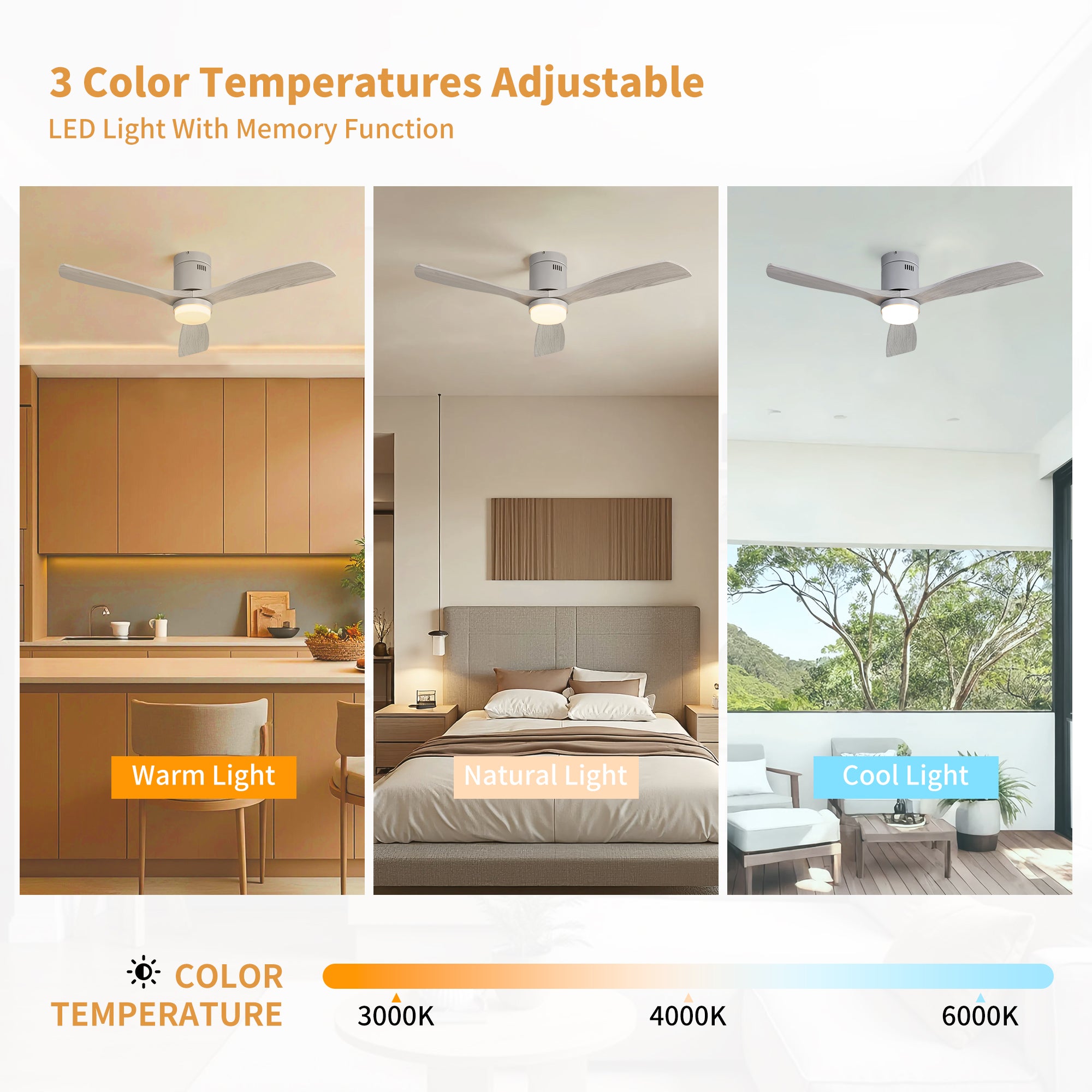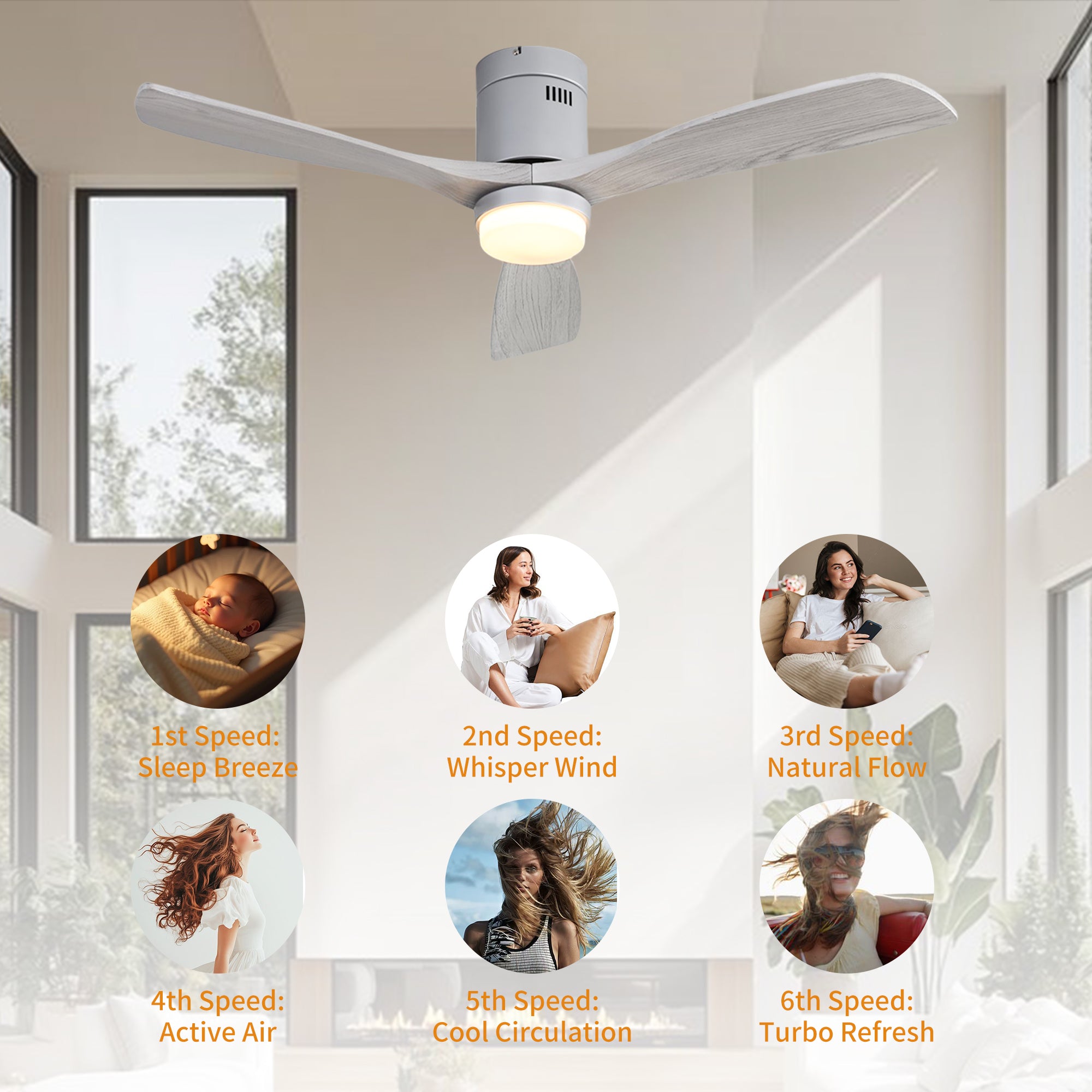 Enjoy your summer with the SerenityShine 52 in. Natural Matte Silver ceiling fan with light-aquiet, flush-mount design from Modern Habitat Inc. The three wood blades feature amodern farmhouse style with a quiet DC motor that provides six adjustable speeds and three timeisettings with remote control. With a 11.14 in. height and 6 in. footprint, it providesample airflow for spaces between 200-400 square feet, perfect for living rooms, kitchens, and homoffice bedrooms-ideal for compact spaces. The fan features easy-install Quiet Motor technology with two airflow modes, quaranteeing minimal noise.