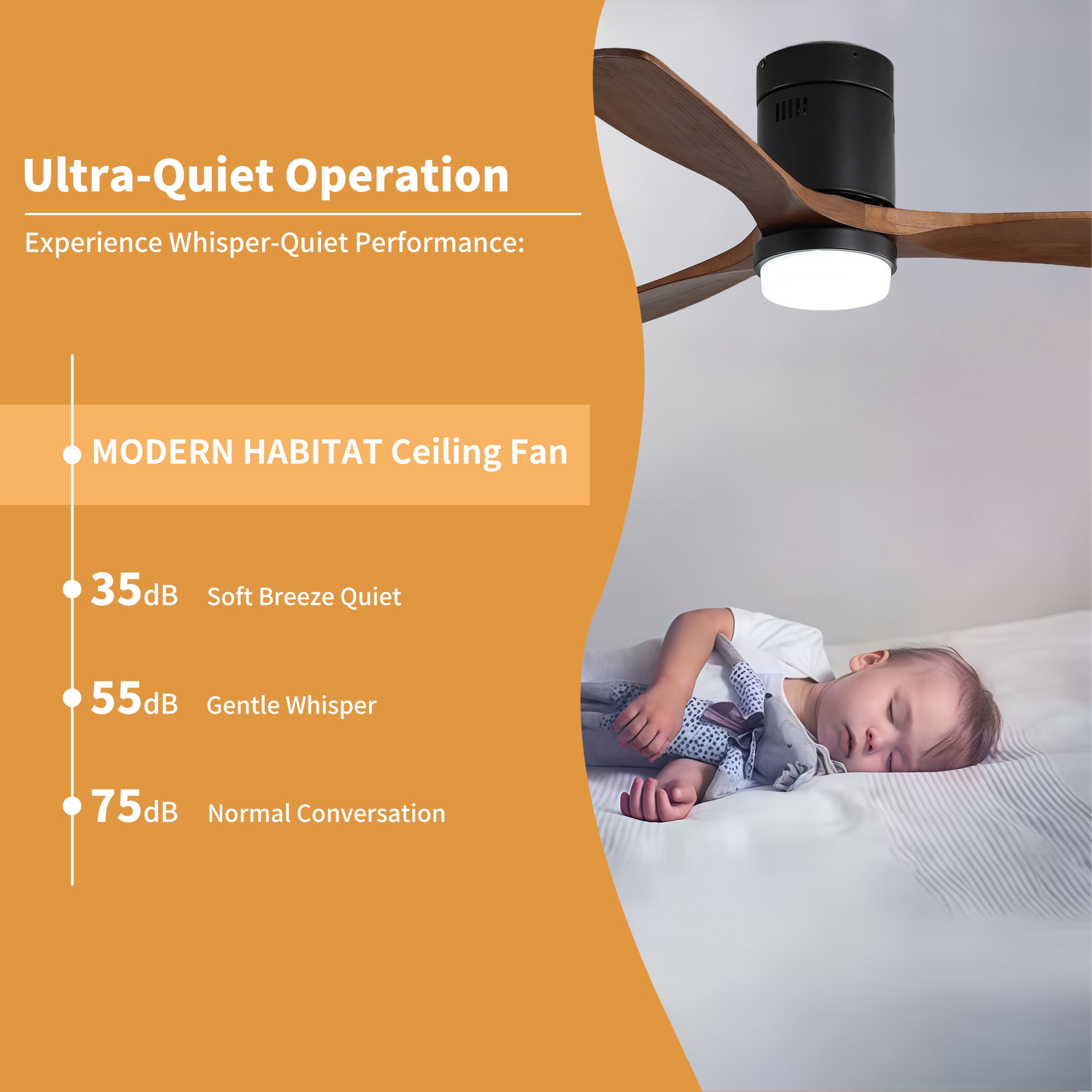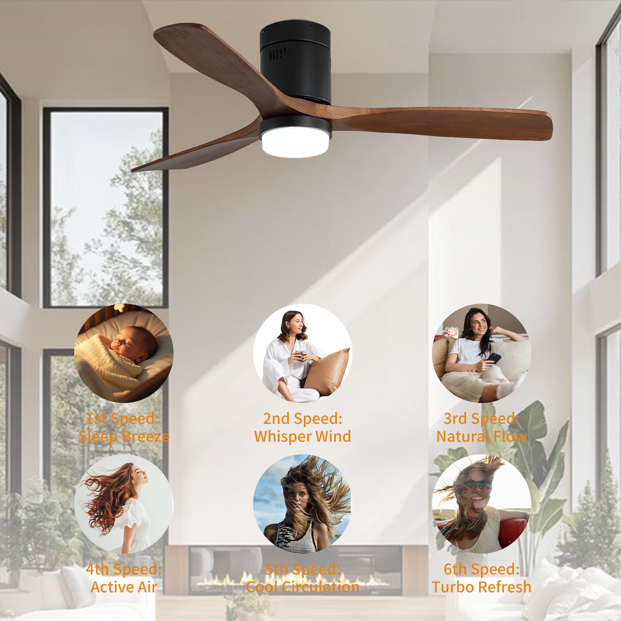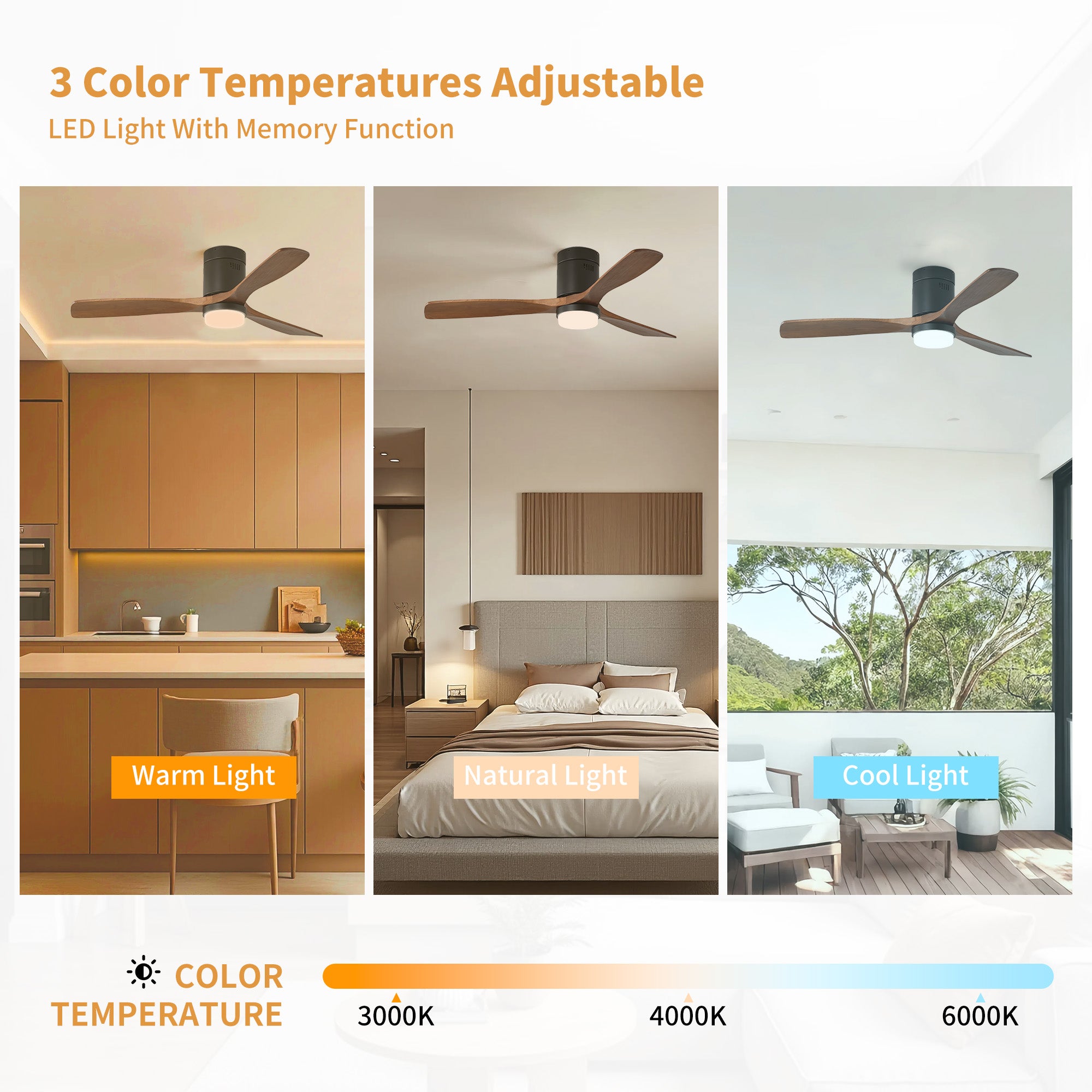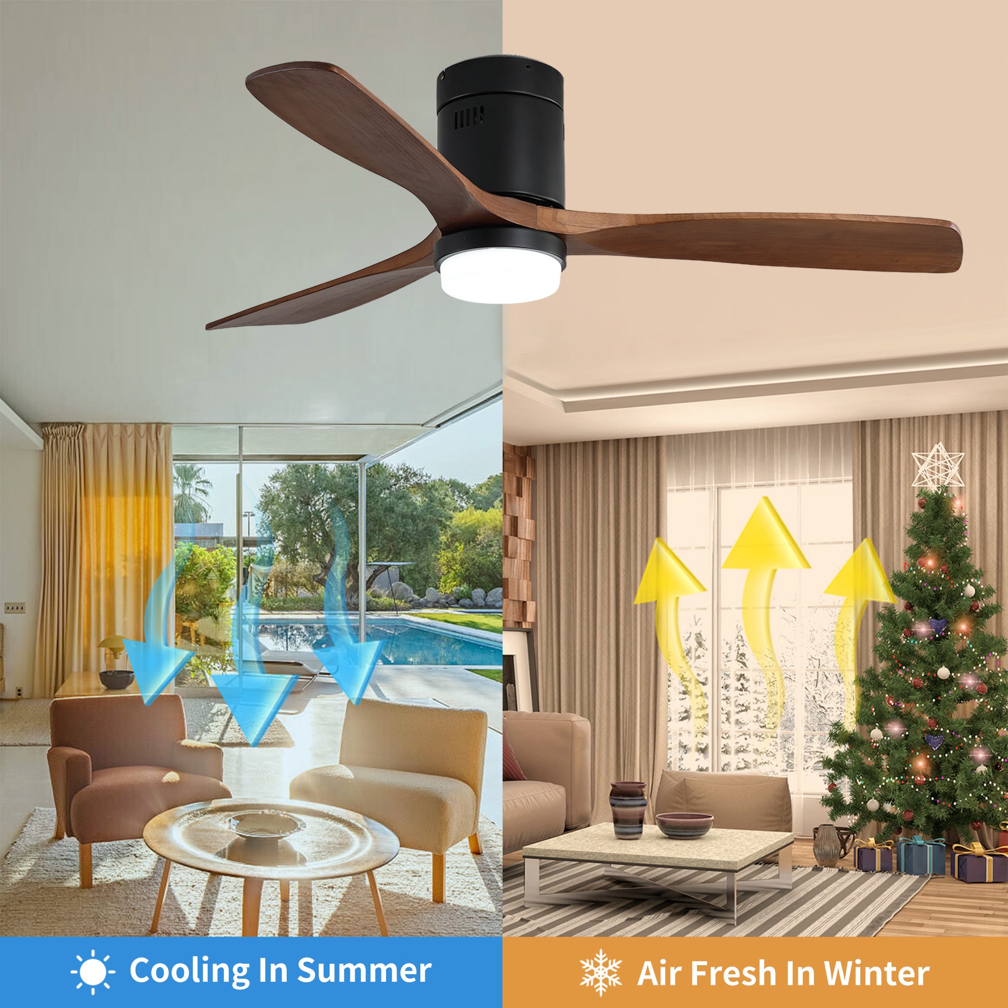 Stay warm and comfortable all winter with the 52 in. Matte Black Metal ceiling fan with light from Modern Habitat. The flush mount minimal design provides a small footprint, creating elevated designs that fit interiors representing both traditional and modern American lifestyles. Featuring three solid wood blades with a reverse function that provides a winter ceiling fan setting mode, and comes with a remote control. The fan features easy-install Quiet Motor technology with three airflow modes, guaranteeing minimal noise. A quiet DC motor provides six adjustable speeds and three timer settings. It to fit spaces from 200–400 square feet — from living rooms and kitchens to home offices and bedrooms — accommodating various ceiling heights from open-mount to high ceilings. Warm lighting settings come with three lighting temperature options to help improve air circulation and enhance your holiday home living experience.