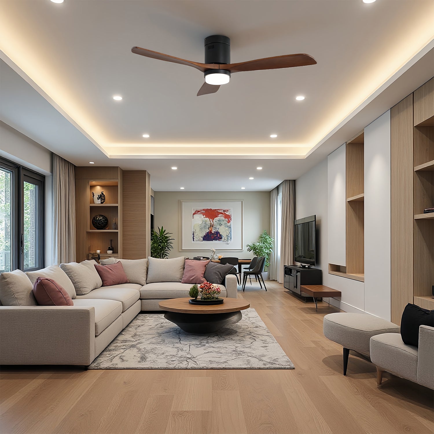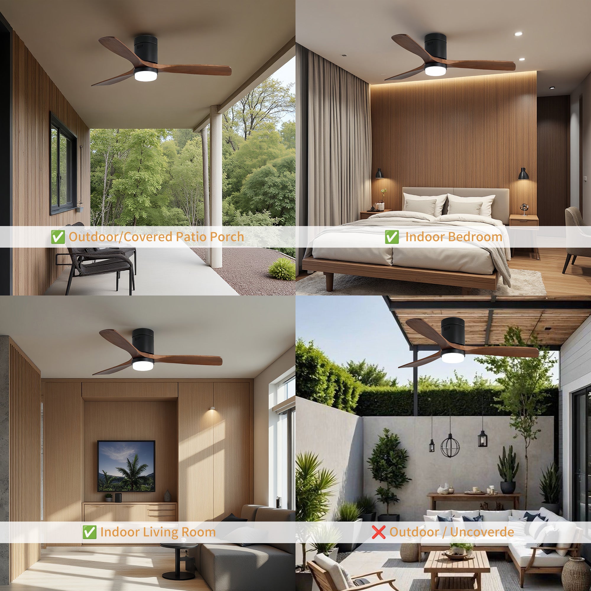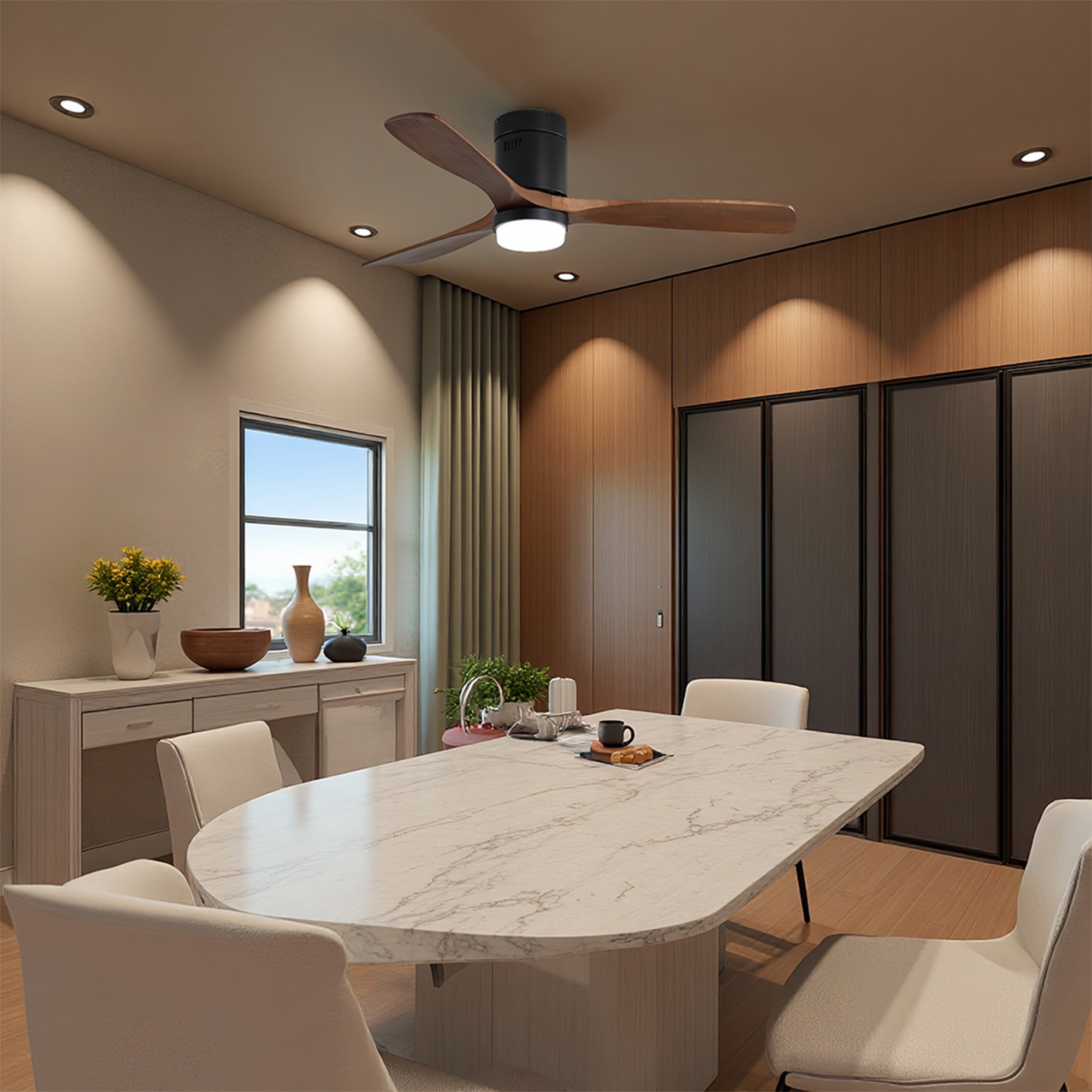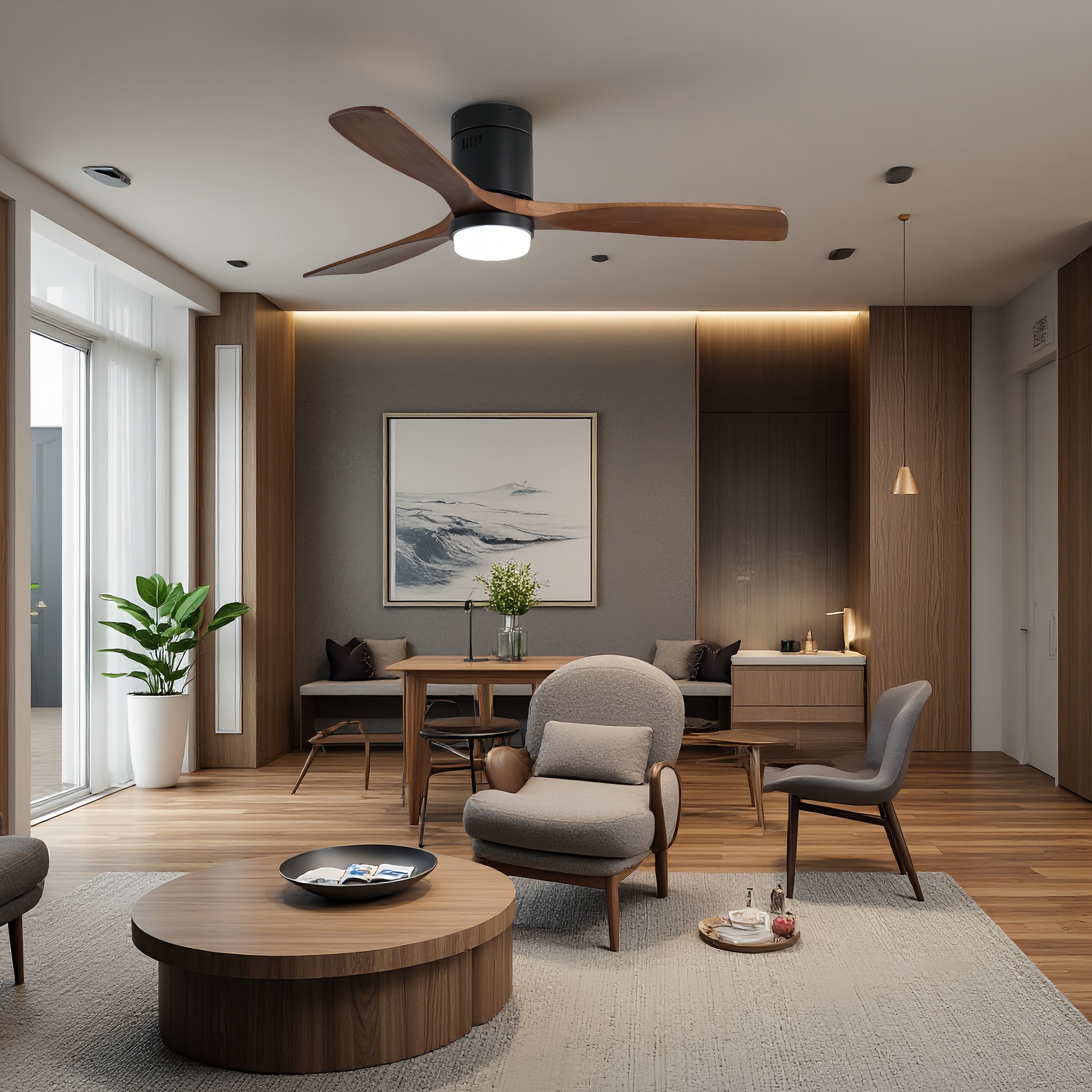Stay warm and comfortable all winter with the 52 in. Matte Black Metal ceiling fan with light from Modern Habitat. The flush mount minimal design provides a small footprint, creating elevated designs that fit interiors representing both traditional and modern American lifestyles. Featuring three solid wood blades with a reverse function that provides a winter ceiling fan setting mode, and comes with a remote control. The fan features easy-install Quiet Motor technology with three airflow modes, guaranteeing minimal noise. A quiet DC motor provides six adjustable speeds and three timer settings. It to fit spaces from 200–400 square feet — from living rooms and kitchens to home offices and bedrooms — accommodating various ceiling heights from open-mount to high ceilings. Warm lighting settings come with three lighting temperature options to help improve air circulation and enhance your holiday home living experience.
