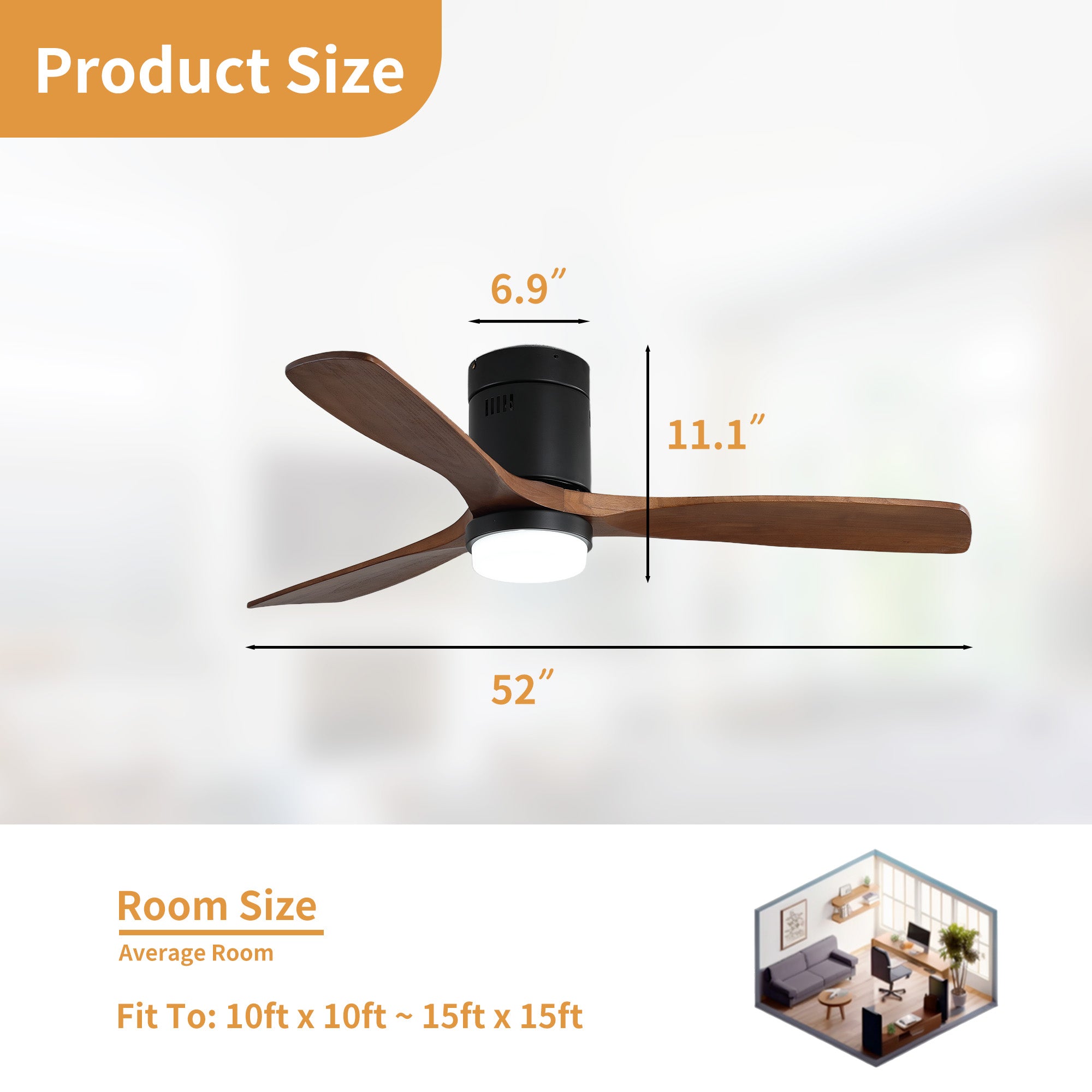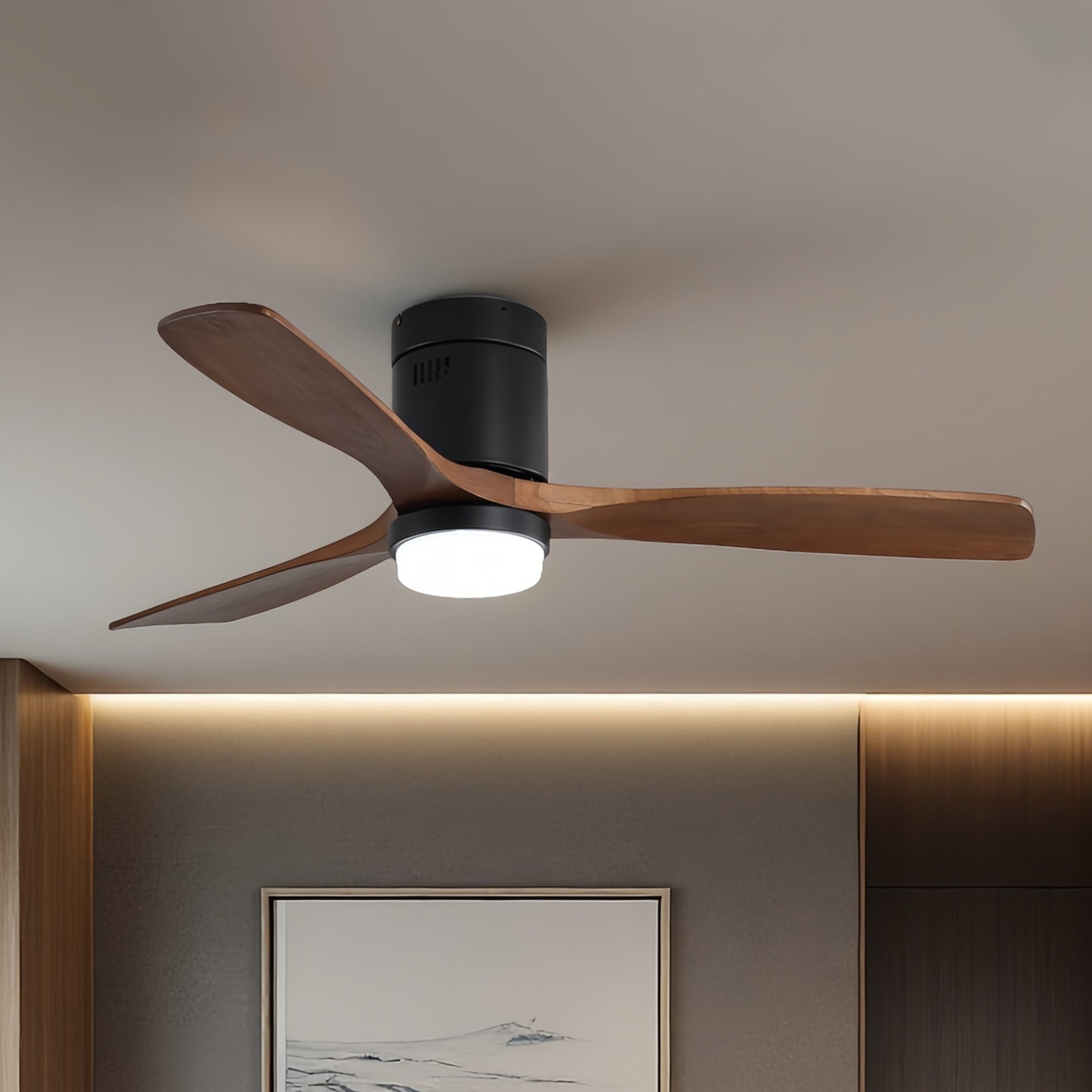 - 52 in. ceiling fan with Walnut Wood blades and modern Matte Black housing finish