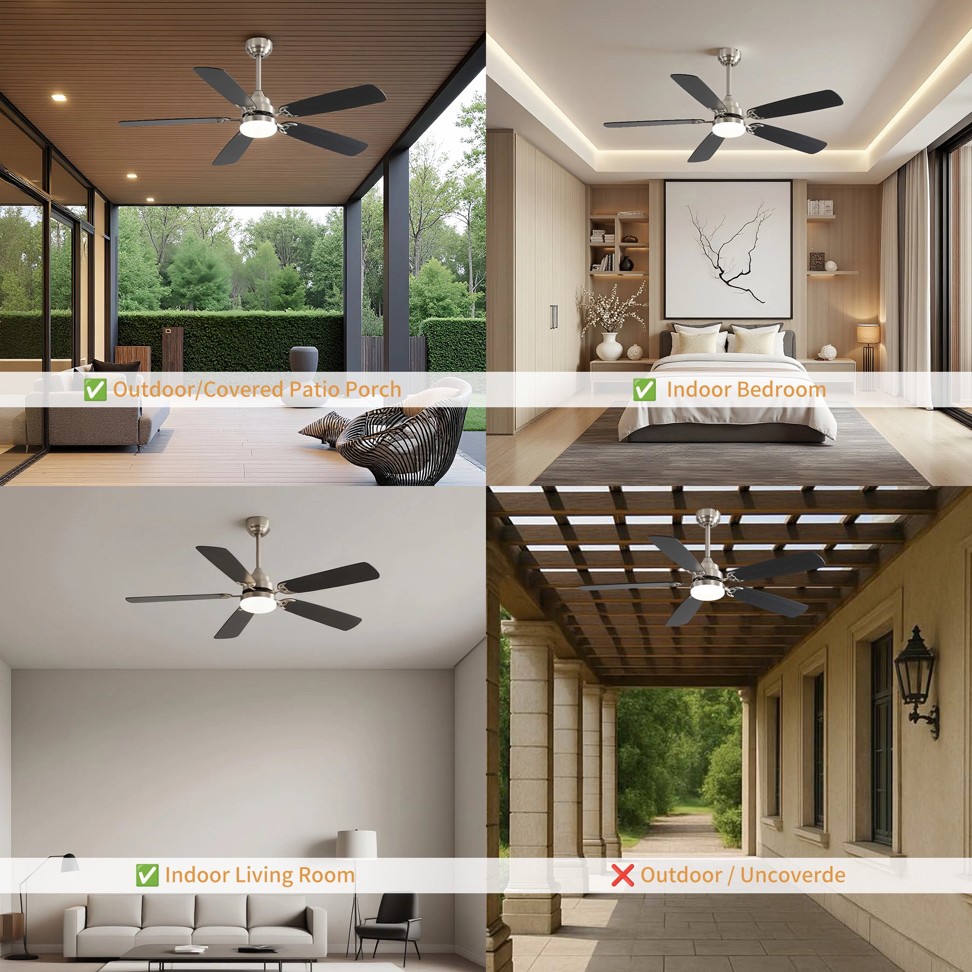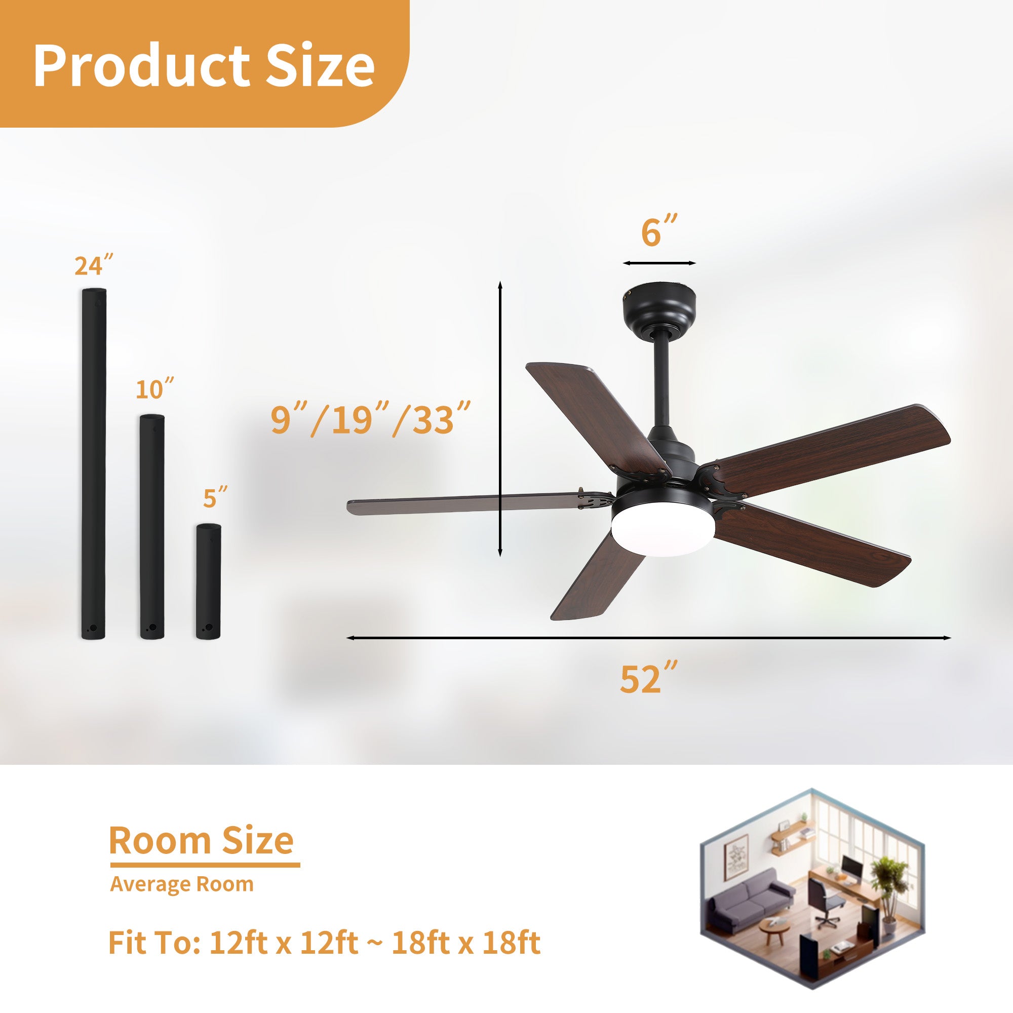 - 2 downrod options (5,10 in.) for rooms 200-300 square feet with up to 15-degree angled ceilings.