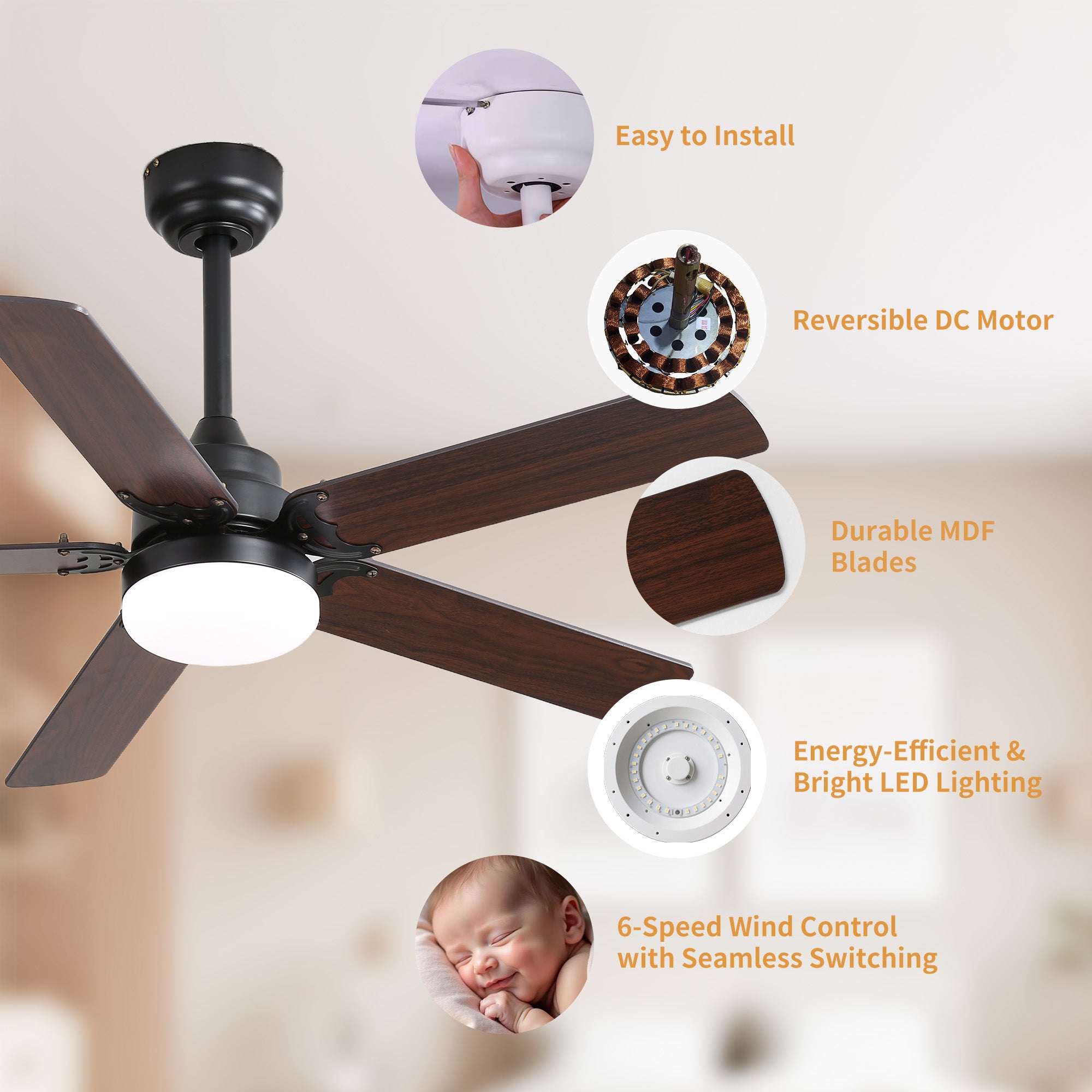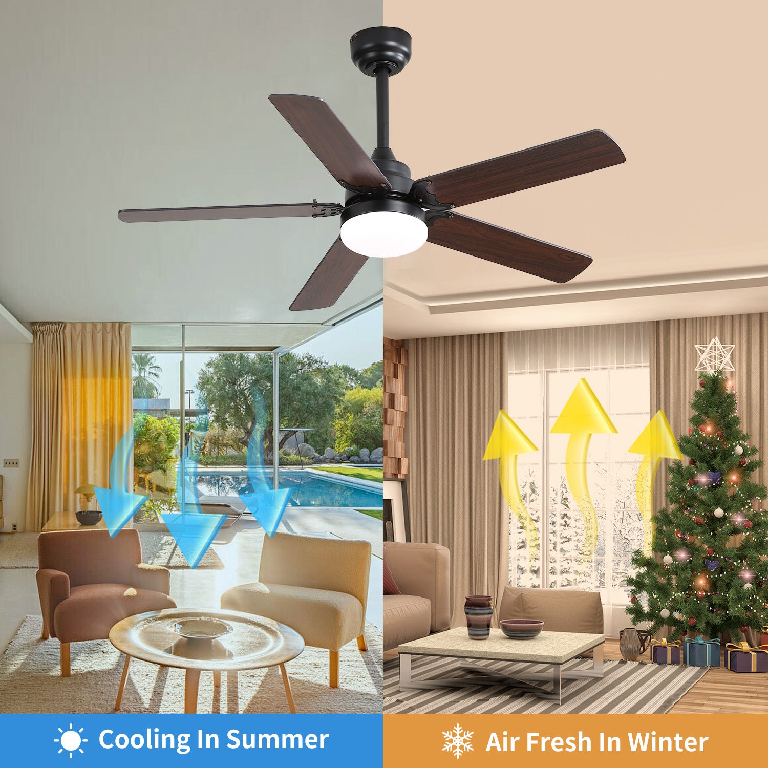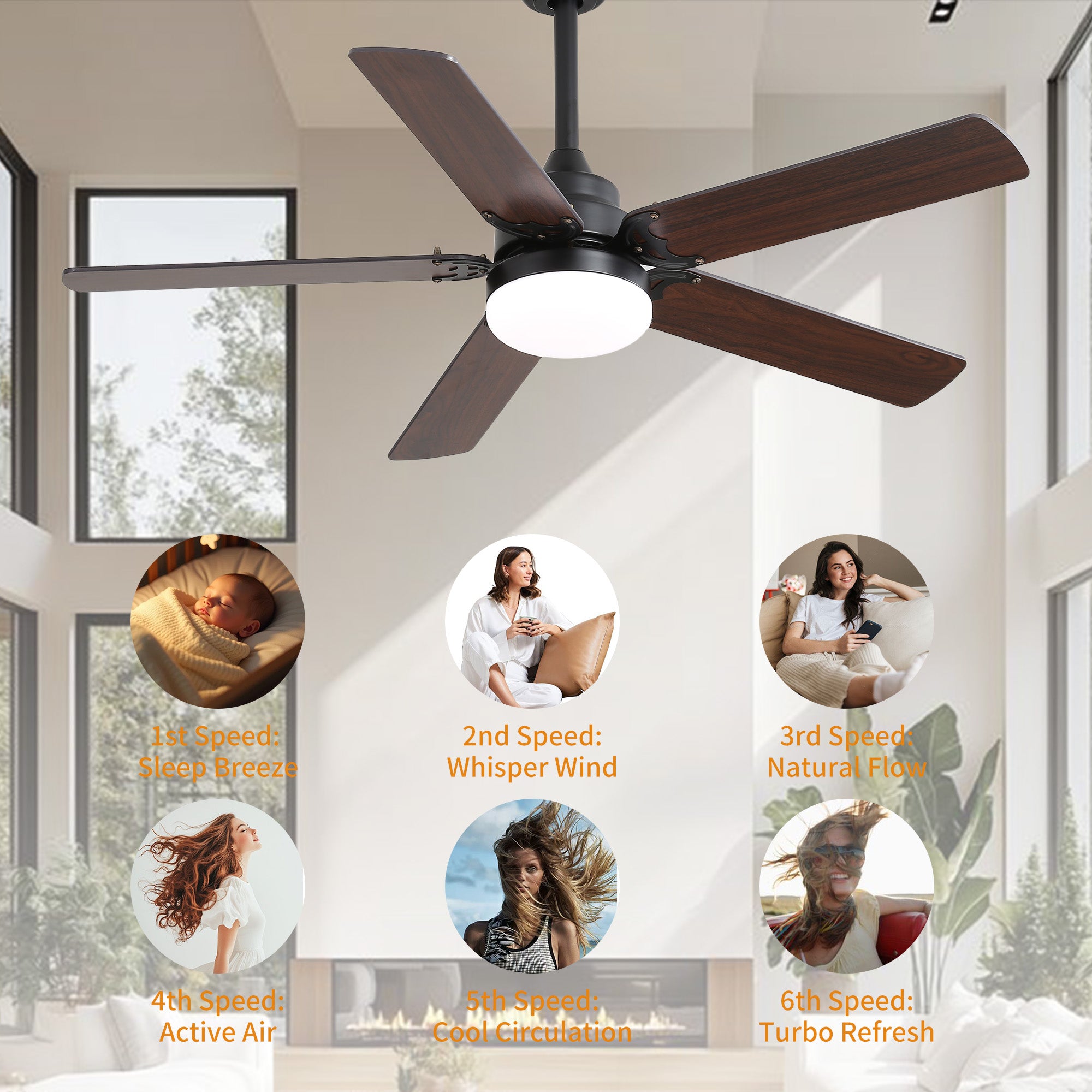 - Reversible airflow and natural breeze settings.