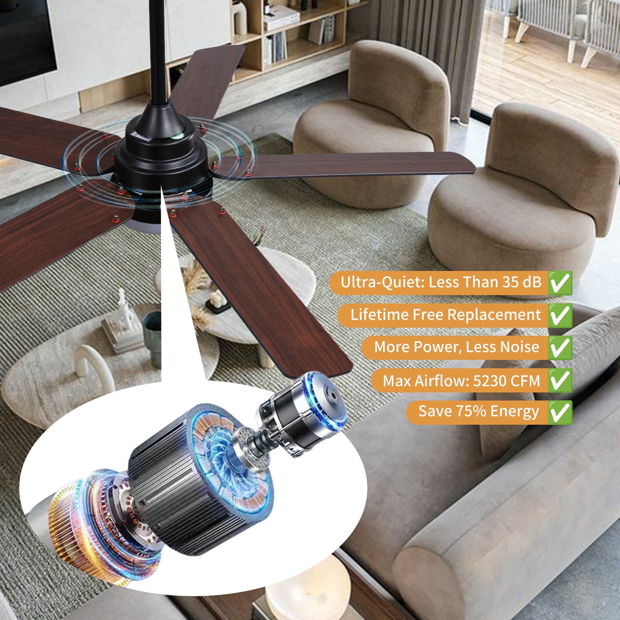 - 42 in. ceiling fan with Dark Walnut blades and modern Black housing finish.