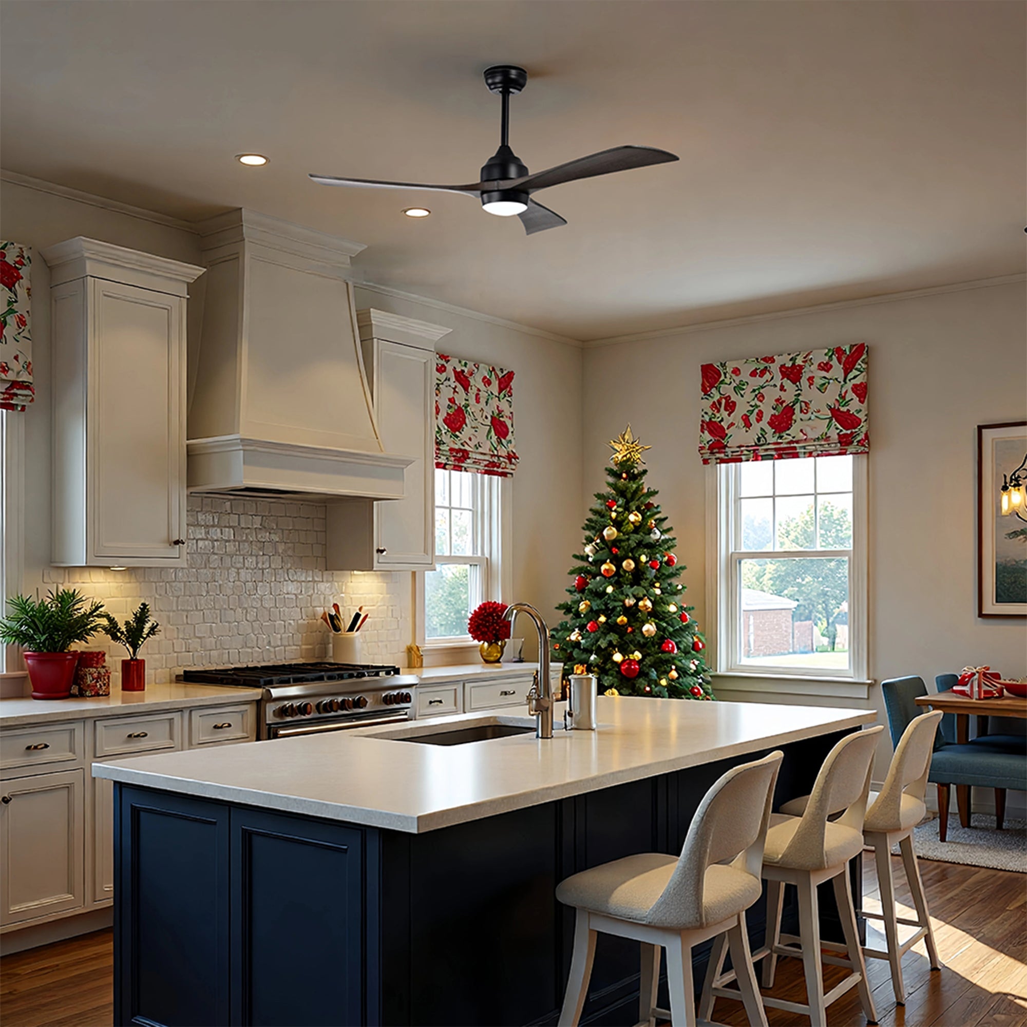 Stay warm and comfortable all winter with the 52 in. Matte Black Metal ceiling fan with light from Modern Habitat. Featuring three Solid wood blades with a reverse function that provides a winter ceiling fan setting mode, and comes with a remote control. The minimal design fits interiors that present both traditional and modern American lifestyles. The fan features easy-install Quiet Motor technology with three airflow modes, guaranteeing minimal noise. A quiet DC motor provides six adjustable speeds and Four timer settings. It comes with a 5 and 10 in. downrod to fit spaces from 200–400 square feet — from living rooms and kitchens to home offices and bedrooms — accommodating various ceiling heights from open-mount to high ceilings. The mounting options also allow installation on angled ceilings up to 15°. Warm lighting settings come with three lighting temperature options to help improve air circulation and enhance your holiday home living experience.