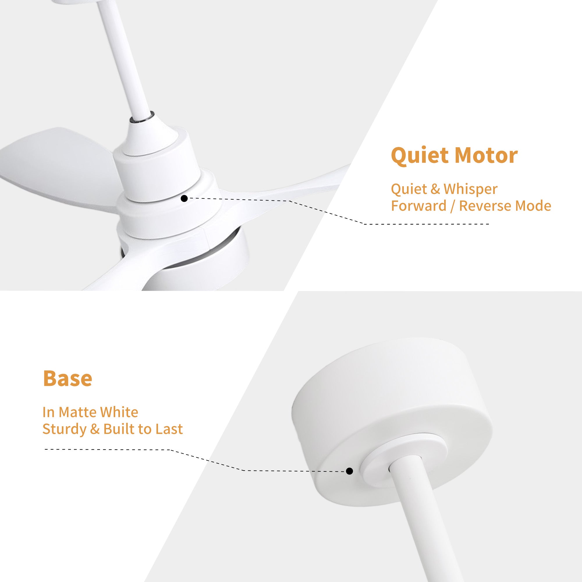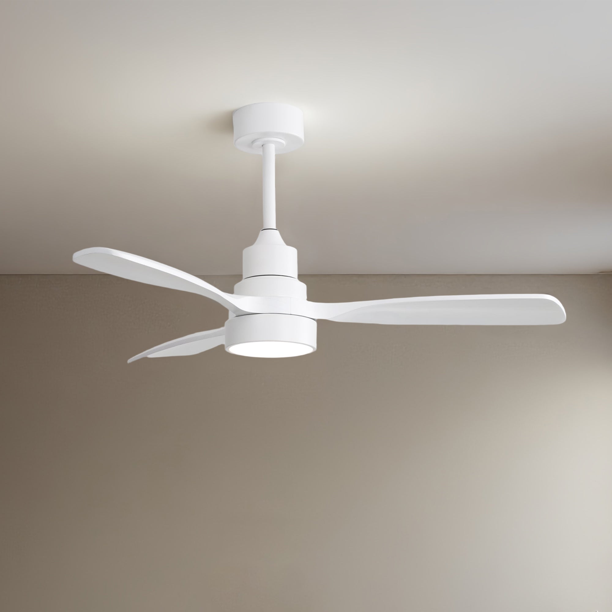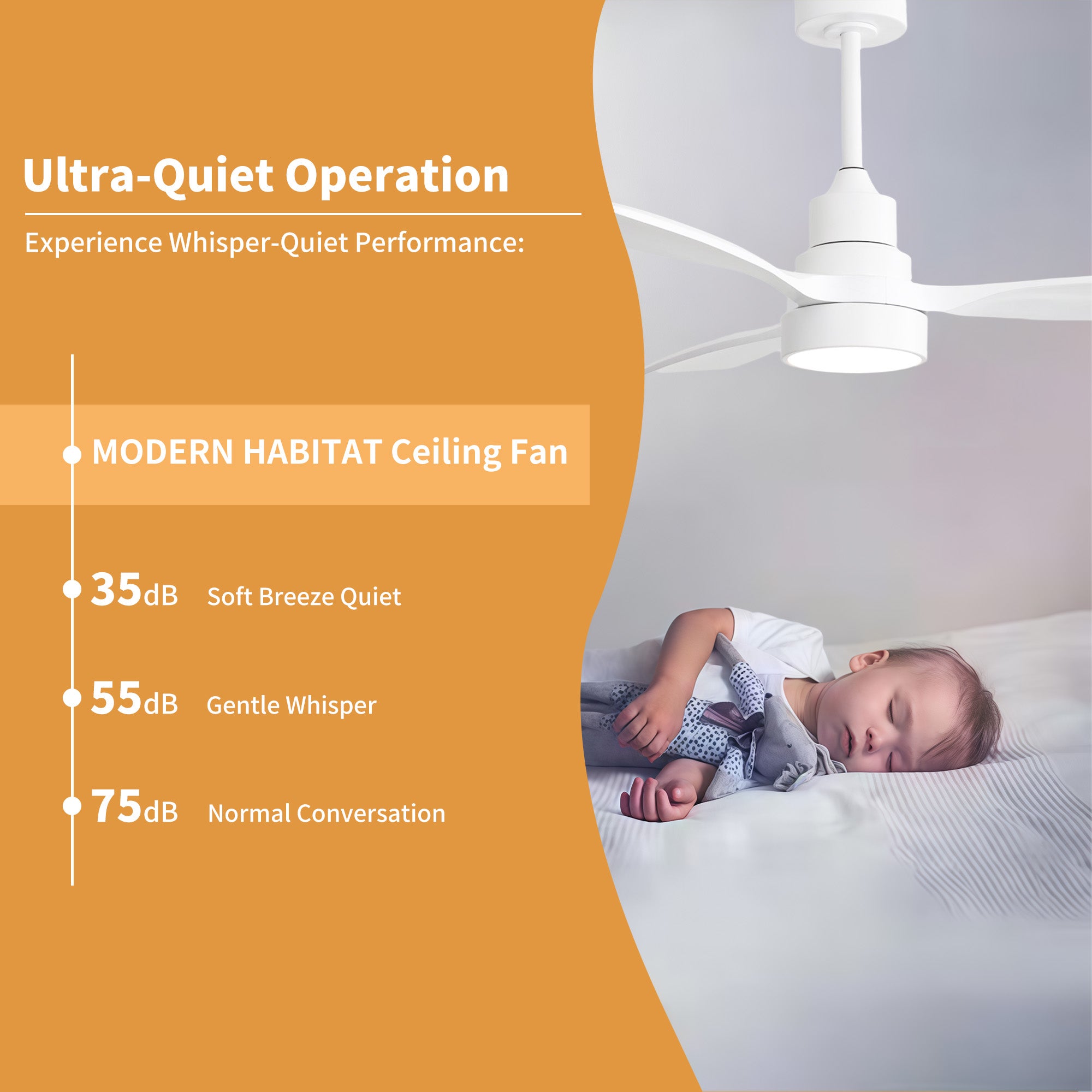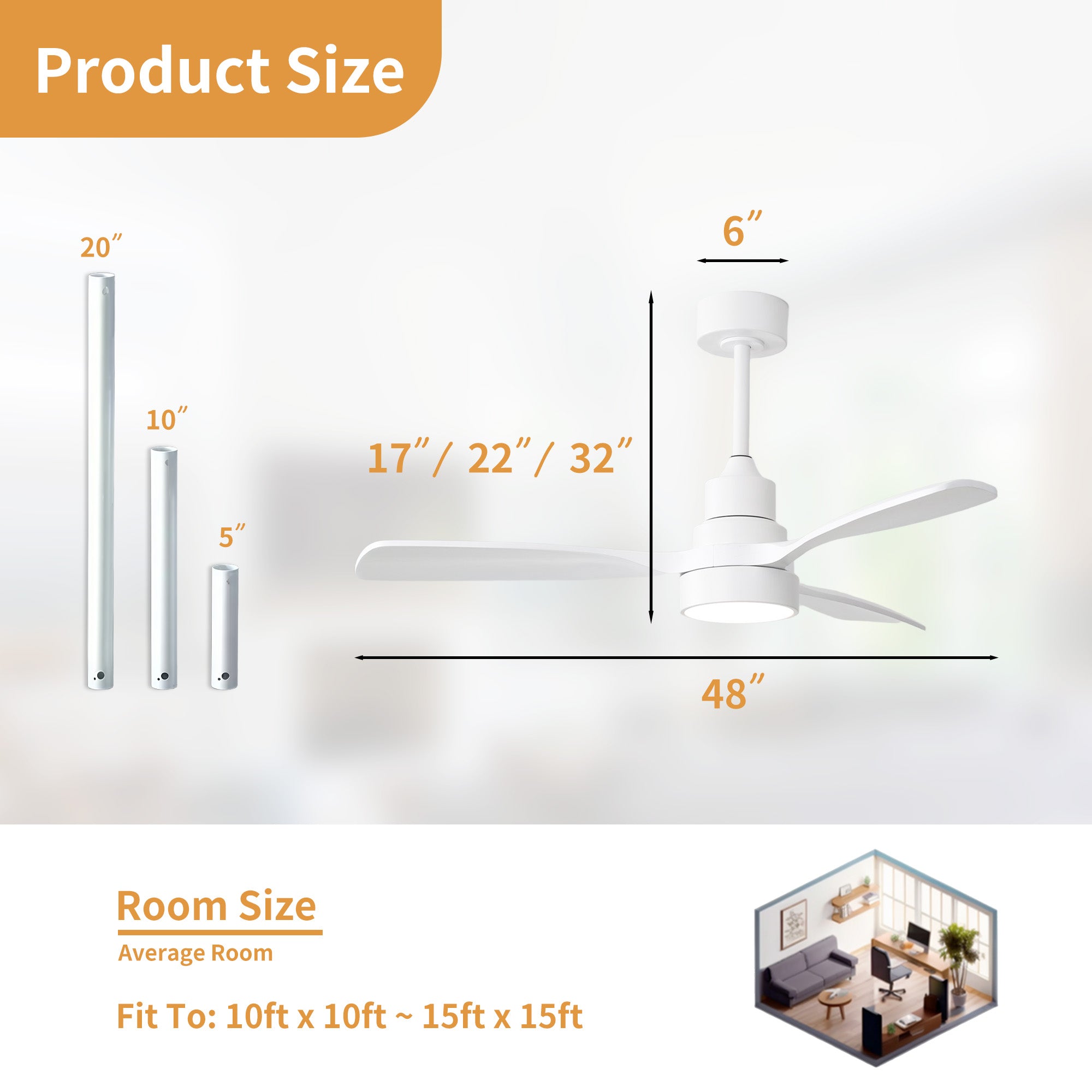 48 in. Indoor White Ceiling Fan with LED Light Refresh your living space, whether indoor or outdoor, this summer, with the AuraVista Collection 48 in. white metal ceiling fan with light from Modern Habitat. The 3 white wood blades feature a modern farmhouse style with a quiet DC motor that provides 6 adjustable speeds and 3 timer settings with remote control. lt comes with dual-mount hardware and 3 downrod sizes (5, 10, and 20 in) to fit spaces from 200-400 sq. ft., from living rooms and kitchens to home office bedrooms, accommodating various ceiling heights from close-mount to high ceiling. The mounting options also allow installation on angled ceilings. The fan features easy-install Quiet Motor technology with reversible direction for seasonal use, auaranteein a minimal noise.