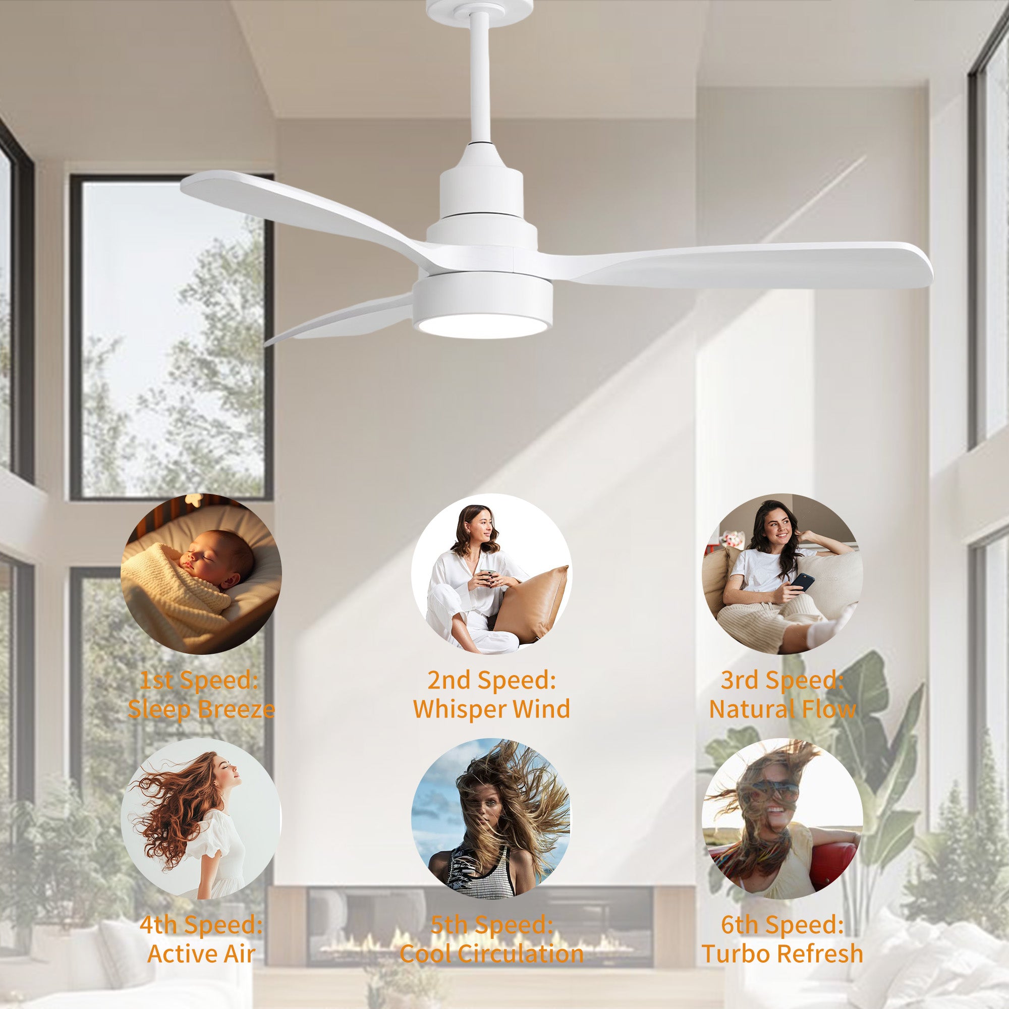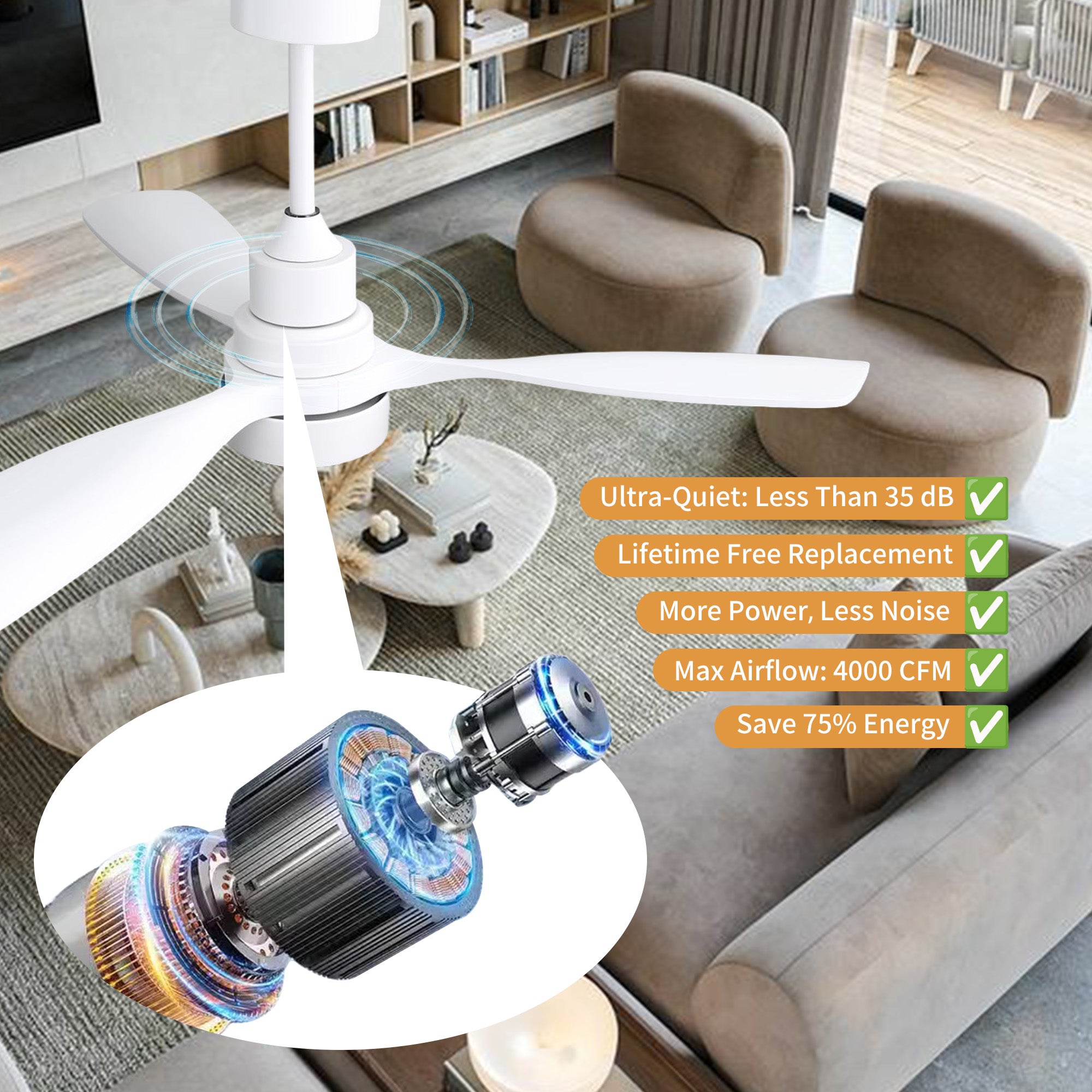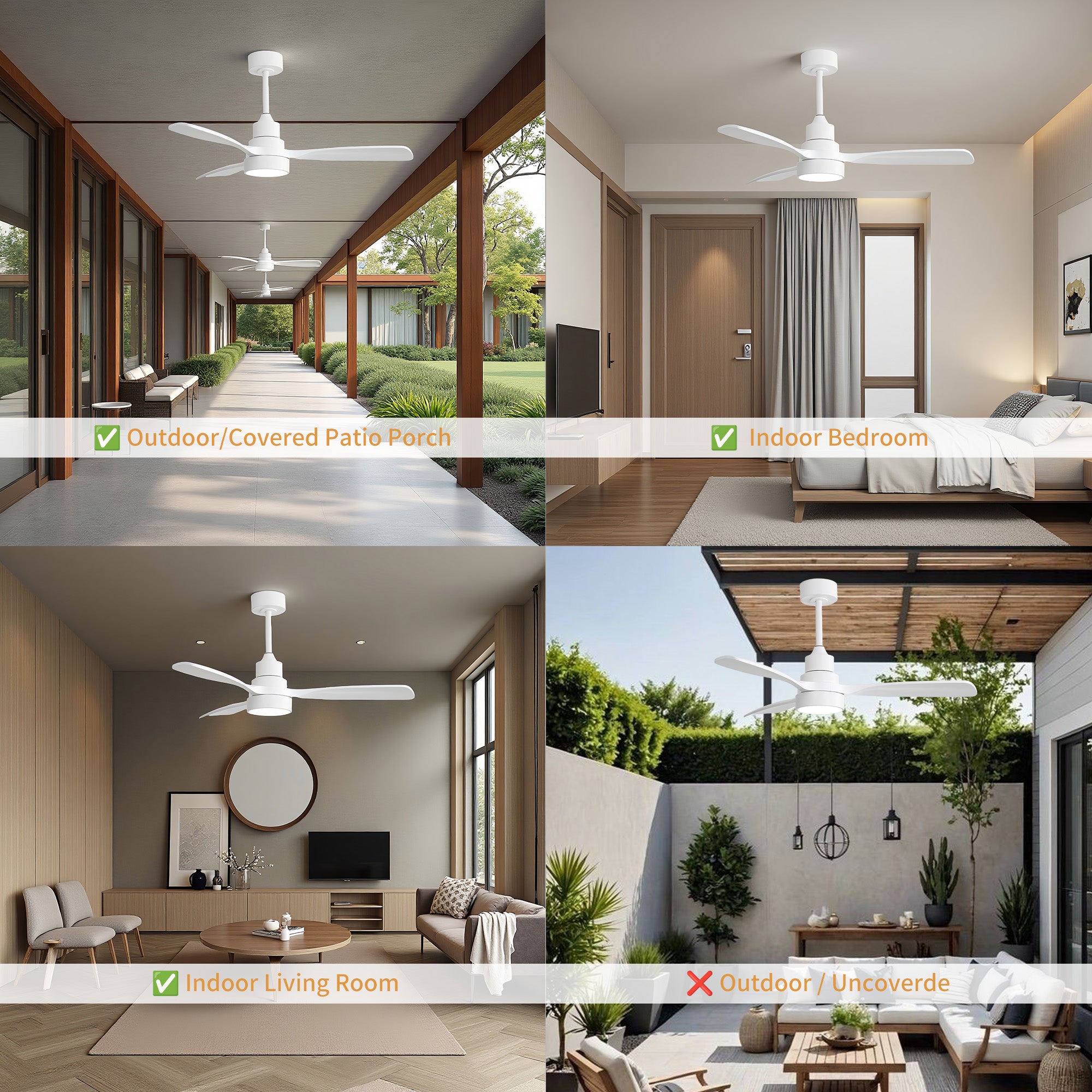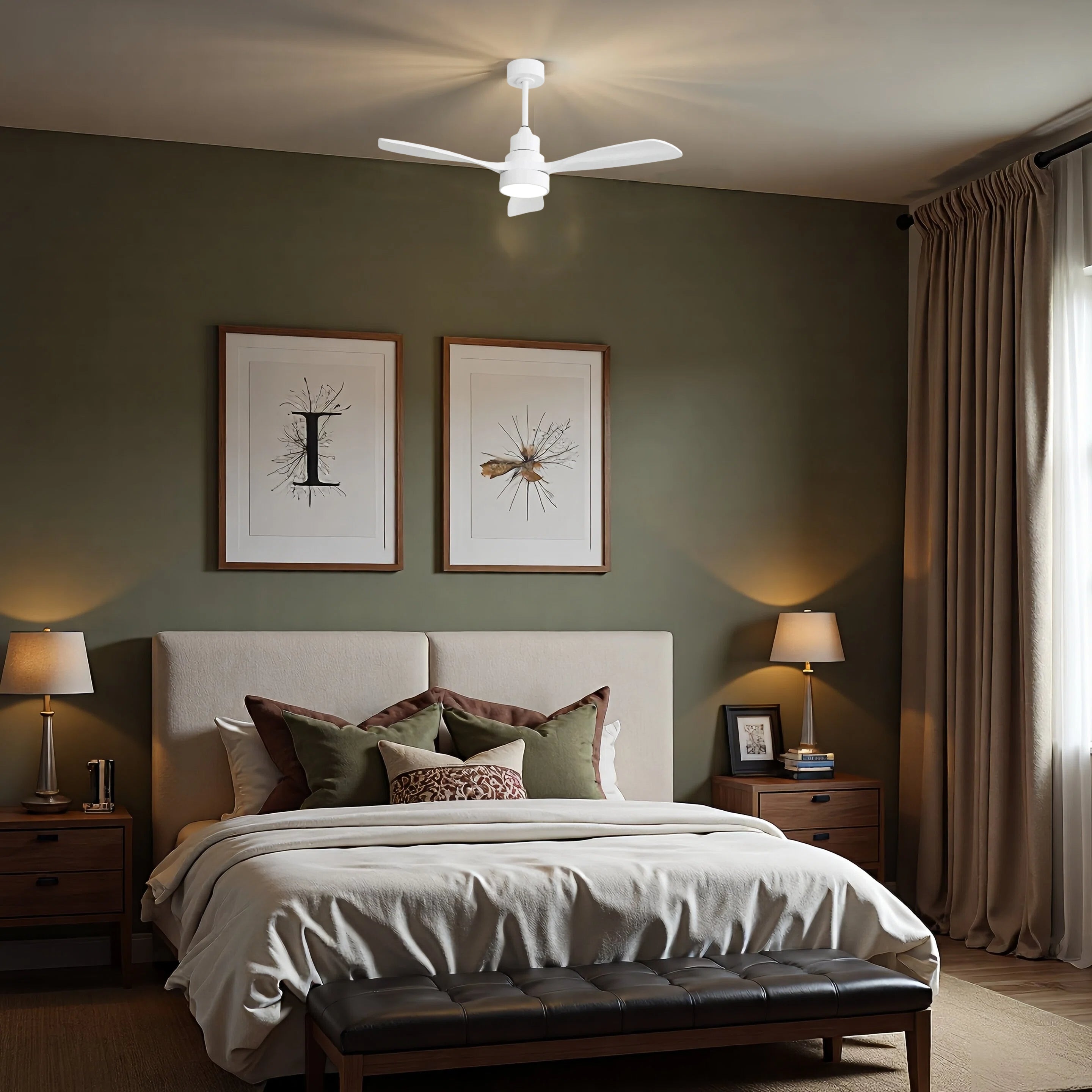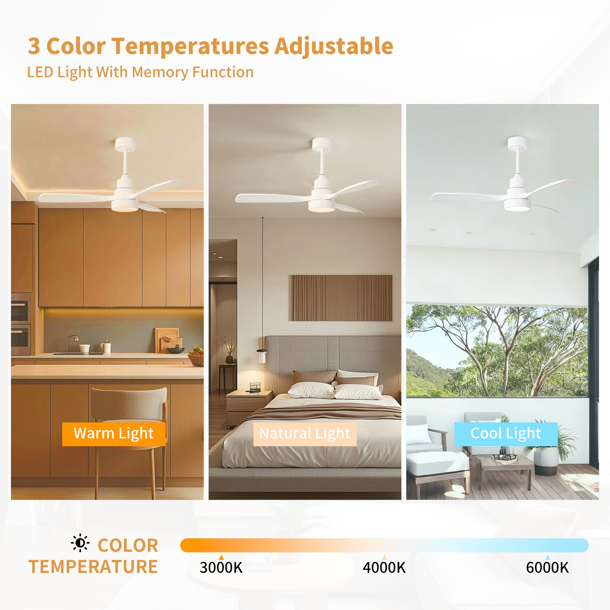 48 in. Indoor White Ceiling Fan with LED Light Refresh your living space, whether indoor or outdoor, this summer, with the AuraVista Collection 48 in. white metal ceiling fan with light from Modern Habitat. The 3 white wood blades feature a modern farmhouse style with a quiet DC motor that provides 6 adjustable speeds and 3 timer settings with remote control. lt comes with dual-mount hardware and 3 downrod sizes (5, 10, and 20 in) to fit spaces from 200-400 sq. ft., from living rooms and kitchens to home office bedrooms, accommodating various ceiling heights from close-mount to high ceiling. The mounting options also allow installation on angled ceilings. The fan features easy-install Quiet Motor technology with reversible direction for seasonal use, auaranteein a minimal noise.