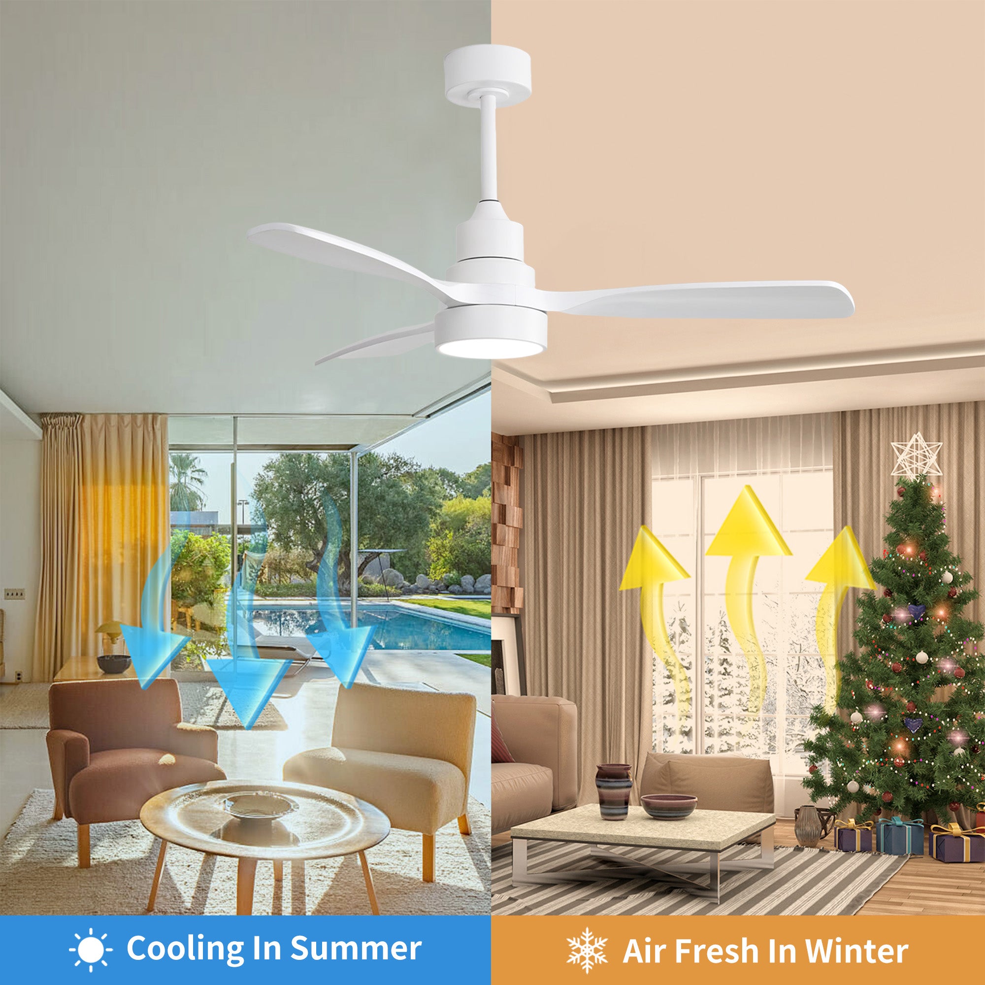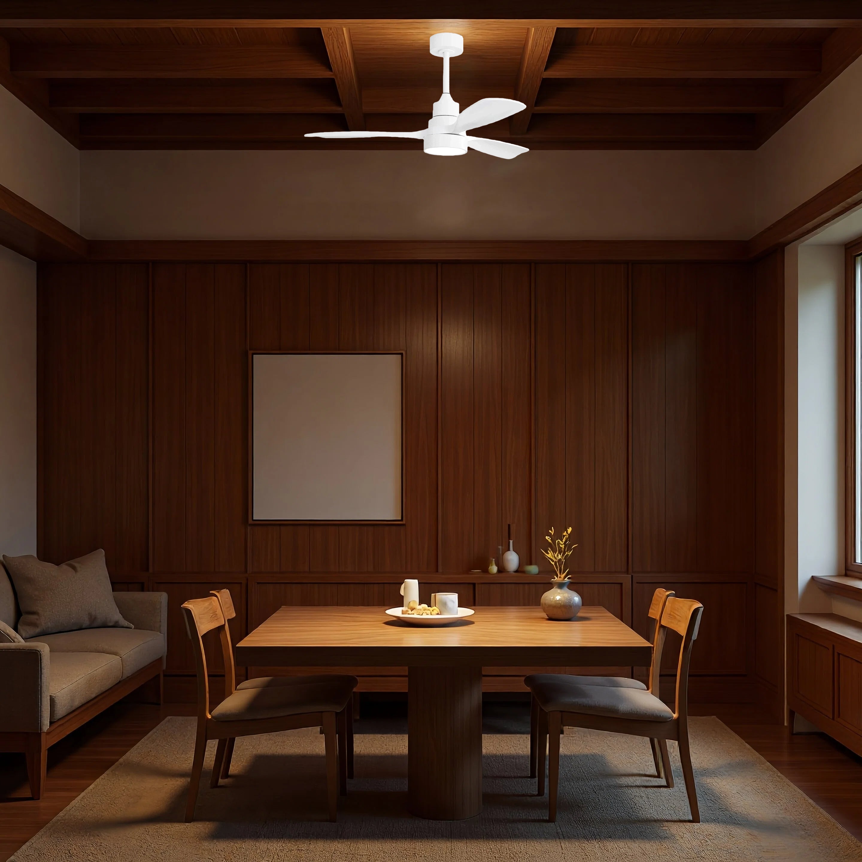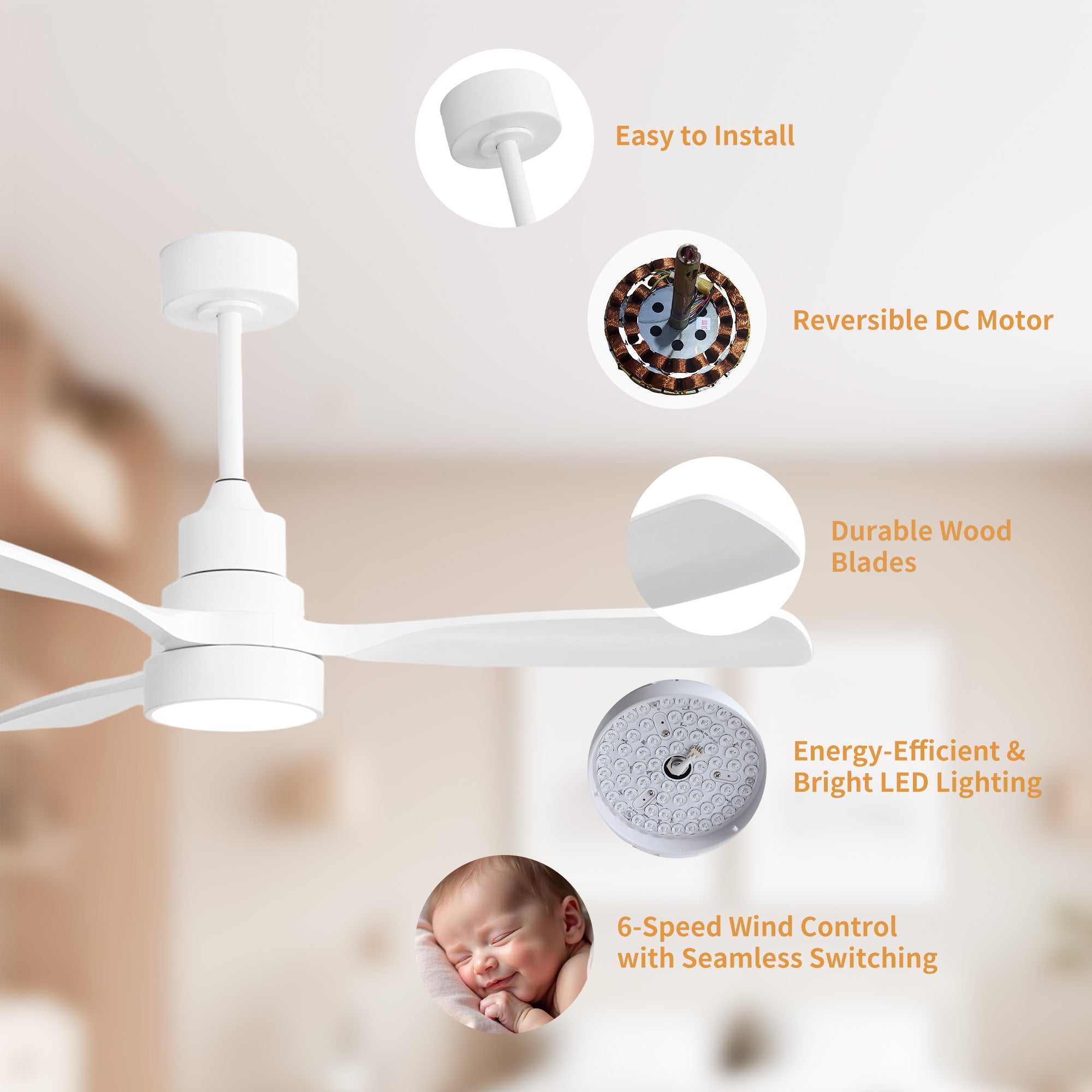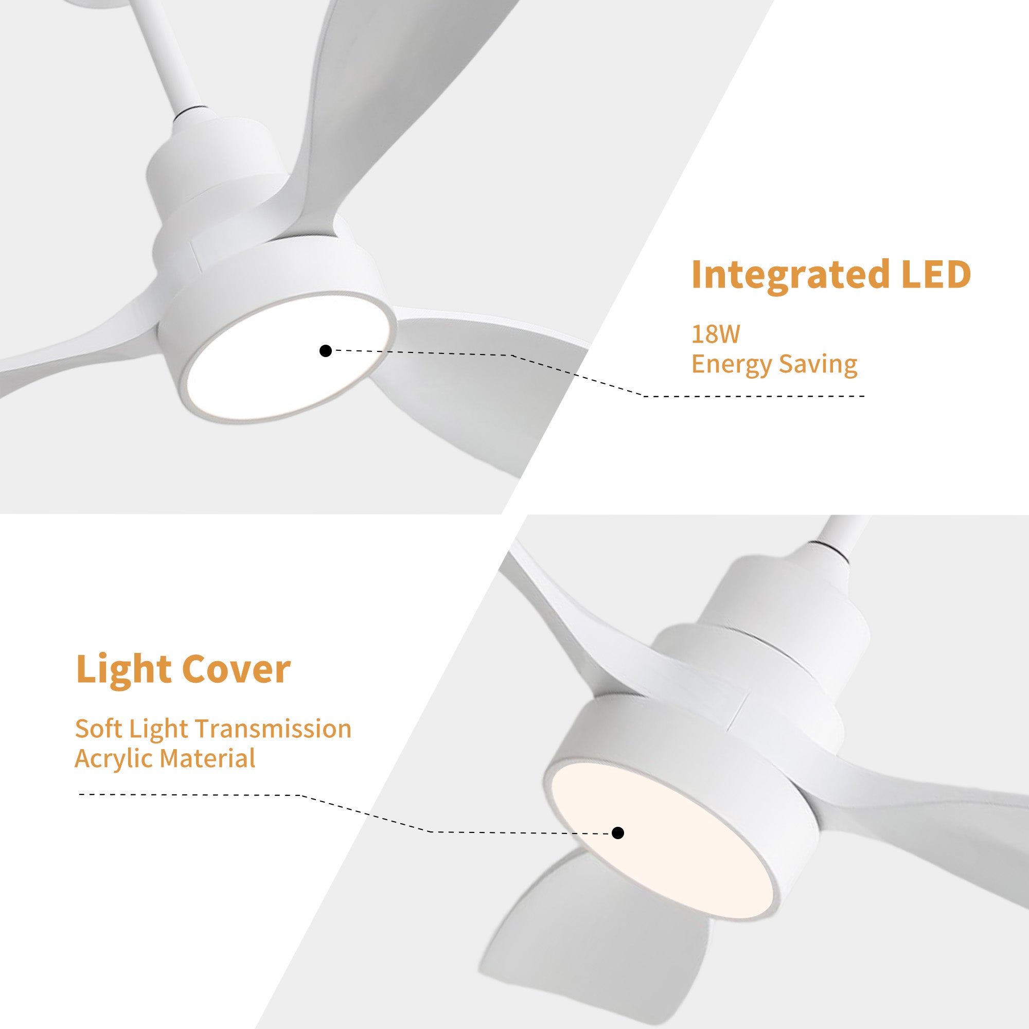 48 in. Indoor White Ceiling Fan with LED Light Refresh your living space, whether indoor or outdoor, this summer, with the AuraVista Collection 48 in. white metal ceiling fan with light from Modern Habitat. The 3 white wood blades feature a modern farmhouse style with a quiet DC motor that provides 6 adjustable speeds and 3 timer settings with remote control. lt comes with dual-mount hardware and 3 downrod sizes (5, 10, and 20 in) to fit spaces from 200-400 sq. ft., from living rooms and kitchens to home office bedrooms, accommodating various ceiling heights from close-mount to high ceiling. The mounting options also allow installation on angled ceilings. The fan features easy-install Quiet Motor technology with reversible direction for seasonal use, auaranteein a minimal noise.