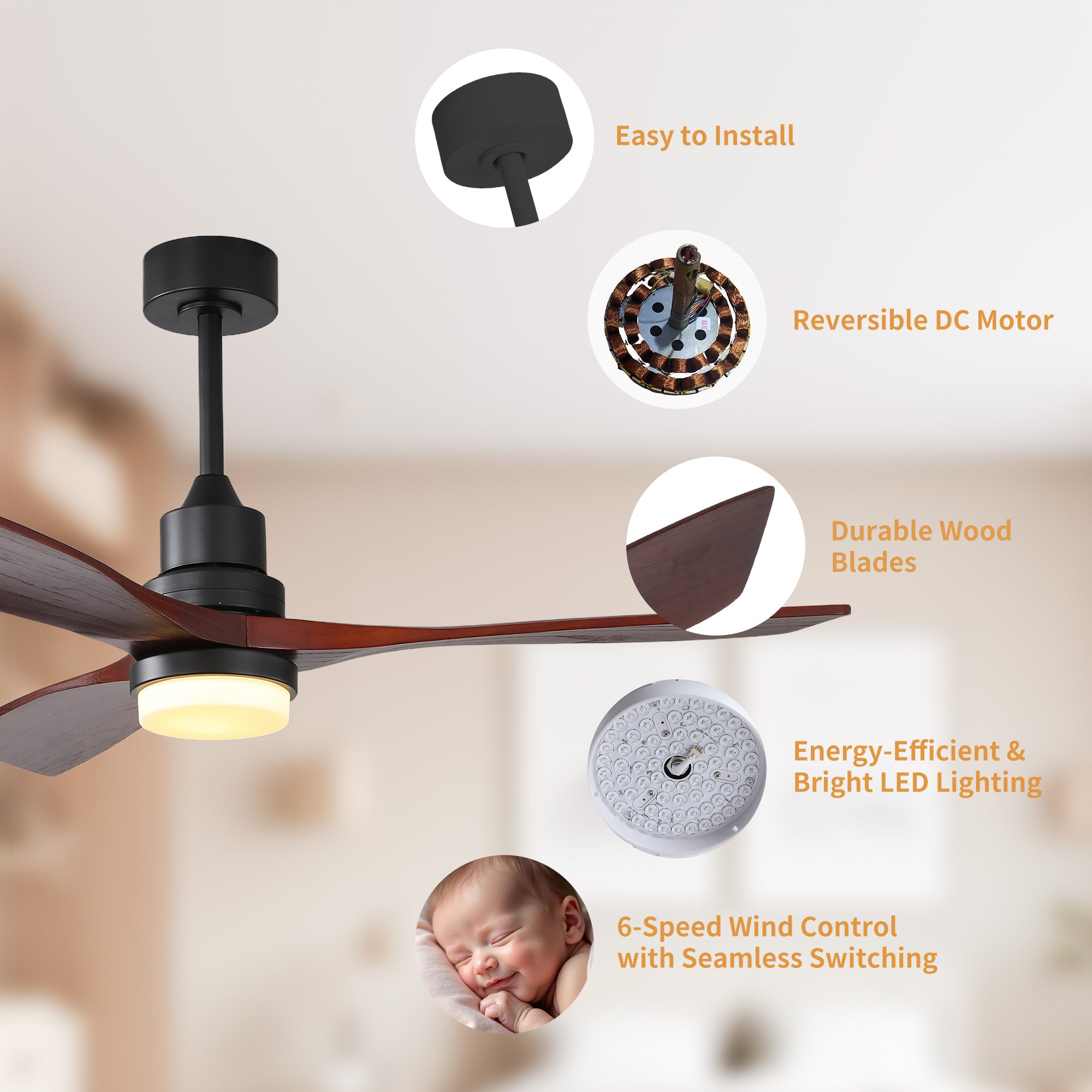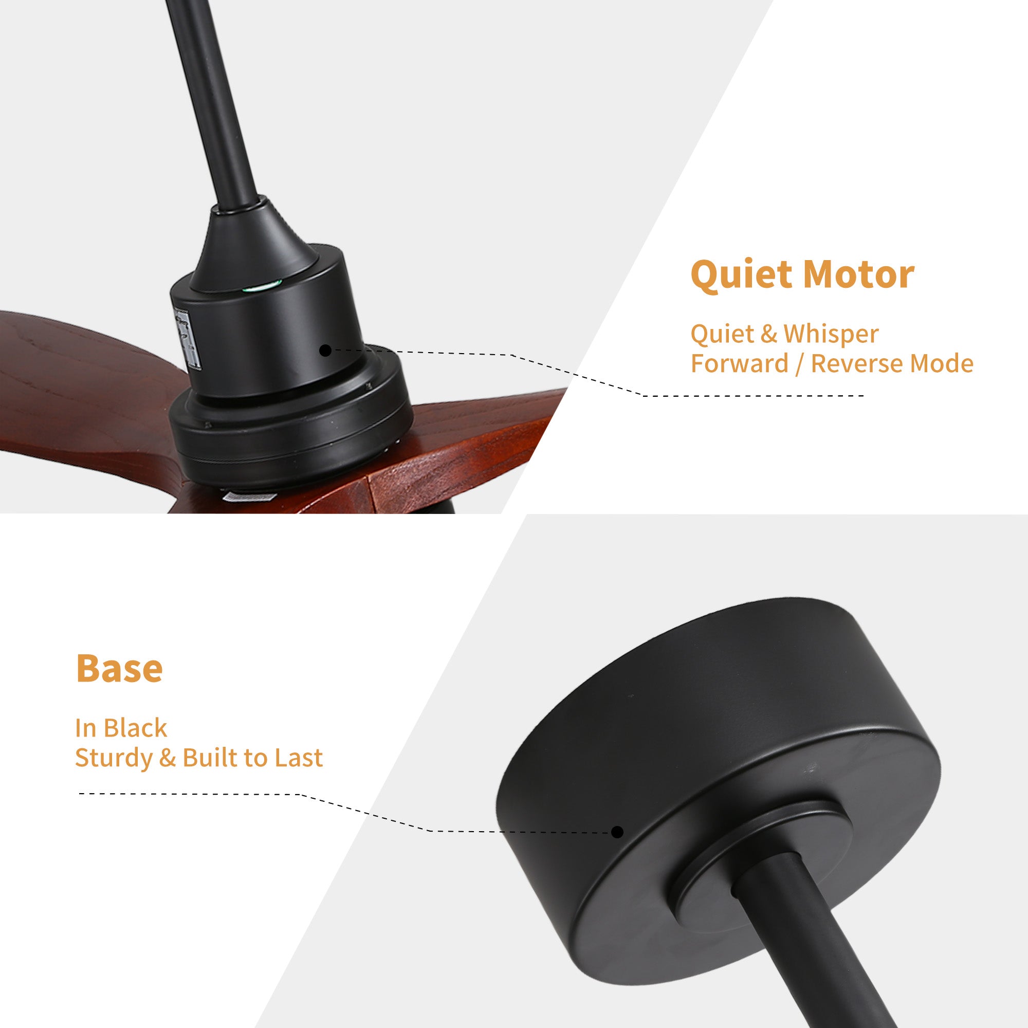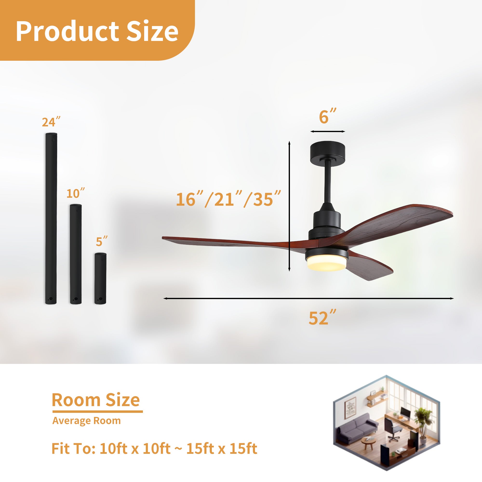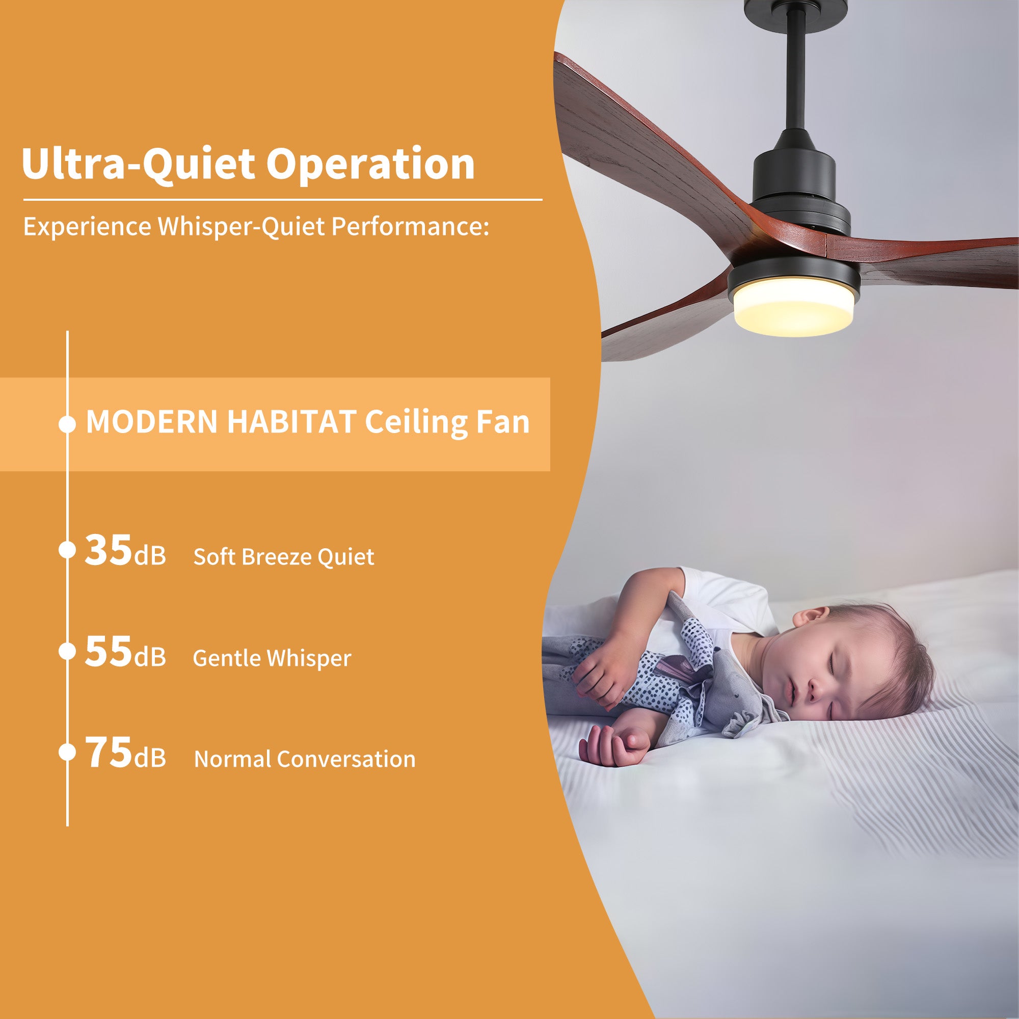 This Indoor Black Ceiling Fan with Light Refresh your living space, whether indoor or outdoor, this summer, with the AuraVista Collection 52 in. Natural Matte Black ceiling fan with light from Modern Habitat. The 3 natural brown wood blades feature a modern farmhouse style with a quiet DC motor that provides 6 adjustable speeds and timer settings with remote control. lt comes with dual-mount hardware and 3 downrod sizes (5, 10, and 24 in) to fit spaces from 200-400 sq. ft., from living rooms and kitchens to home office bedrooms, accommodating various ceiling heights from close-mount to high ceiling. The mounting options also allow installation on angled ceilings. The fan features easy-install Quiet Motor technology with reversible direction for seasonal use, auaranteein a minimal noise. Our warranty policy is a 2-year warranty for accessories.