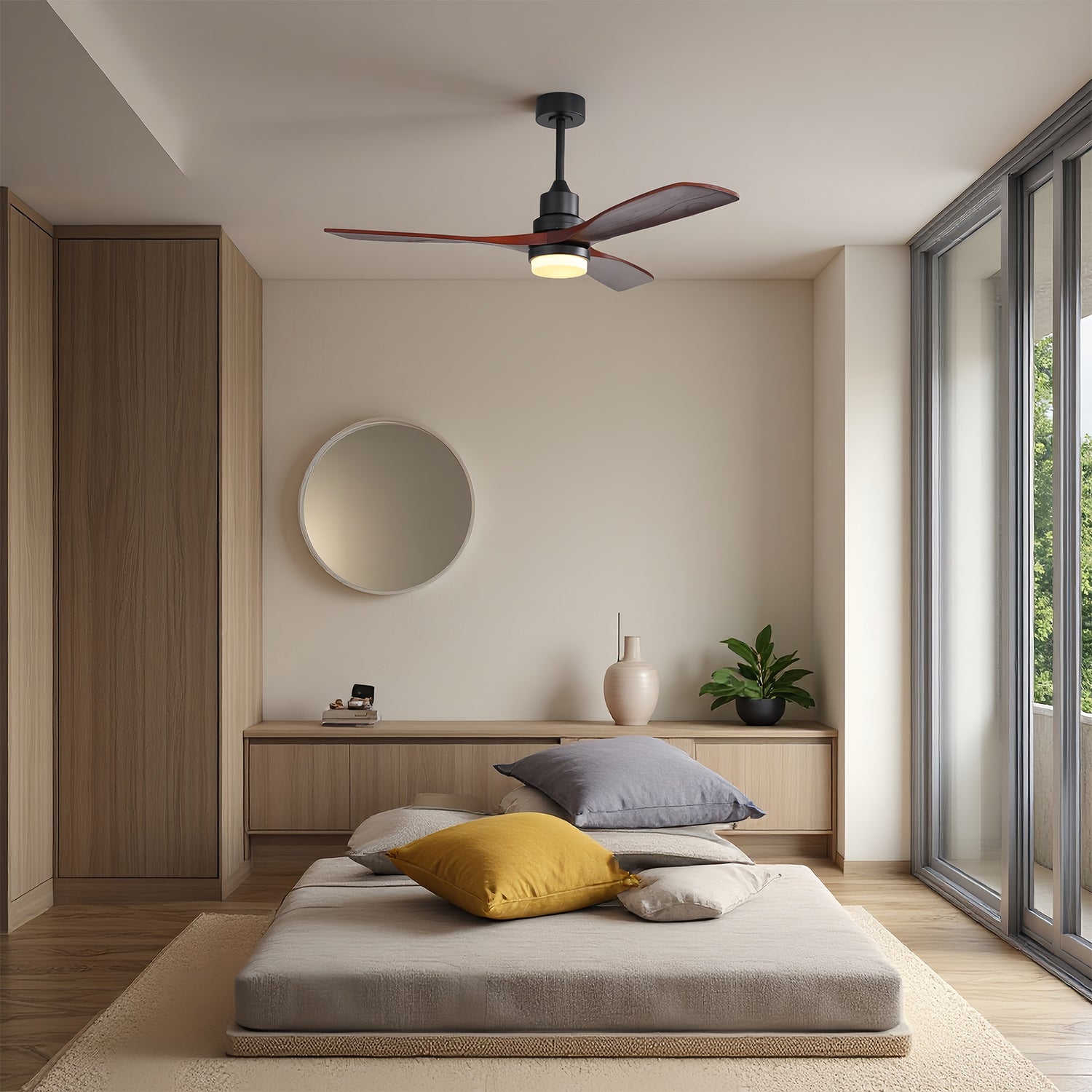 - 52 in. ceiling fan with natural brown wood blades and natural matte black housing finish