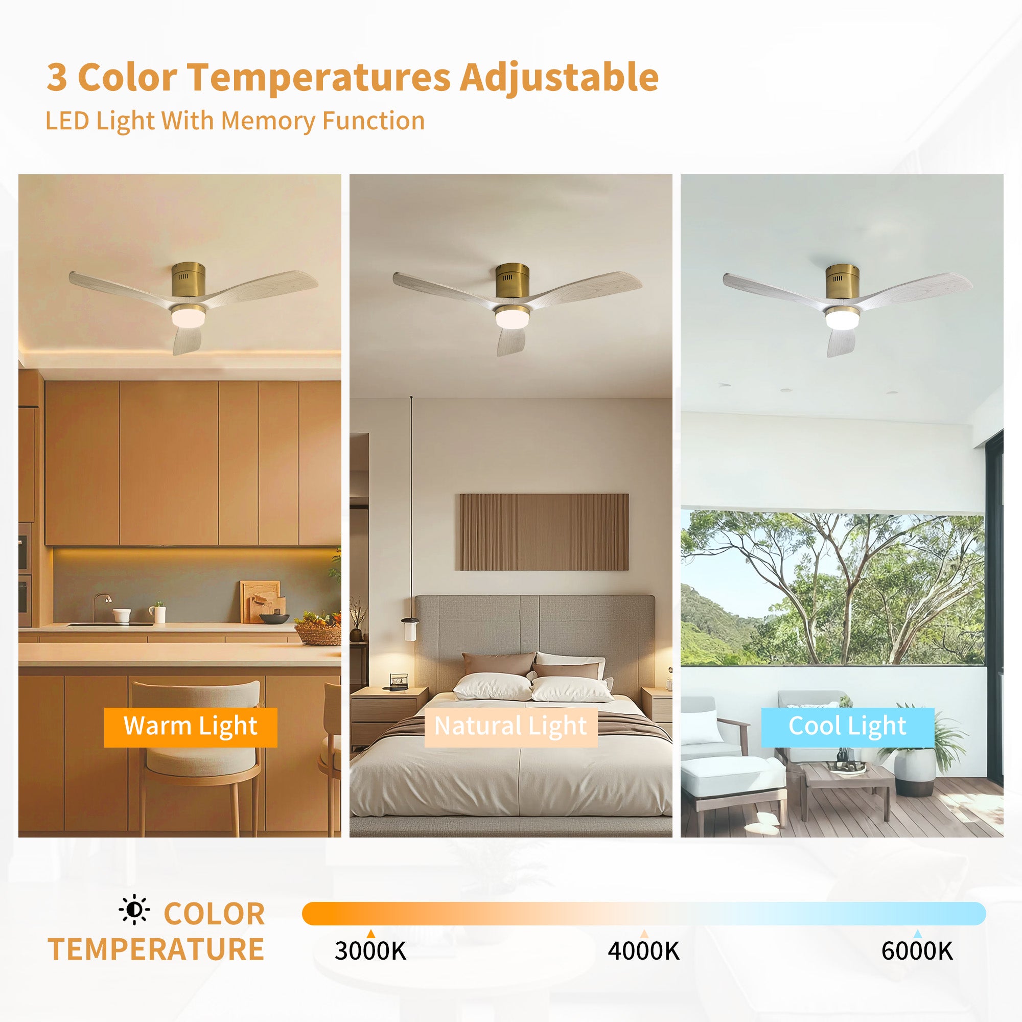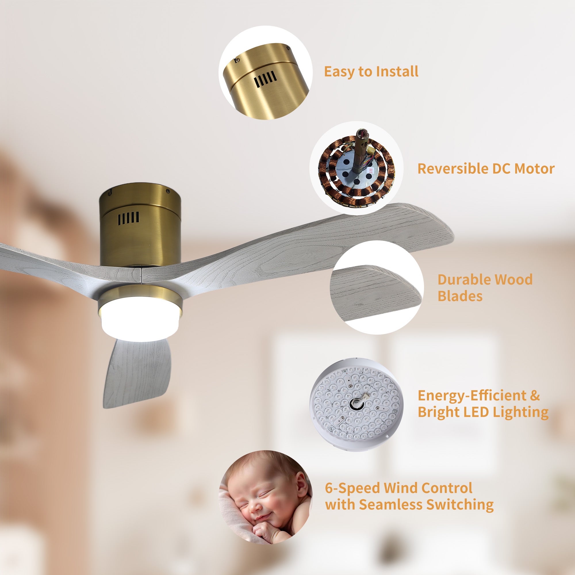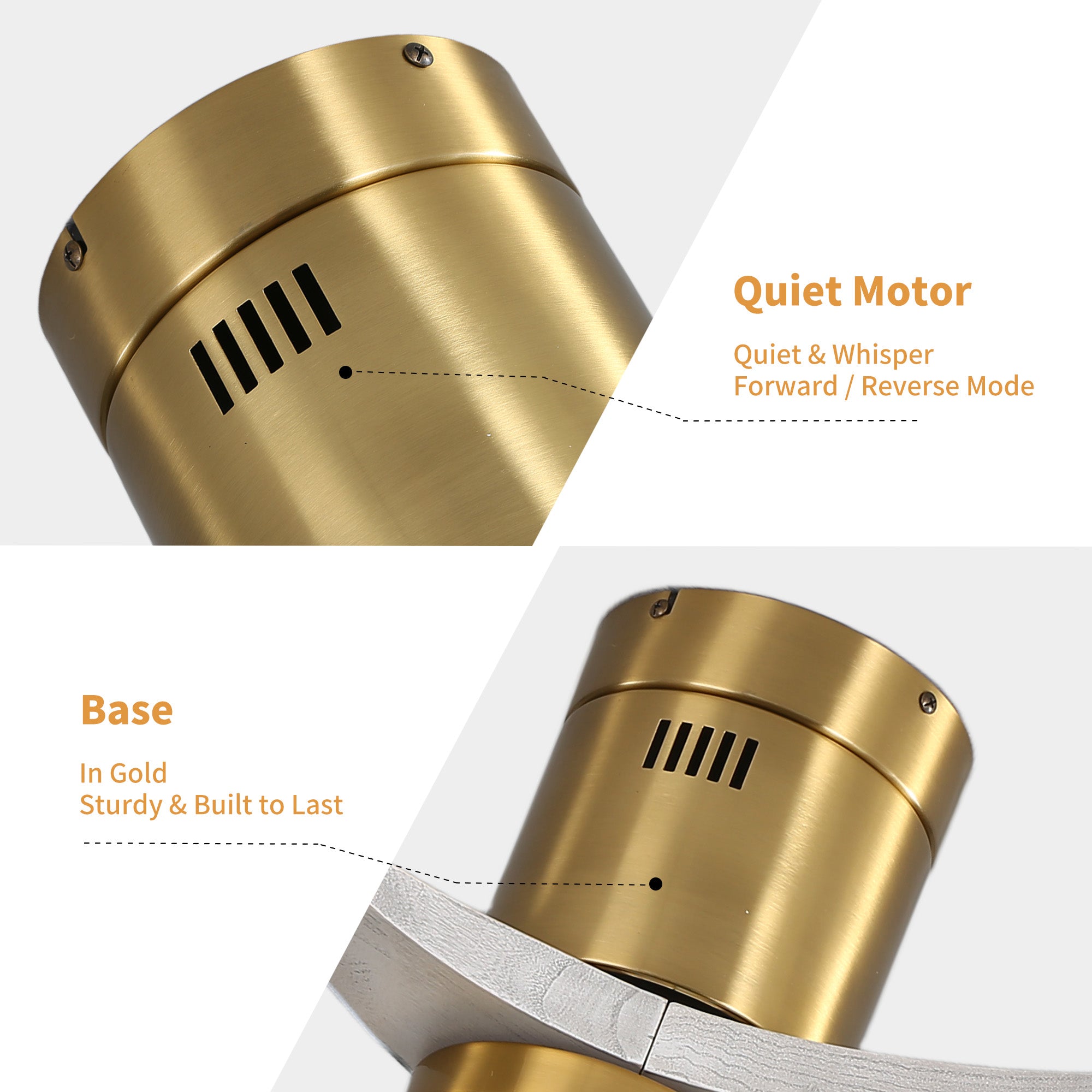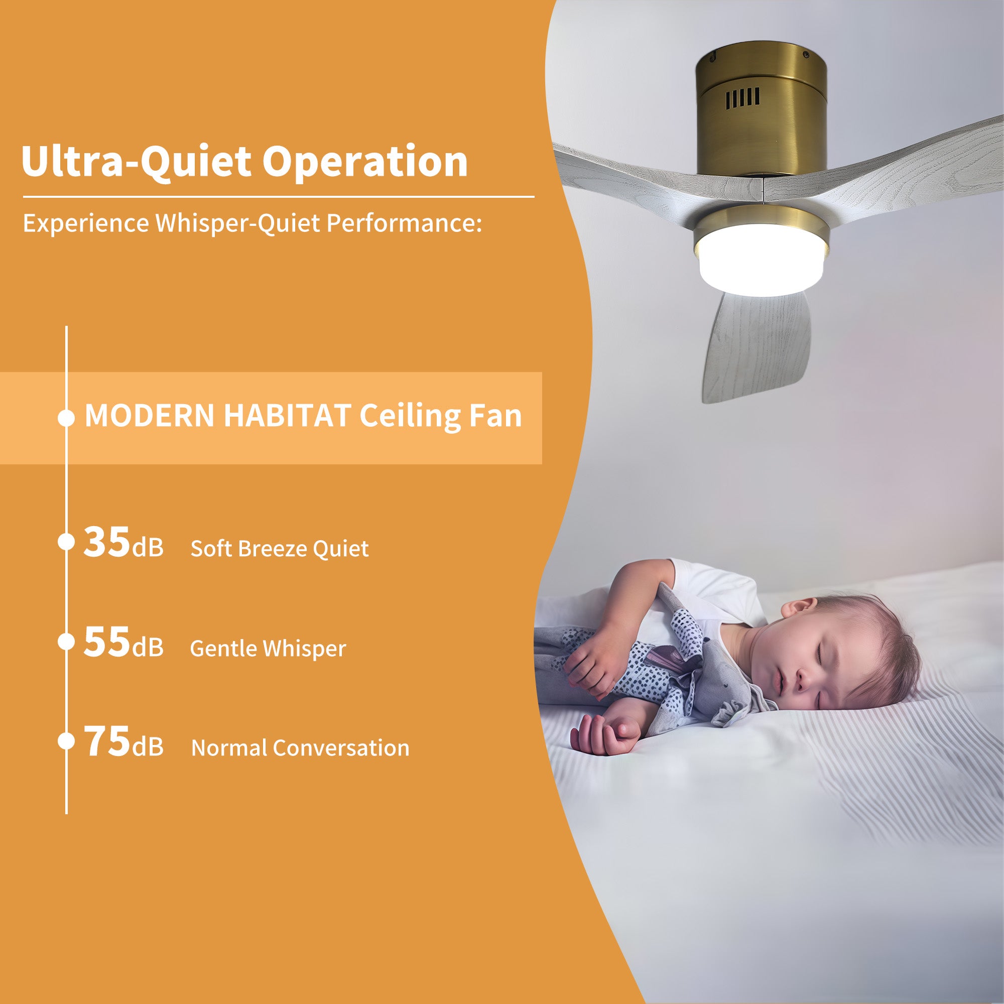 Enjoy your summer with the SerenityShine 52 in. Gold Metal ceiling fan with light-aquiet, flush-mount design from MODERN HABITAT Inc. The 3 wood blades feature amodern farmhouse style with a quiet DC motor that provides 6 adjustable speeds and 3 timeisettings with remote control. With a 11.14 in. height and 6.88 in. footprint, it providesample airflow for spaces between 200-400 sq. ft., perfect for living rooms, kitchens, and homoffice bedrooms-ideal for compact spaces. The fan features easy-install Quiet Motor technology with 2 airflow modes, quaranteeing minimal noise.