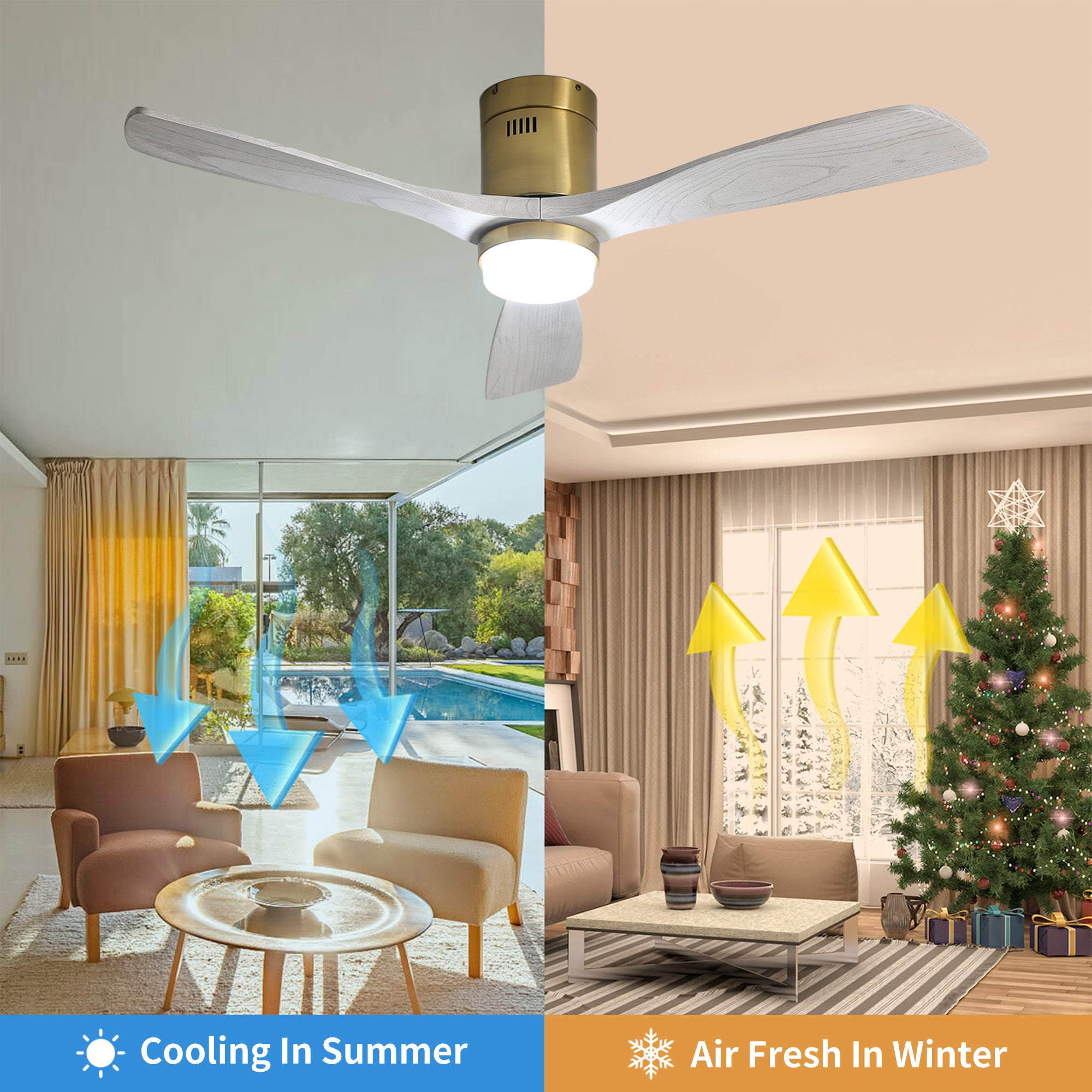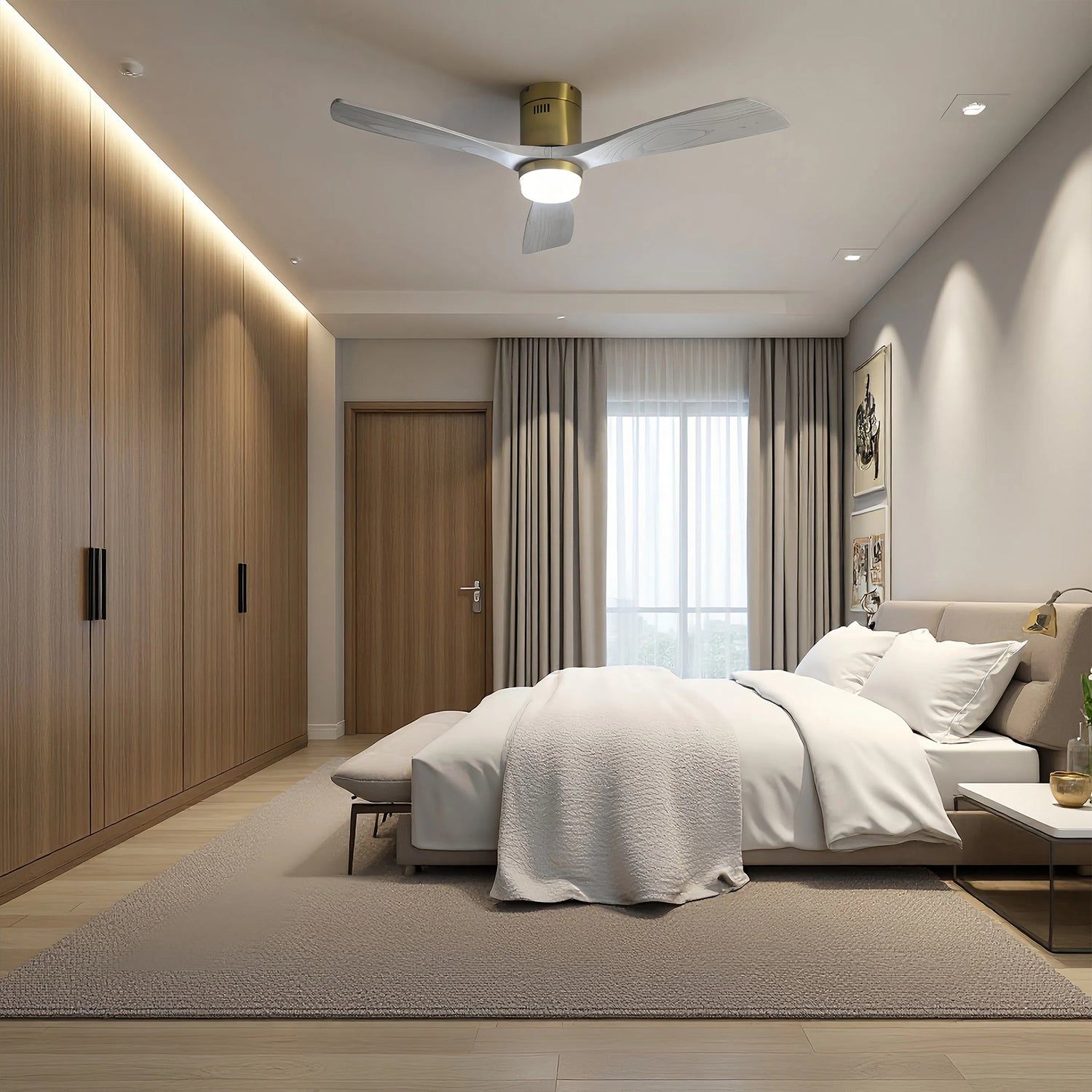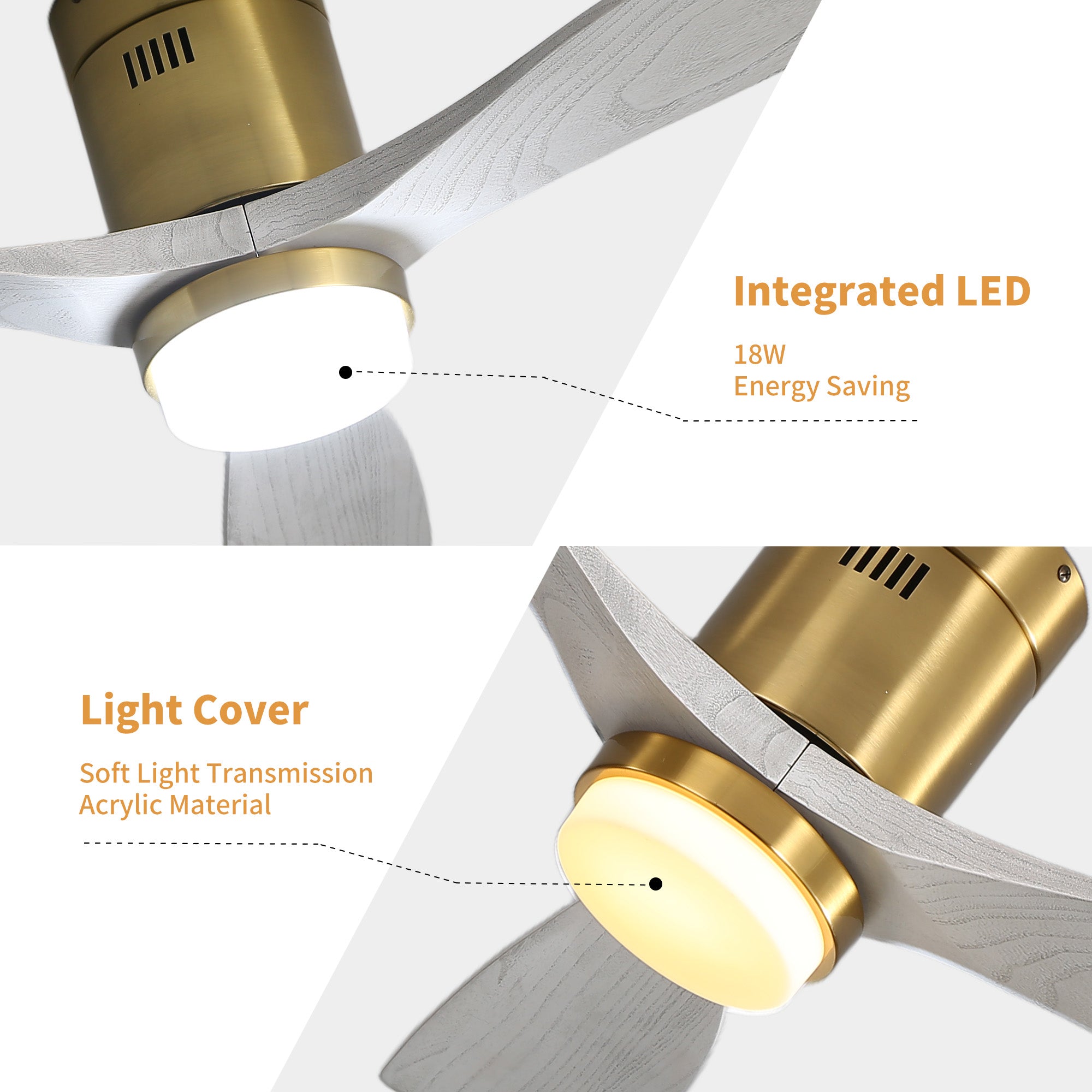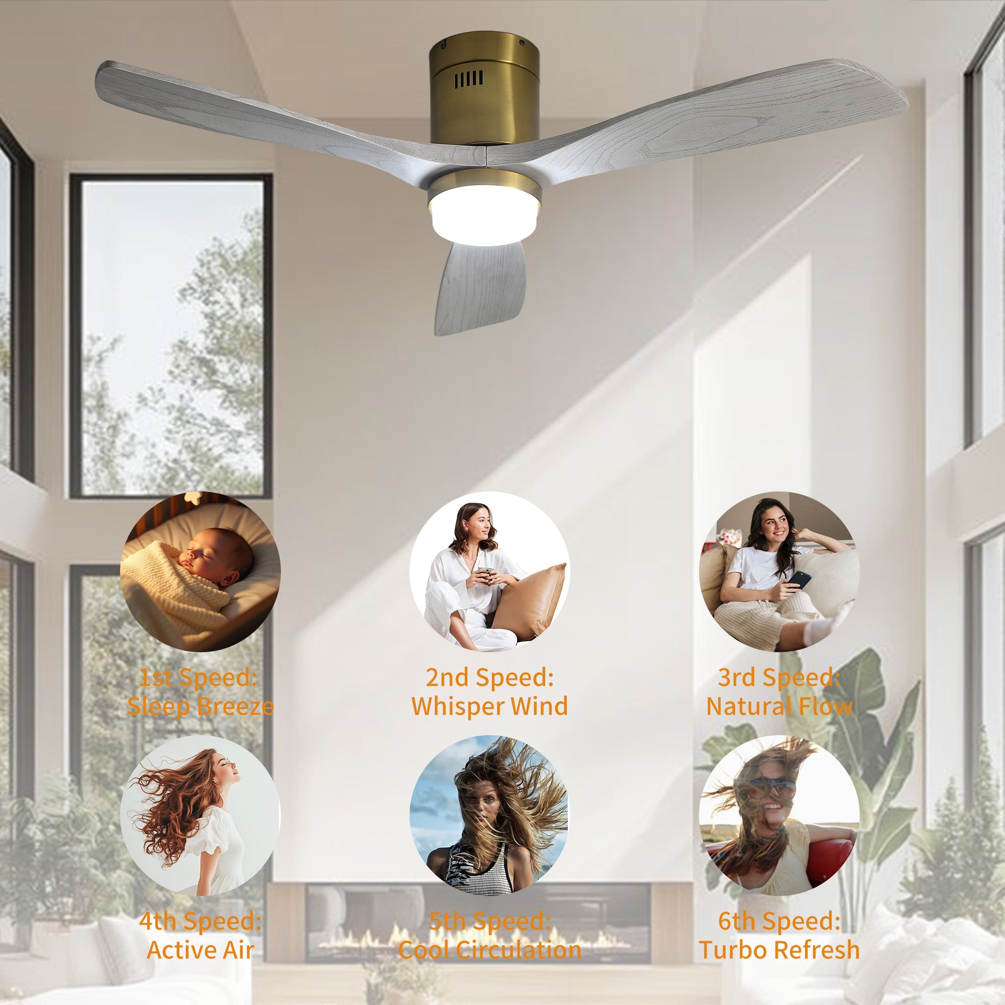 Enjoy your summer with the SerenityShine 52 in. Gold Metal ceiling fan with light-aquiet, flush-mount design from MODERN HABITAT Inc. The 3 wood blades feature amodern farmhouse style with a quiet DC motor that provides 6 adjustable speeds and 3 timeisettings with remote control. With a 11.14 in. height and 6.88 in. footprint, it providesample airflow for spaces between 200-400 sq. ft., perfect for living rooms, kitchens, and homoffice bedrooms-ideal for compact spaces. The fan features easy-install Quiet Motor technology with 2 airflow modes, quaranteeing minimal noise.