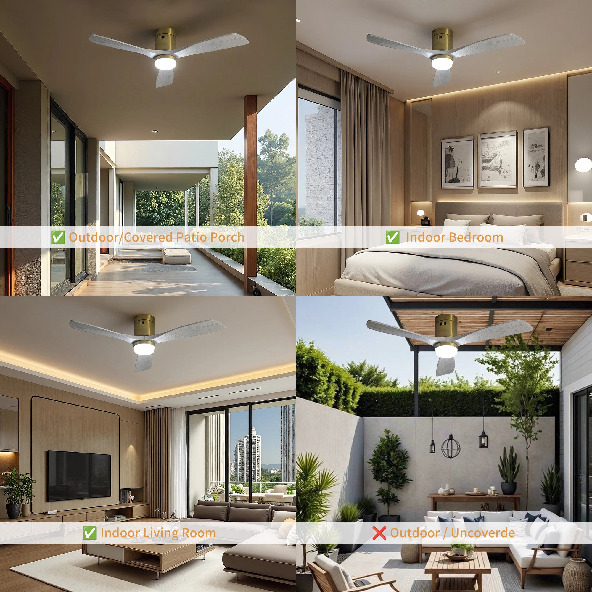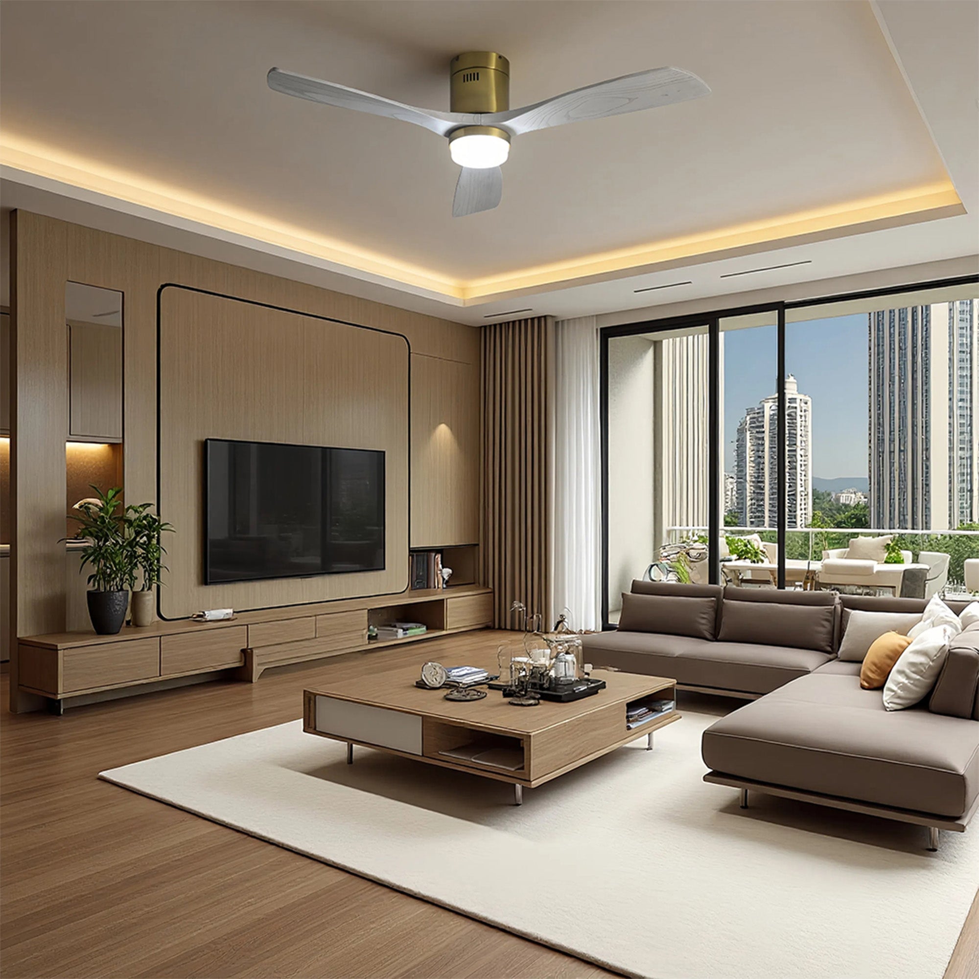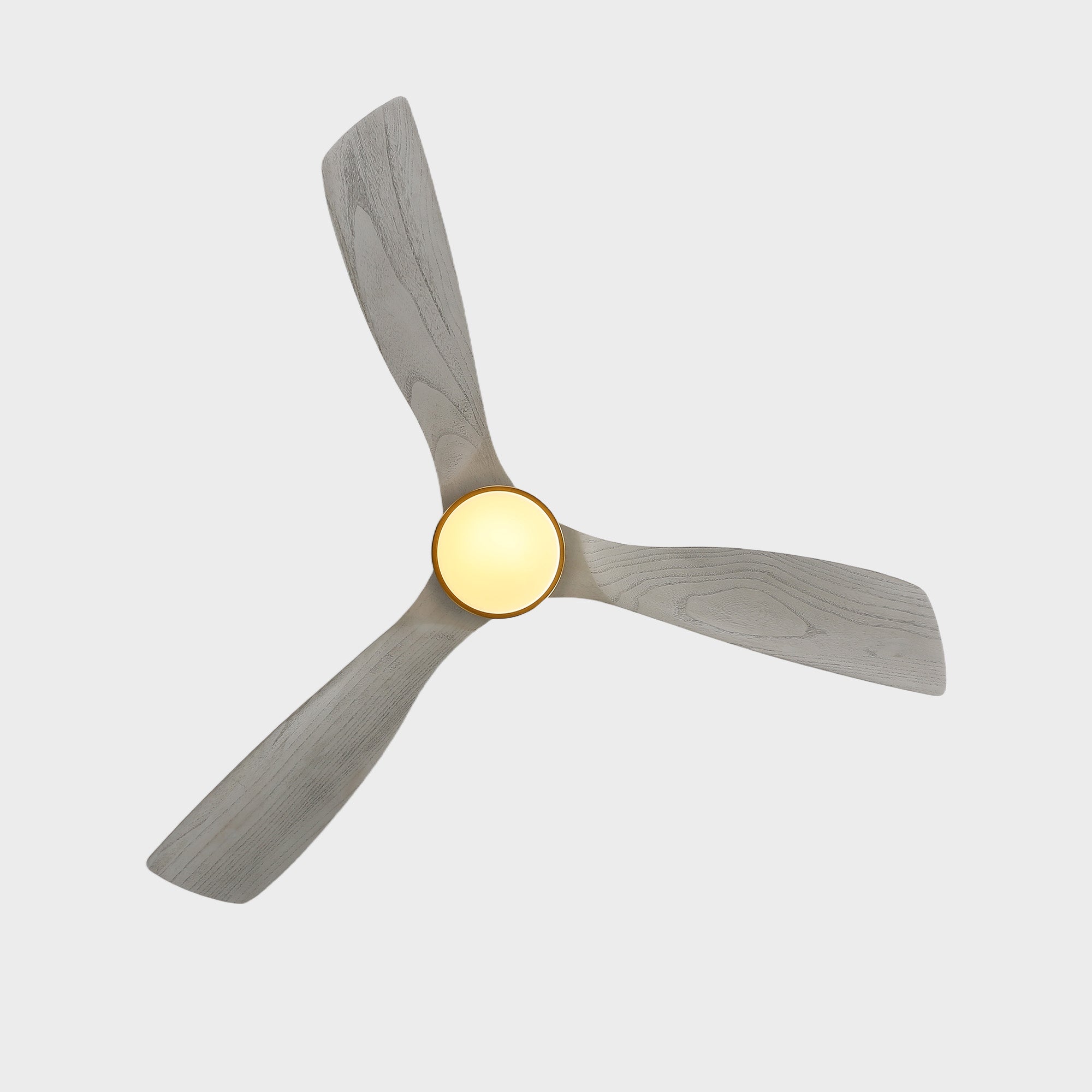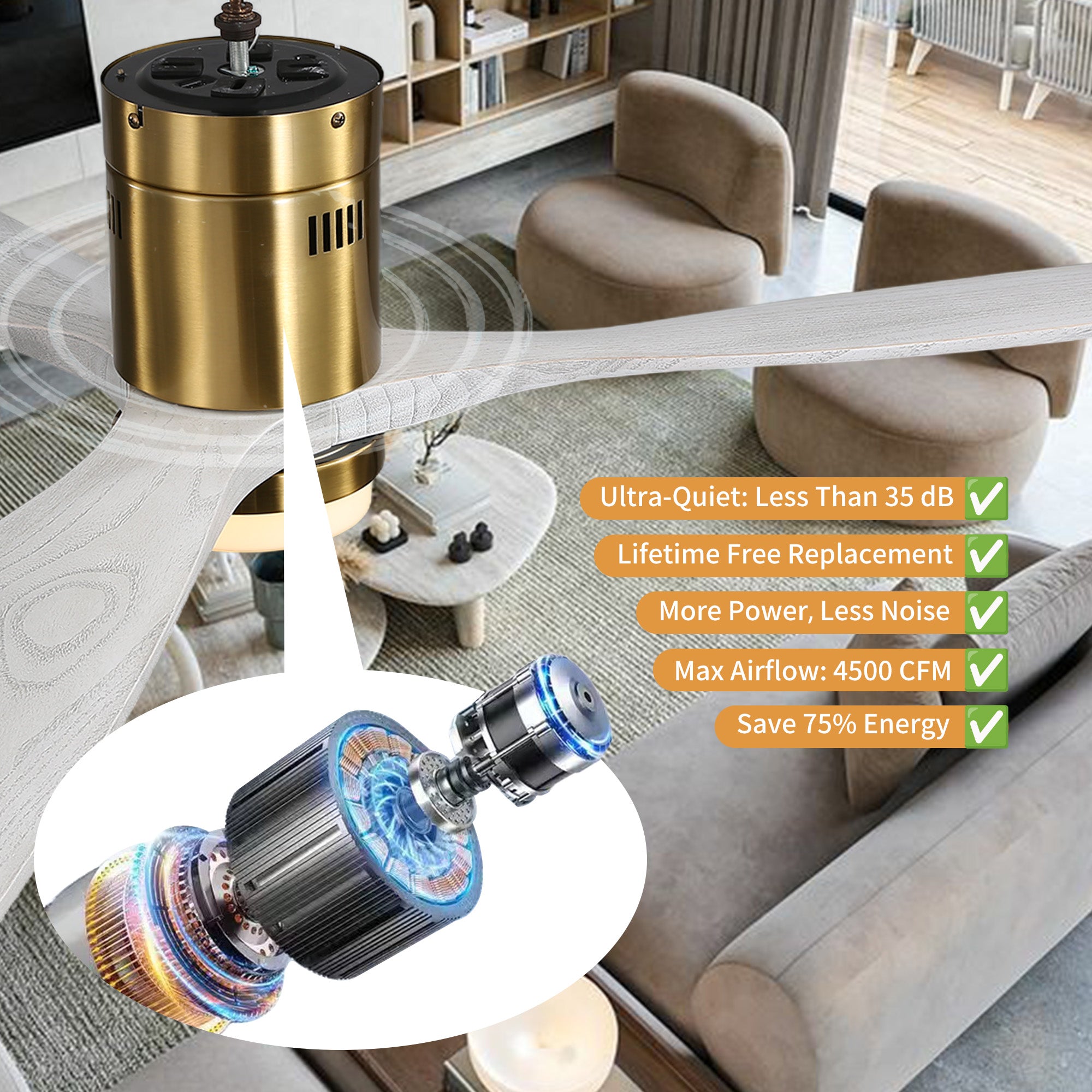 Enjoy your summer with the SerenityShine 52 in. Gold Metal ceiling fan with light-aquiet, flush-mount design from MODERN HABITAT Inc. The 3 wood blades feature amodern farmhouse style with a quiet DC motor that provides 6 adjustable speeds and 3 timeisettings with remote control. With a 11.14 in. height and 6.88 in. footprint, it providesample airflow for spaces between 200-400 sq. ft., perfect for living rooms, kitchens, and homoffice bedrooms-ideal for compact spaces. The fan features easy-install Quiet Motor technology with 2 airflow modes, quaranteeing minimal noise.