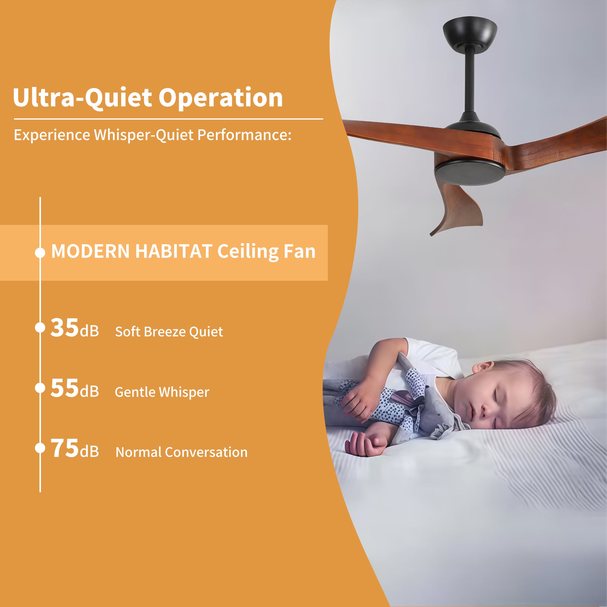 Stay warm and comfortable all winter with the 52 in. Black Metal ceiling fan with light from Modern Habitat.Featuring three solid wood blades with a reverse function that provides a winter ceiling fan setting mode, and comes with a remote control.The minimal design fits interiors that present both traditional and modern American lifestyles.The fan features easy-install Quiet Motor technology with three airflow modes, guaranteeing minimal noise. A quiet DC motor provides six adjustable speeds and three timer settings.It comes with a 5, 10 and 24 in. downrod to fit spaces from 200-400 square feet - from living rooms and kitchens to home offices and bedrooms - accommodating various ceiling heights from open-mount to high ceilings.The mounting options also allow installation on angled ceilings up to 15° to help improve air circulation and enhance your holiday home living experience.