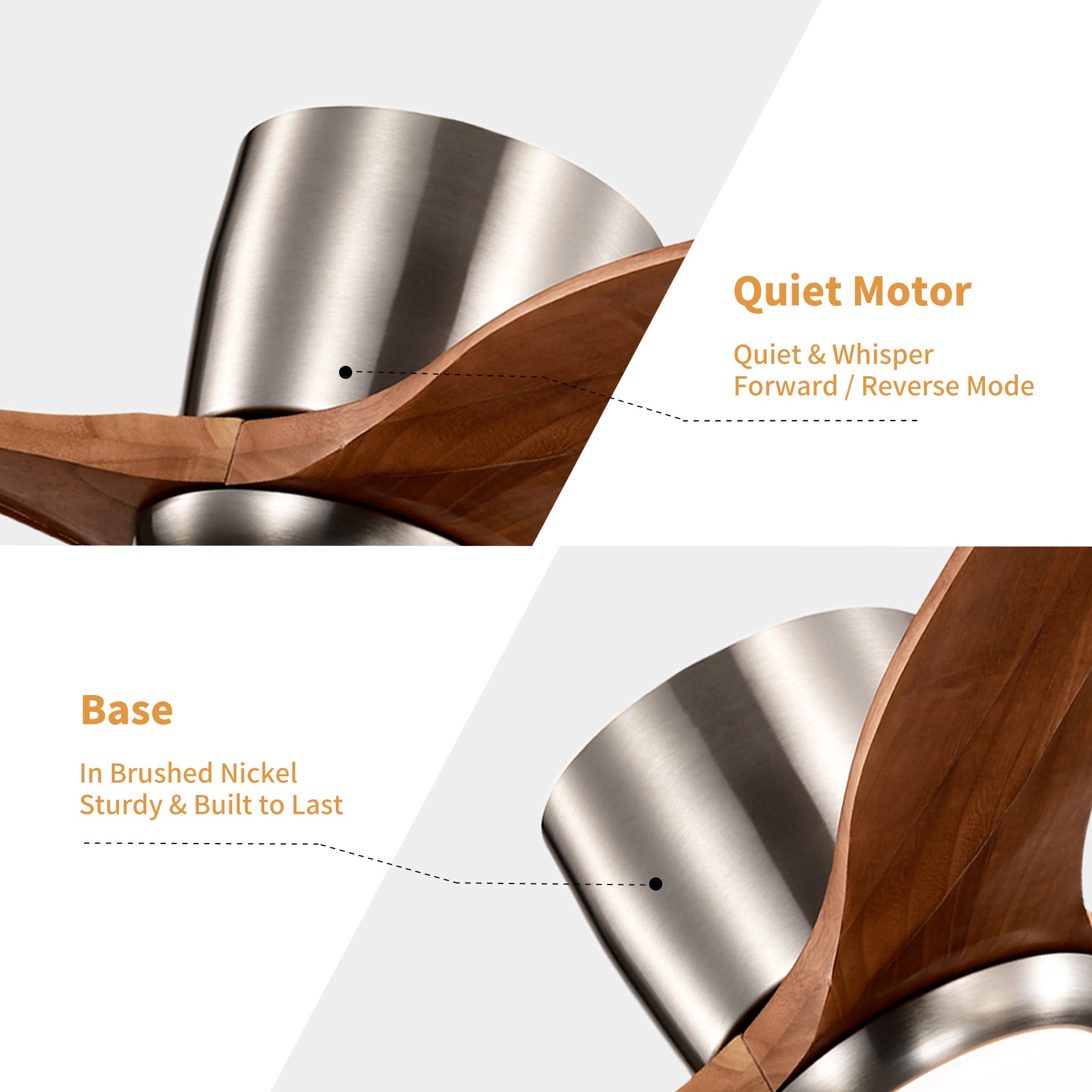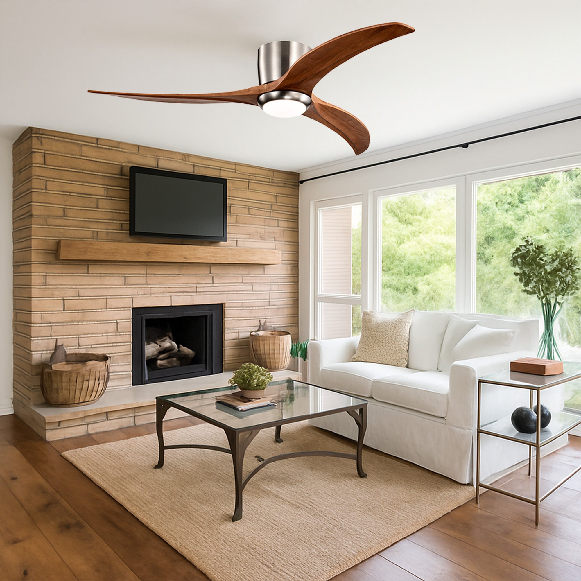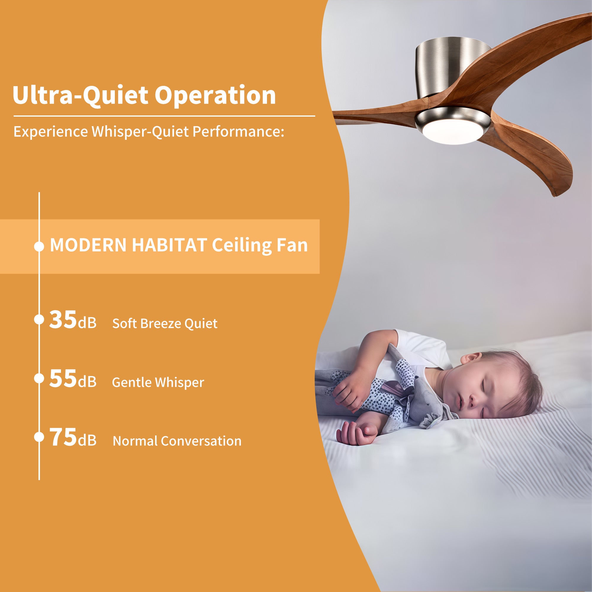 Enjoy your summer with the BladeSpan 52 in. Natural Brushed Nickel ceiling fan with light-a quiet, flush-mount design from Modern Habitat Inc. The Three blades feature a modern farmhouse style with a quiet DC motor that provides six adjustable speeds and two timer settings with remote control. With a 9.2 in. height and 7.48 in. footprint, it provides ample airflow for spaces between 200-400 square feet, perfect for living rooms, kitchens, and home office bedrooms-ideal for compact spaces. The fan features easy-install Quiet Motor technology with two airflow modes, quaranteeing minimal noise.