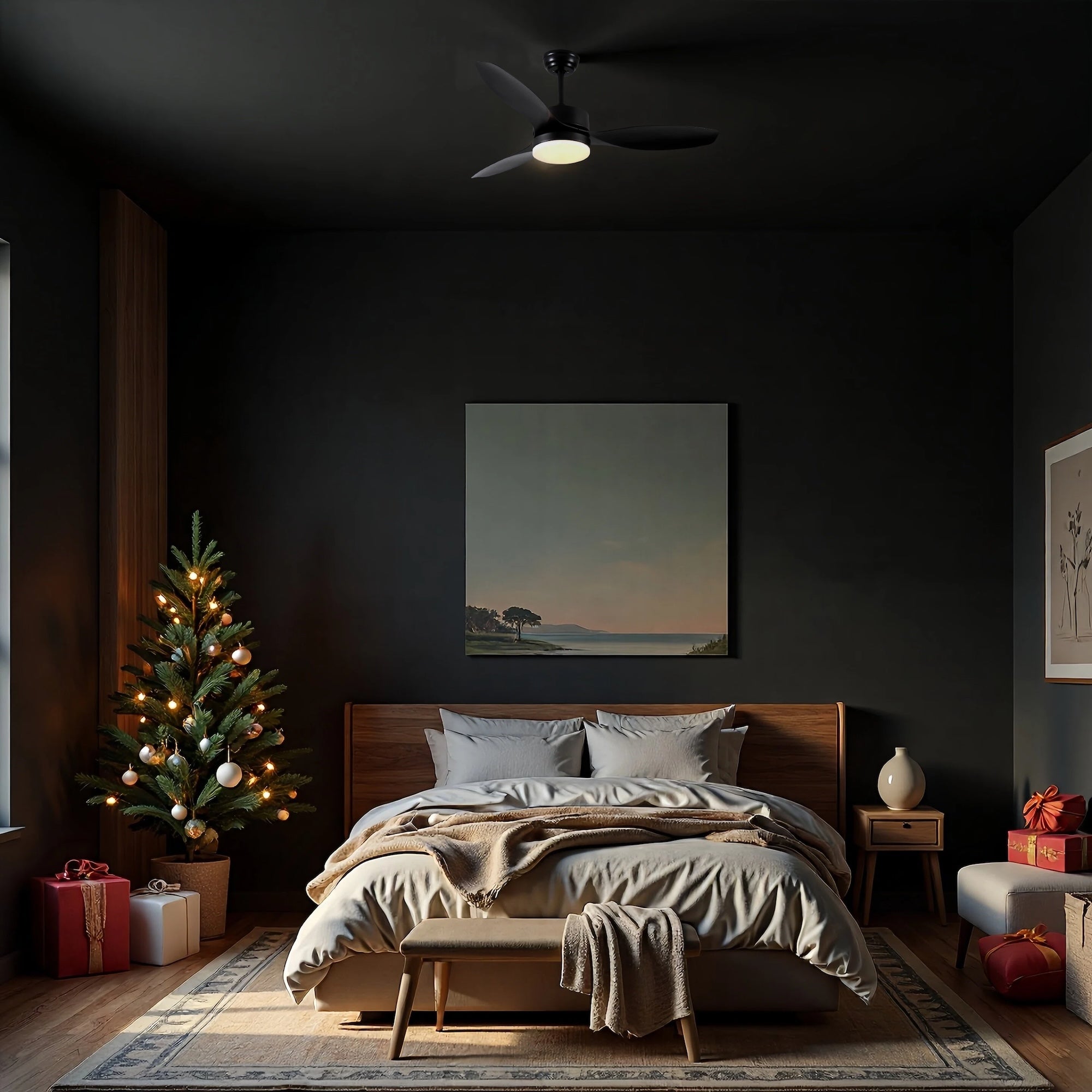 - 52 in. ceiling fan with natural black blades and modern matte black housing finish.