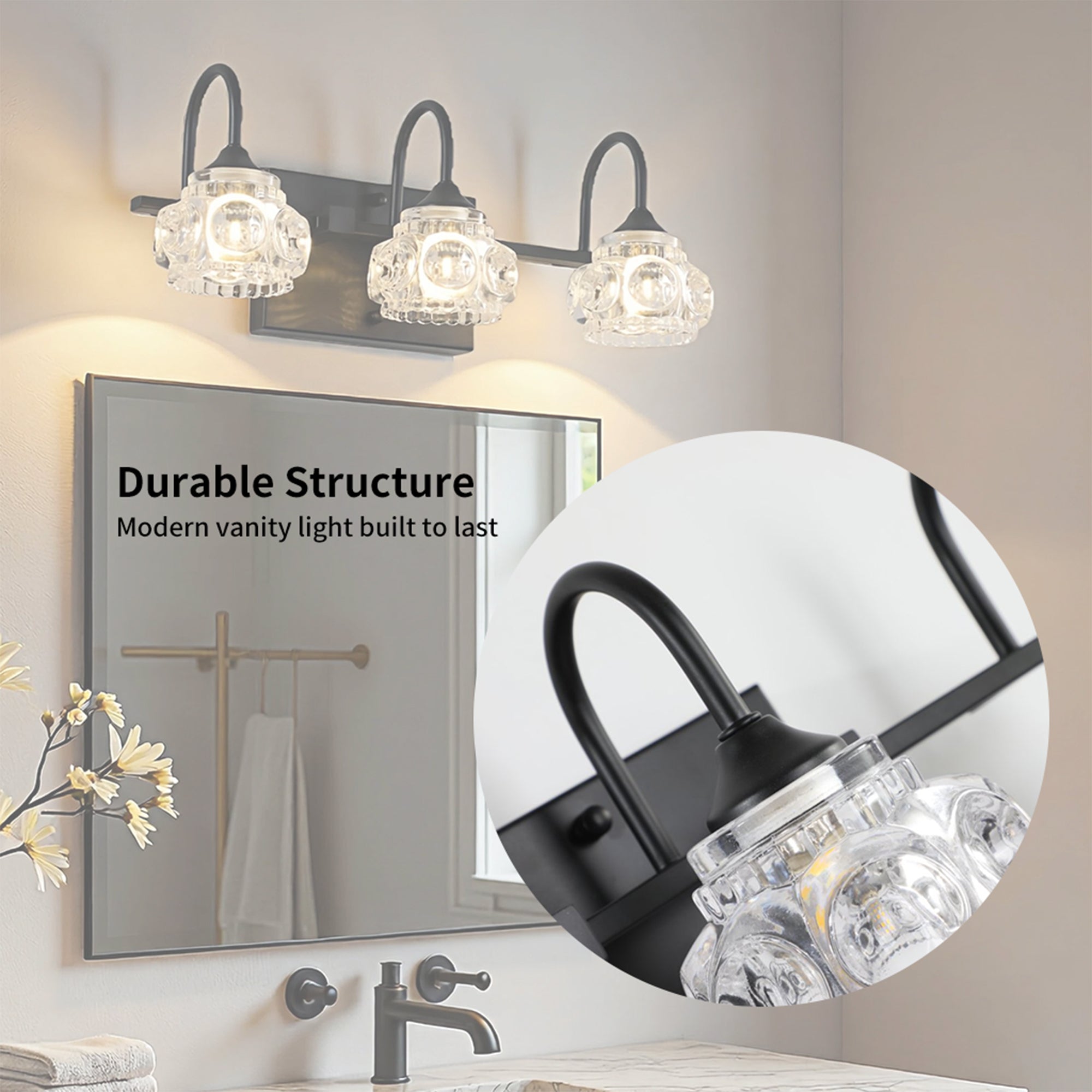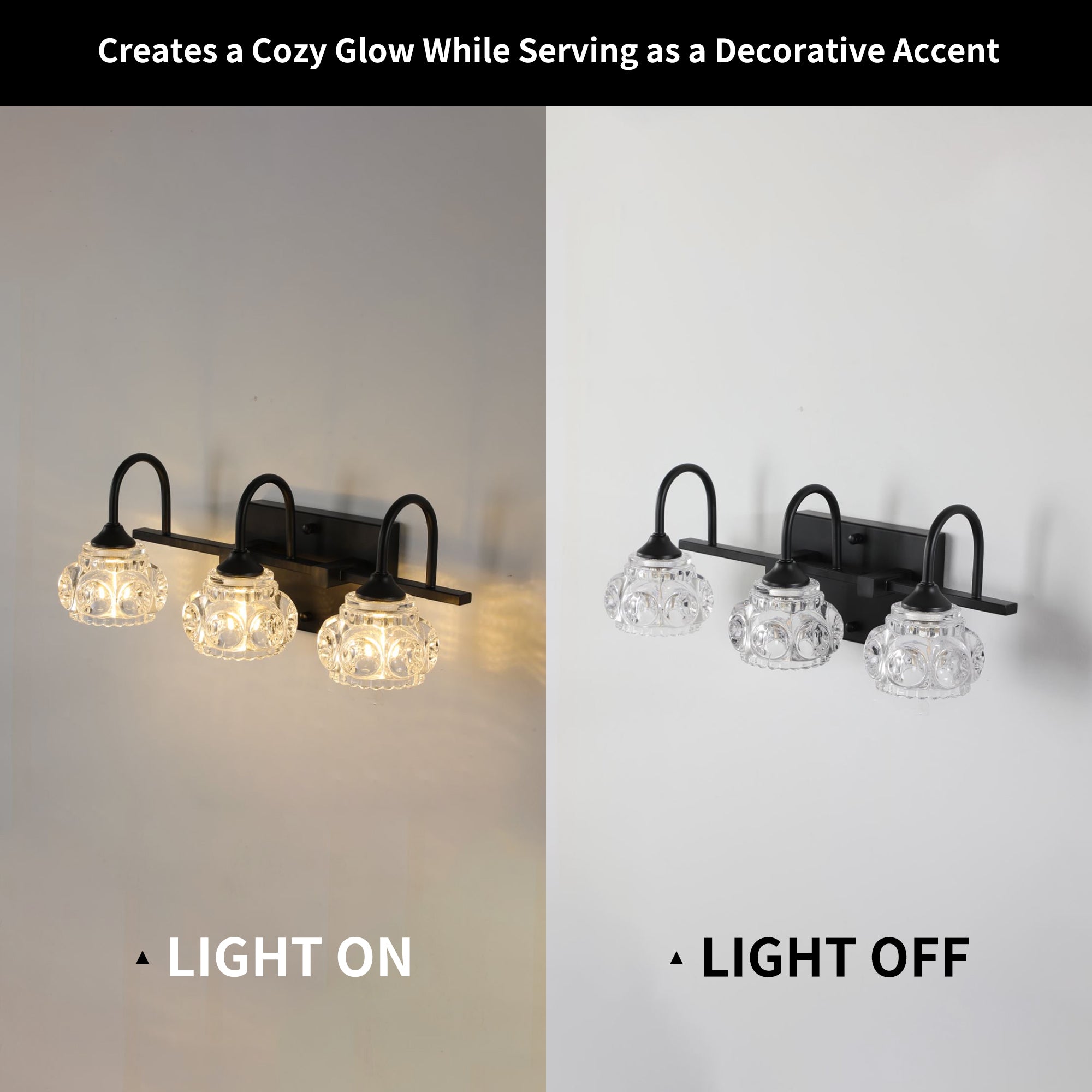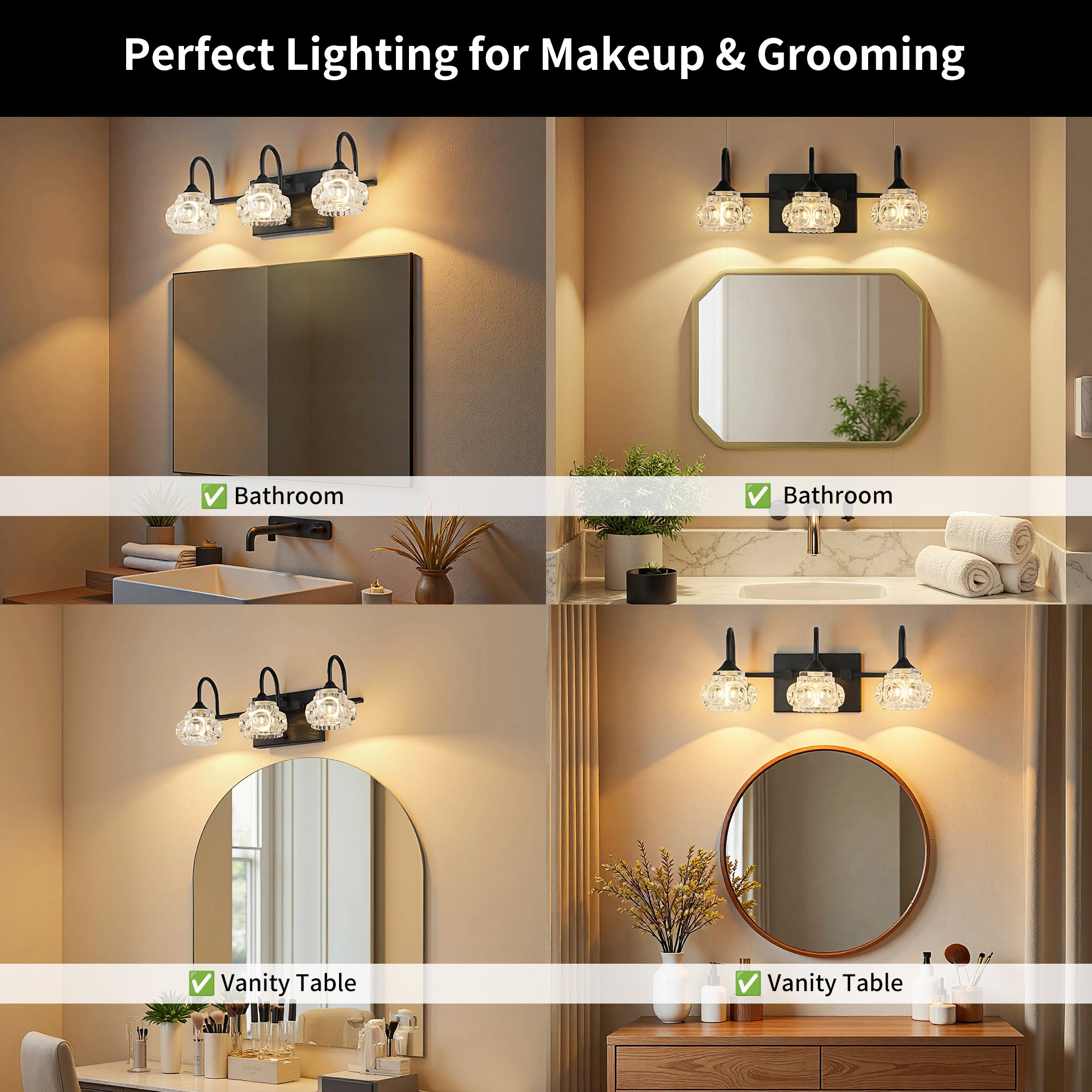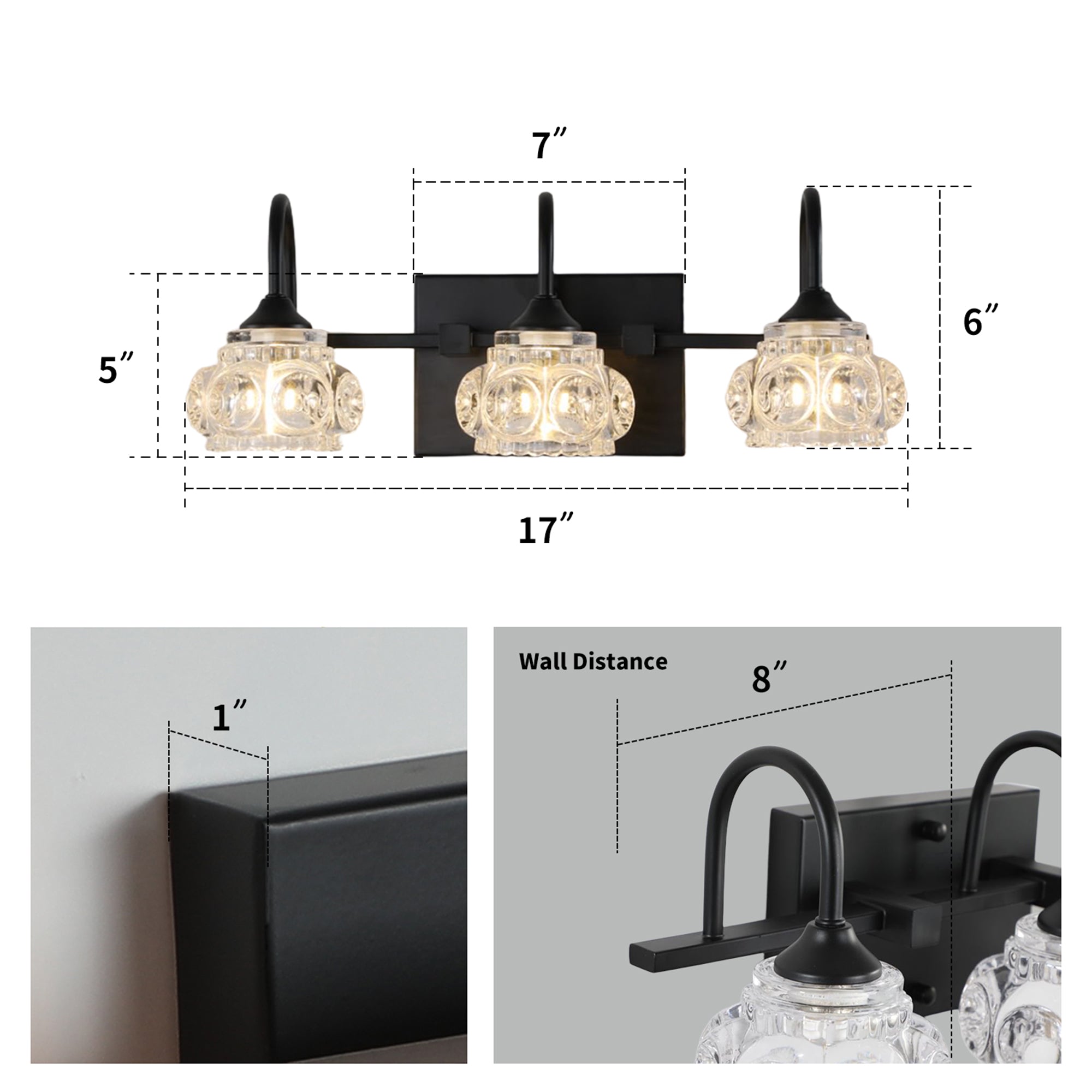 1、17 in. vanity light features 3 vintage-style crystal lampshades (G9 bulbs not included) and comes with a sleek, black-finished metal frame.