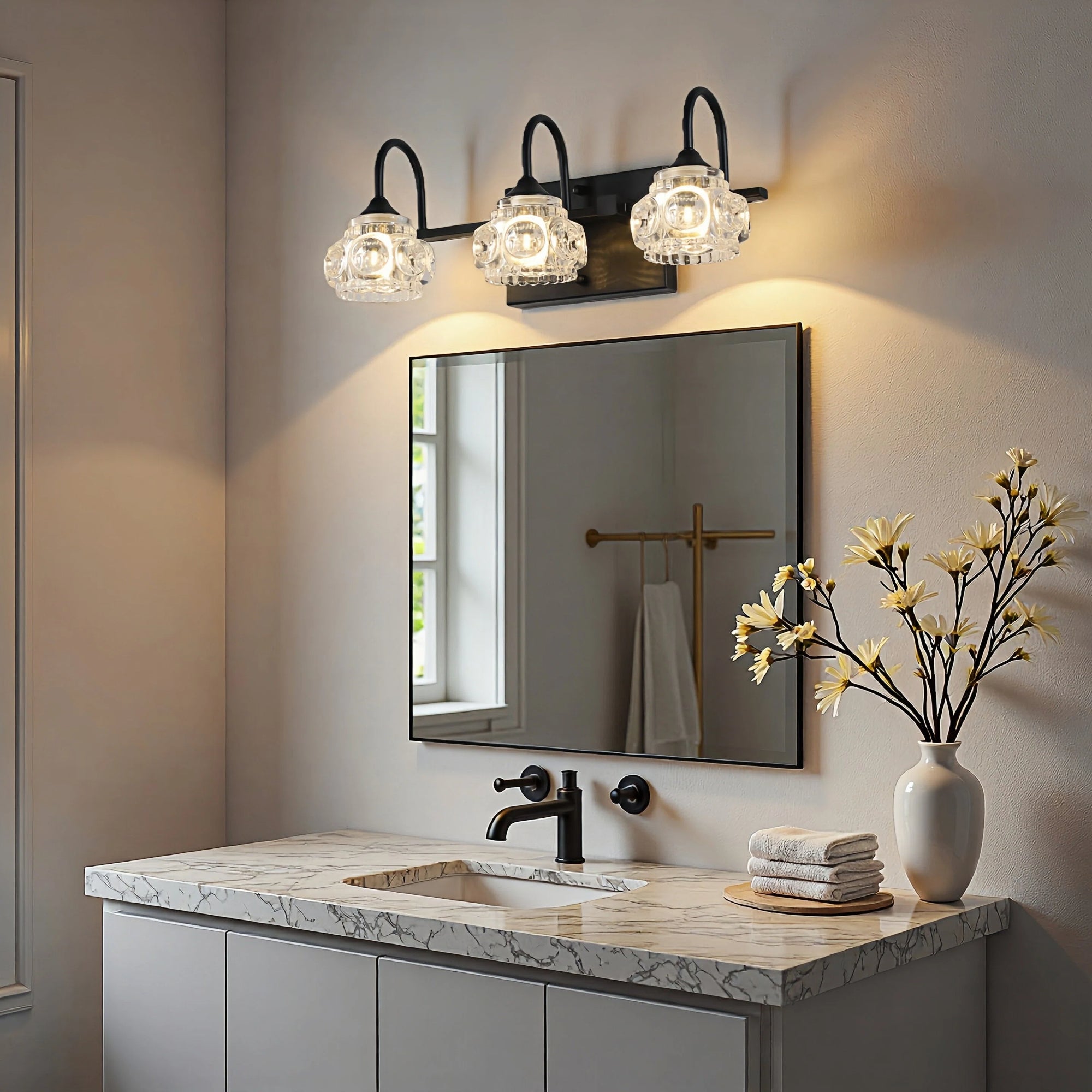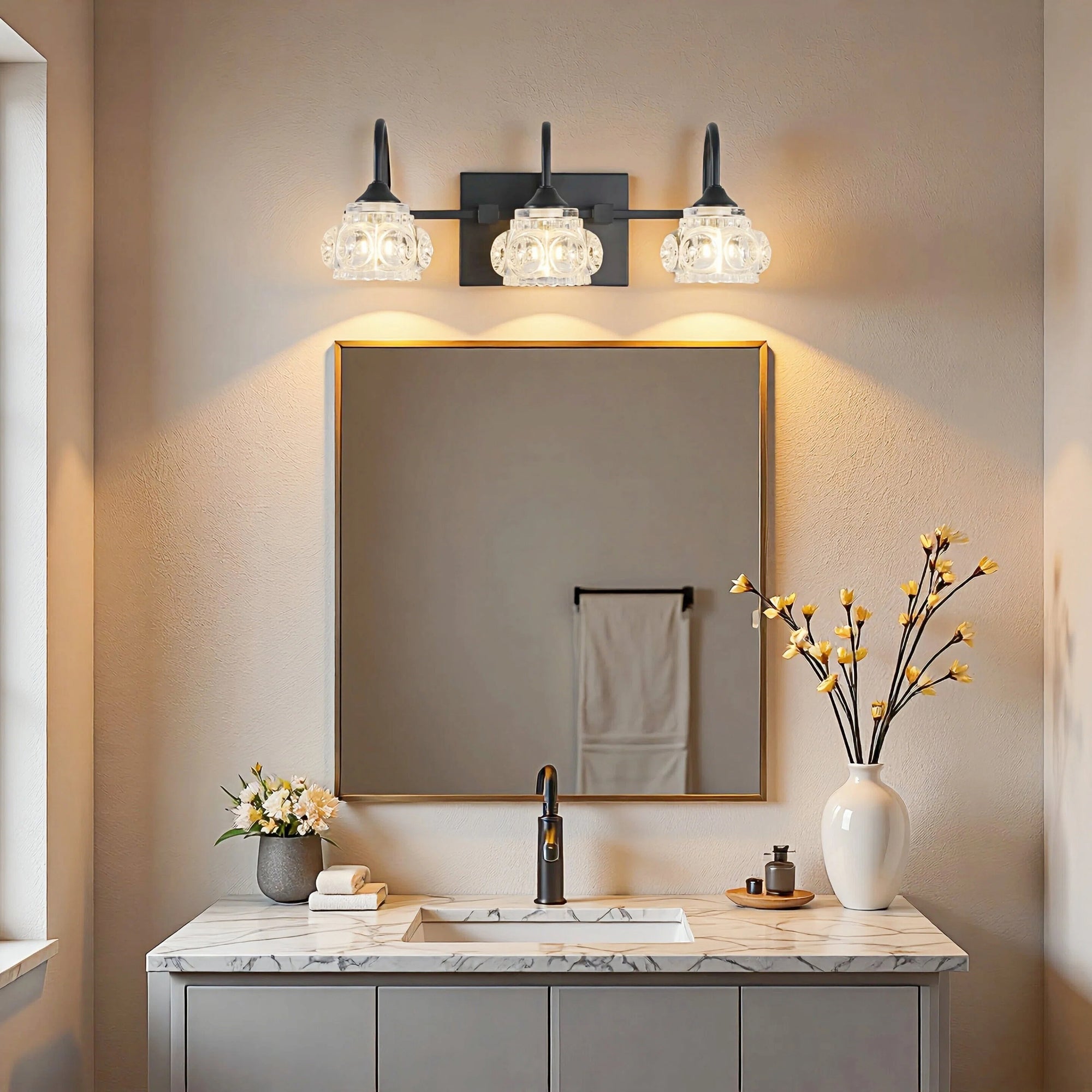 10、A Blend of Old and New: Combining vintage crystal shades with a modern black-plated base, this light fixture perfectly complements both traditional and modern bathroom aesthetics.