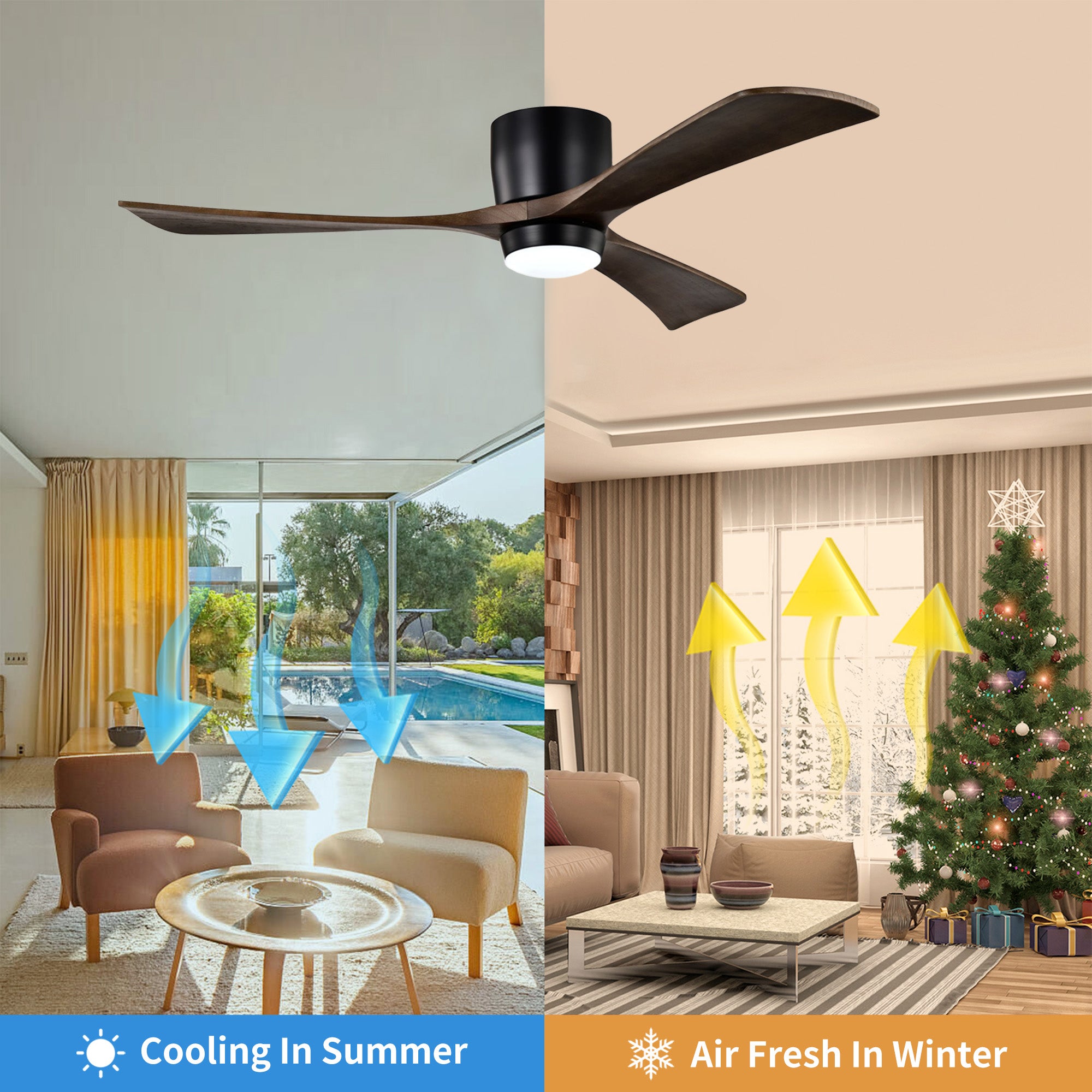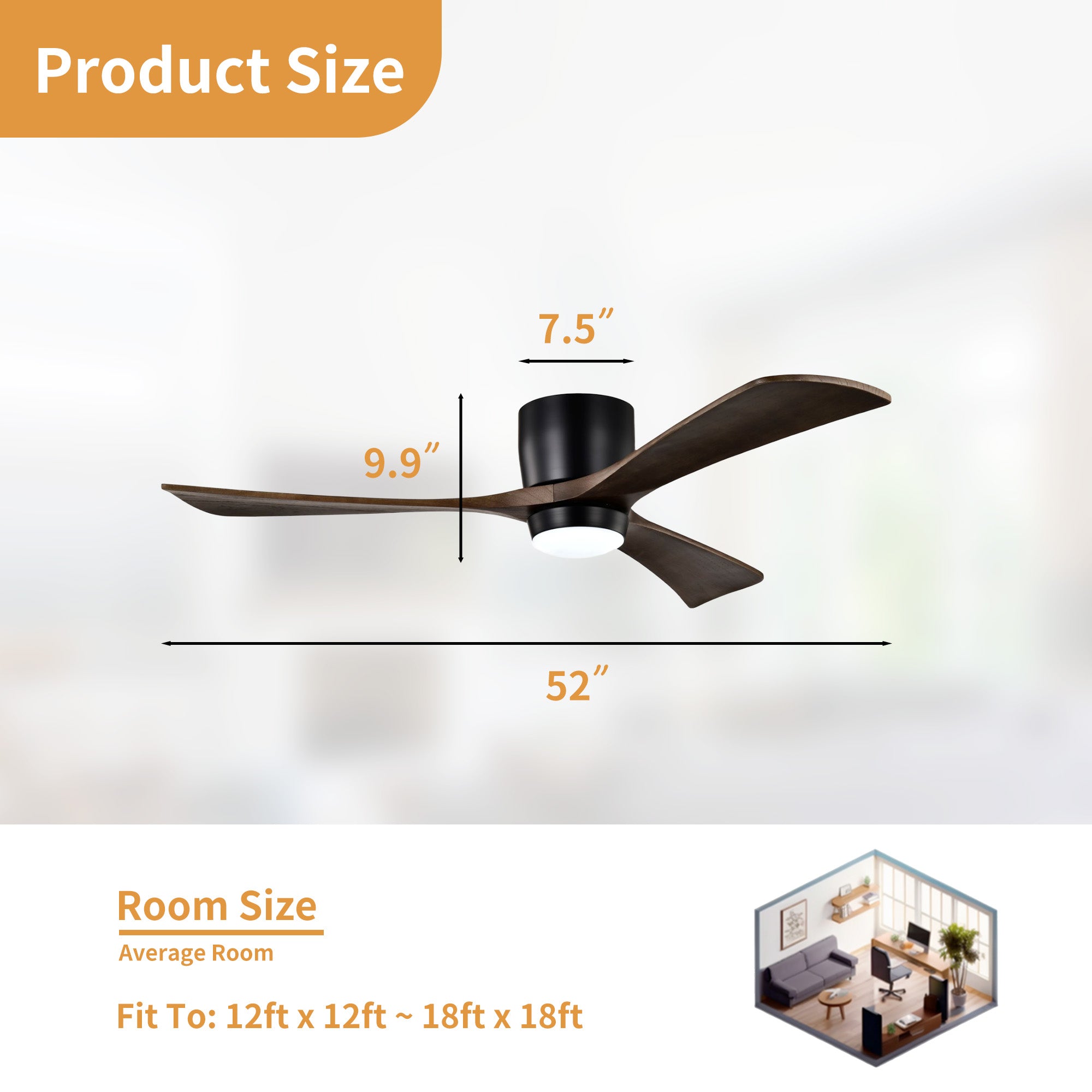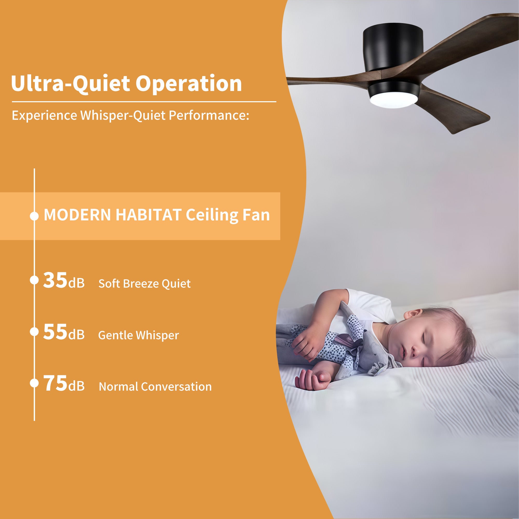 Stay warm and comfortable all winter with the 52 in. Matte Black Metal ceiling fan with light from Modern Habitat. The flush mount minimal design provides a small footprint, creating elevated designs that fit interiors representing both traditional and modern American lifestyles. Featuring three solid wood blades with a reverse function that provides a winter ceiling fan setting mode, and comes with a remote control. The fan features easy-install Quiet Motor technology with three airflow modes, guaranteeing minimal noise. A quiet DC motor provides six adjustable speeds and two timer settings. It to fit spaces from 200–400 square feet — from living rooms and kitchens to home offices and bedrooms — accommodating various ceiling heights from open-mount to high ceilings. Warm lighting settings come with three lighting temperature options to help improve air circulation and enhance your holiday home living experience.