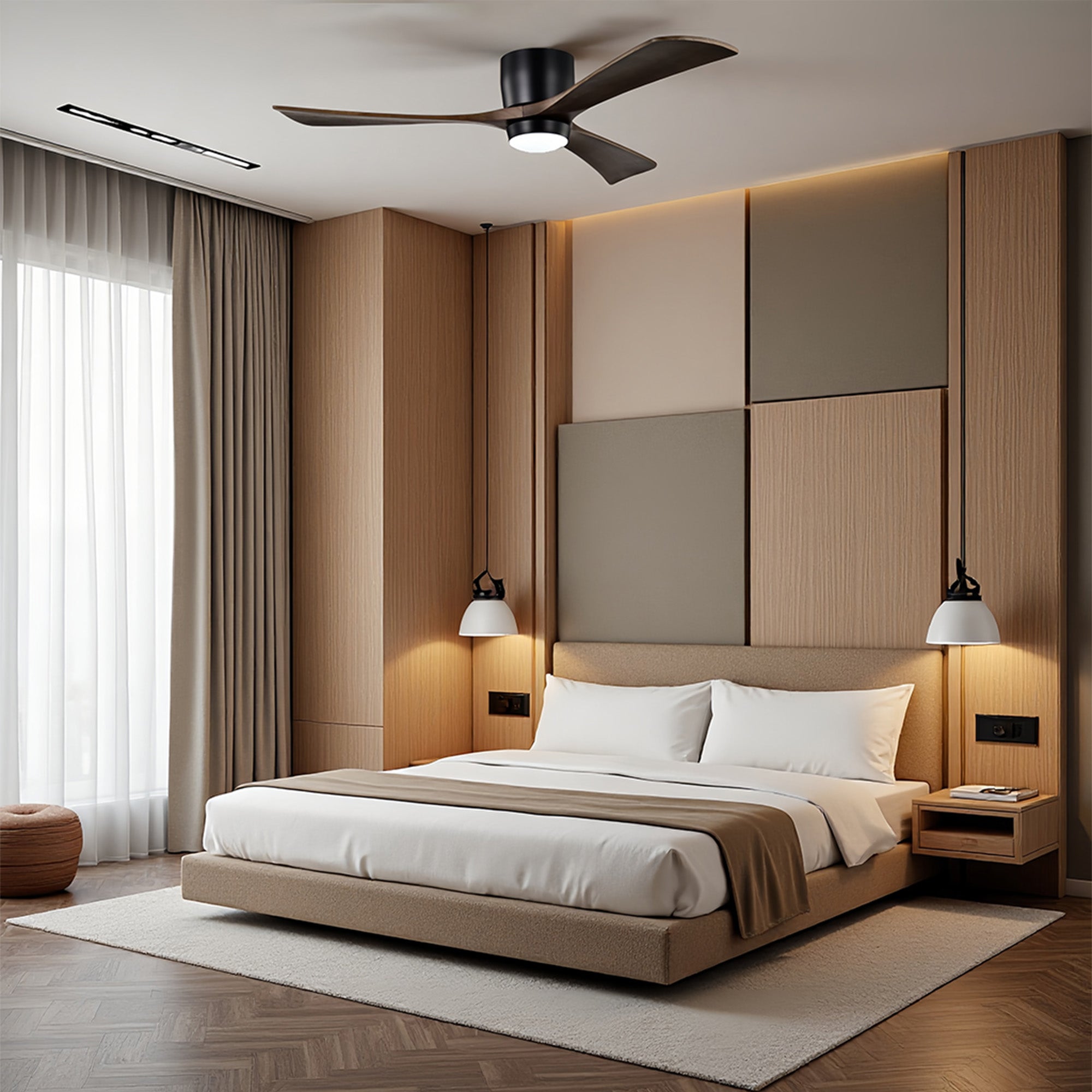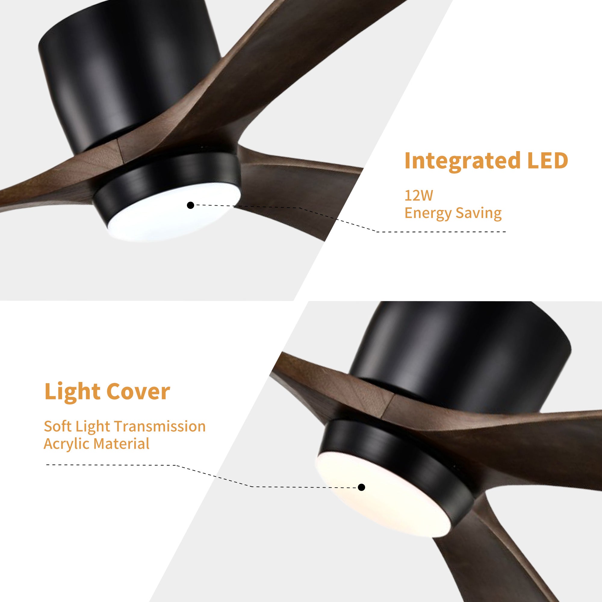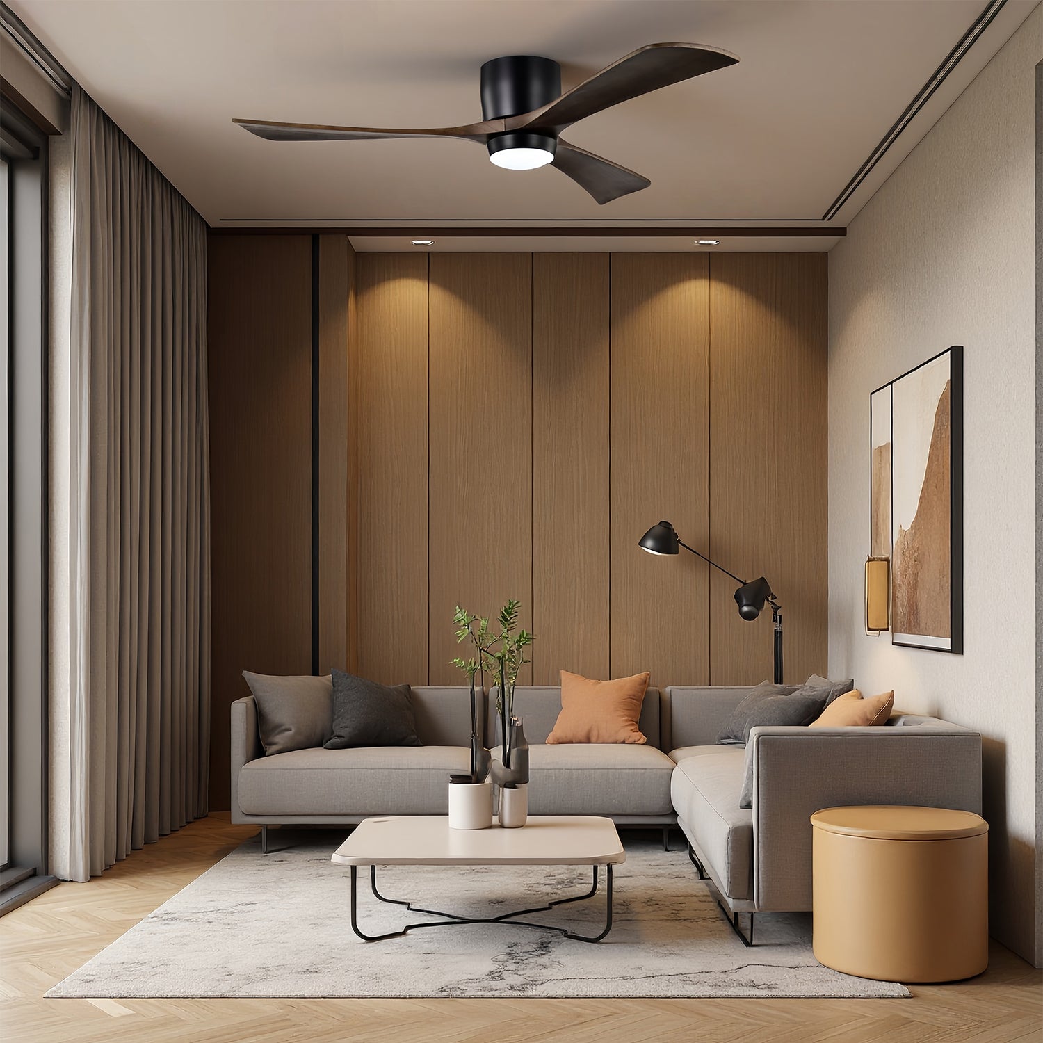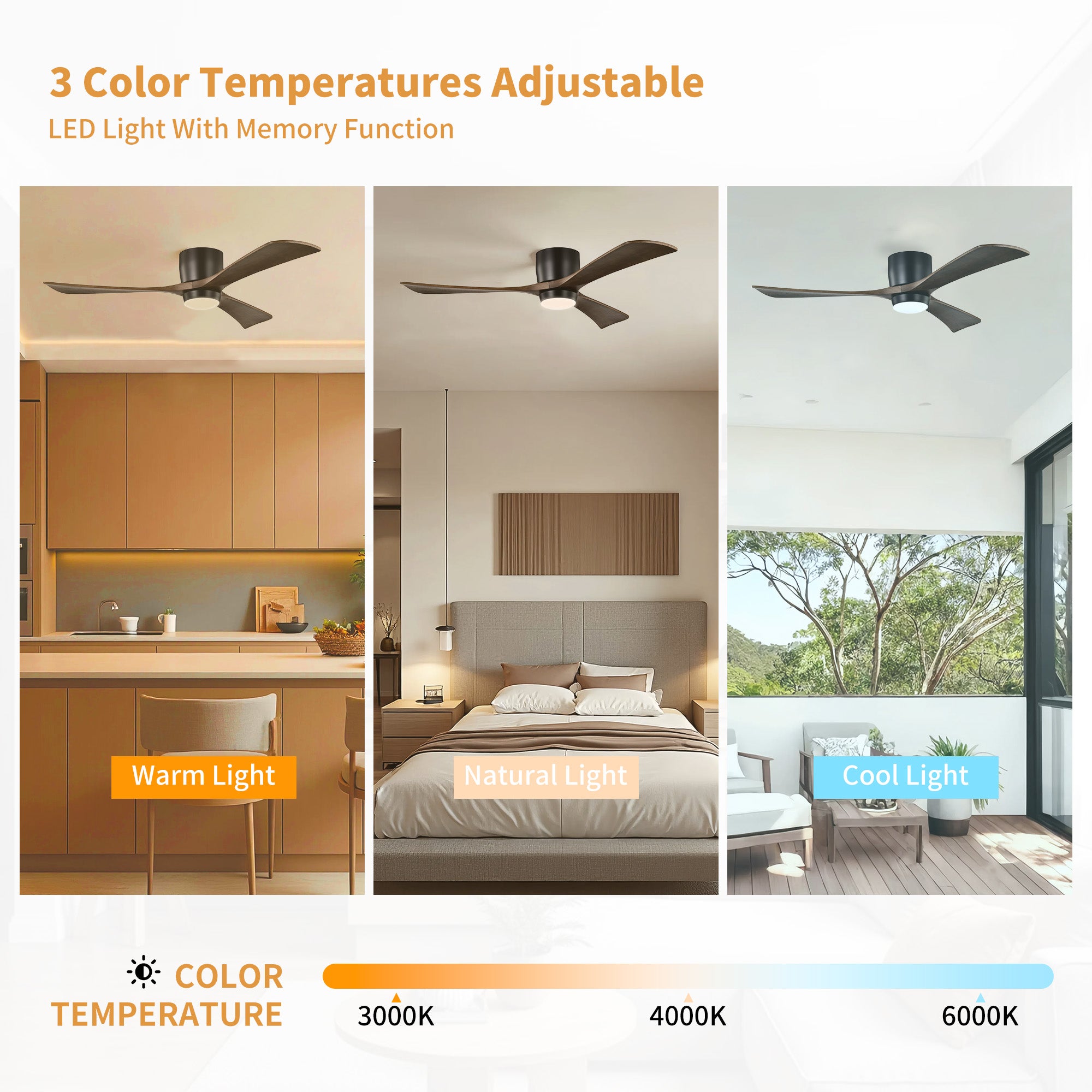 Stay warm and comfortable all winter with the 52 in. Matte Black Metal ceiling fan with light from Modern Habitat. The flush mount minimal design provides a small footprint, creating elevated designs that fit interiors representing both traditional and modern American lifestyles. Featuring three solid wood blades with a reverse function that provides a winter ceiling fan setting mode, and comes with a remote control. The fan features easy-install Quiet Motor technology with three airflow modes, guaranteeing minimal noise. A quiet DC motor provides six adjustable speeds and two timer settings. It to fit spaces from 200–400 square feet — from living rooms and kitchens to home offices and bedrooms — accommodating various ceiling heights from open-mount to high ceilings. Warm lighting settings come with three lighting temperature options to help improve air circulation and enhance your holiday home living experience.