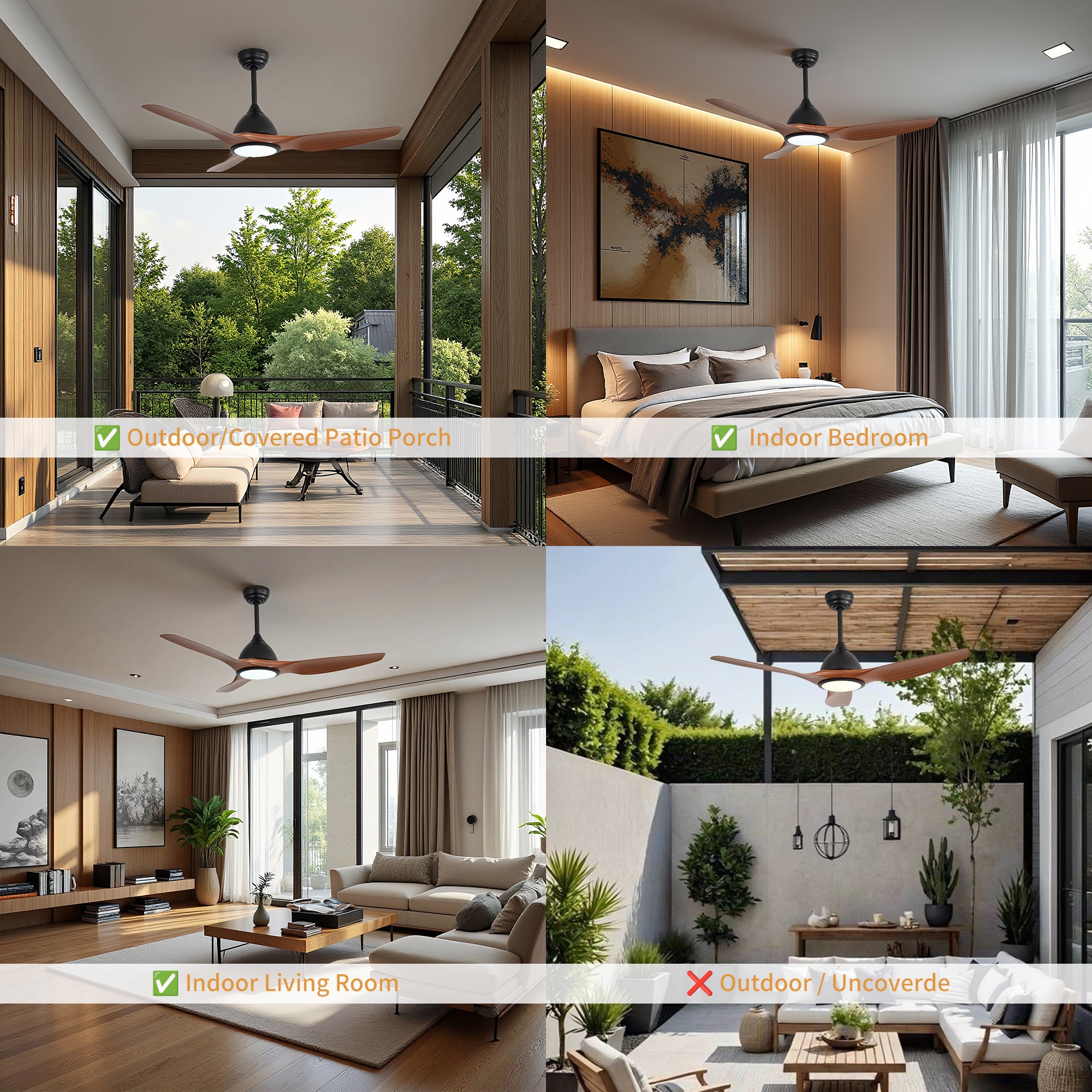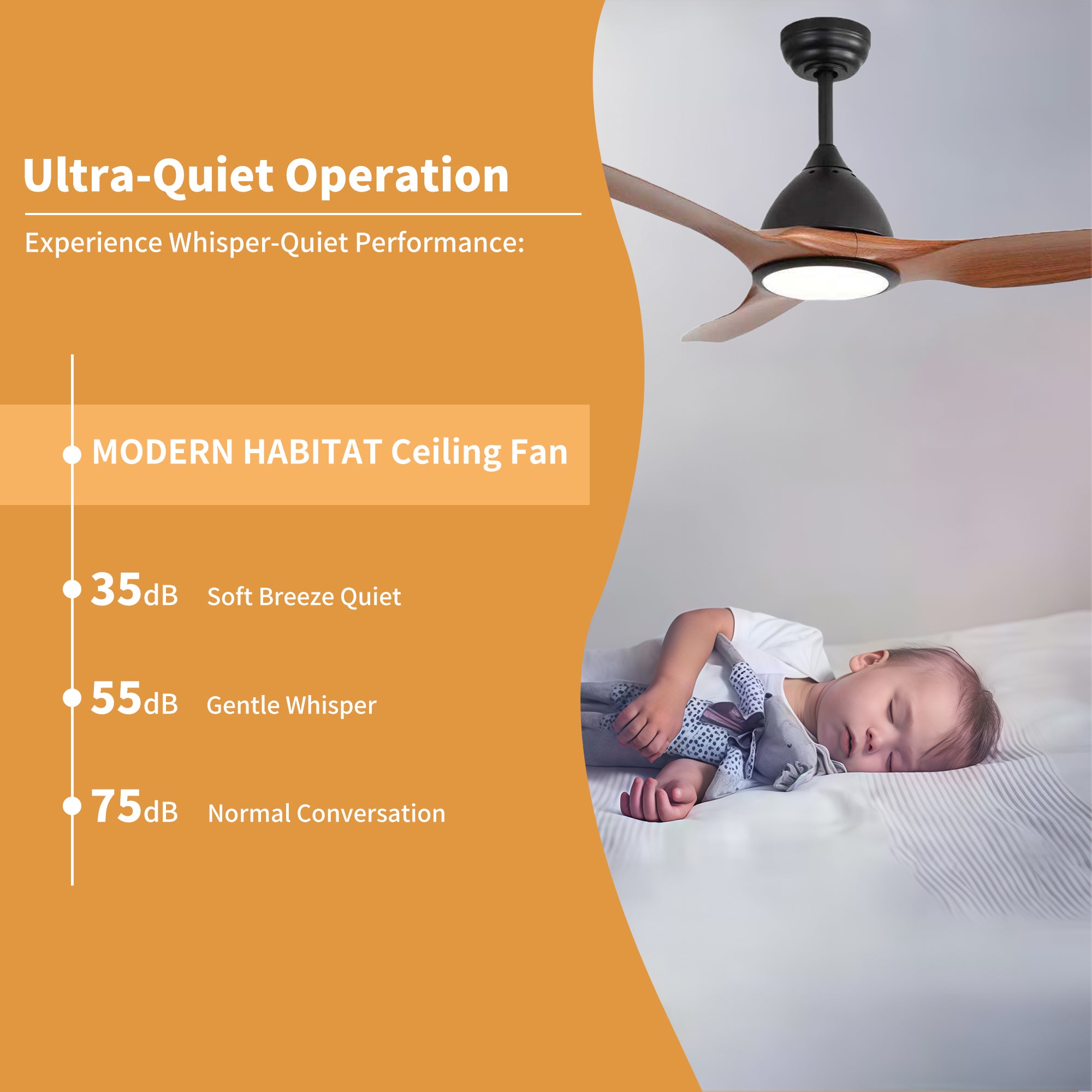 Refresh your living space, whether indoor or outdoor, this summer, with the AuraVista Collection 52 in. Natural Matte Black ceiling fan with light from Modern Habitat. The three blades feature a modern farmhouse style with a quiet DC motor that provides six adjustable speeds and three timer settings with remote control. lt comes with dual-mount hardware andthree downrod sizes (6, 10, and 24 in,) to fit spaces from 200-400 square feet, from living roomsand kitchens to home office bedrooms, accommodating various ceiling heights from close-mount to high ceiling. The mounting options also allow installation on a pitched ceiling at a max angle of 15 degrees. The fan featureseasy-insta Quiet Motor technoloav with two alrfow modes, auaranteeina minima noise.