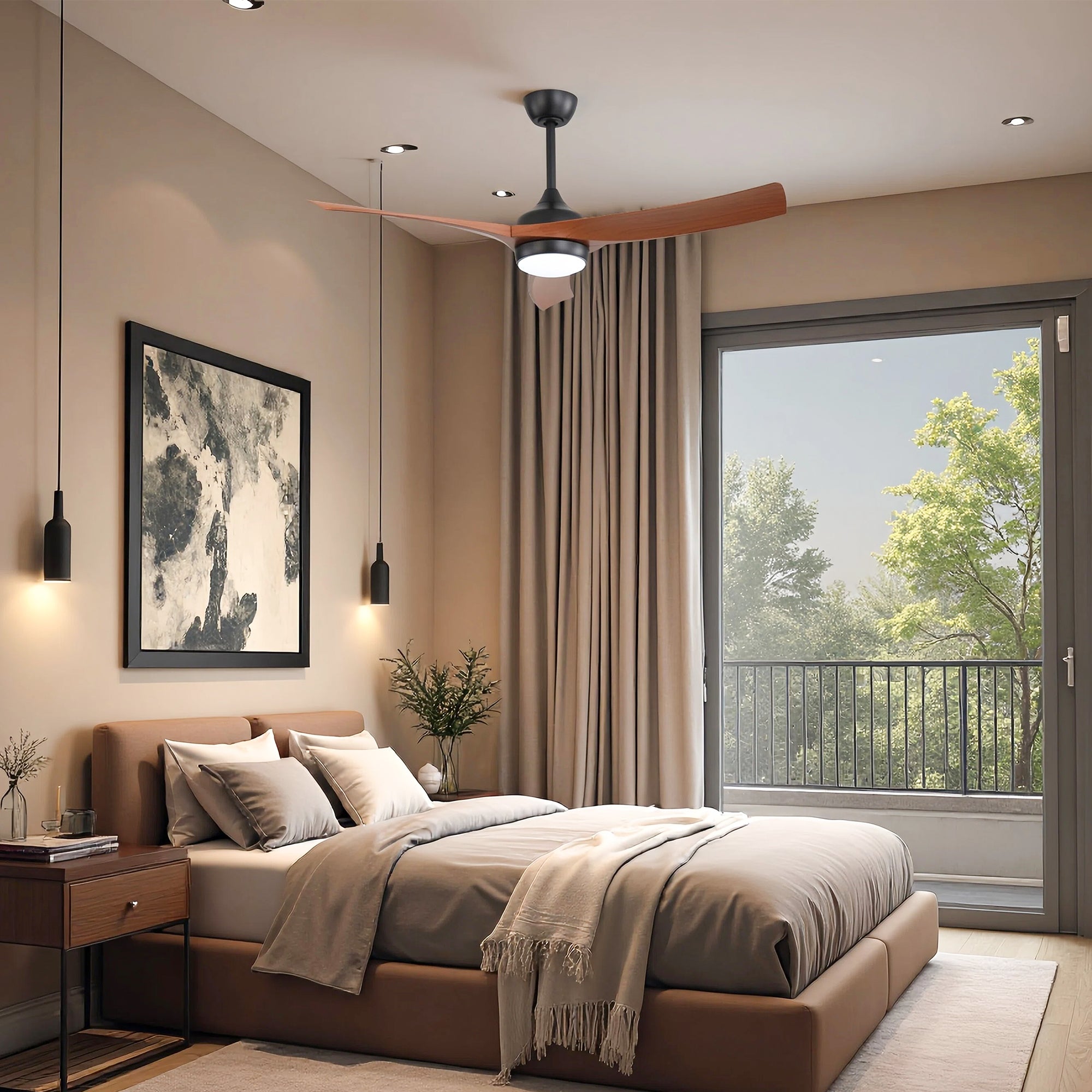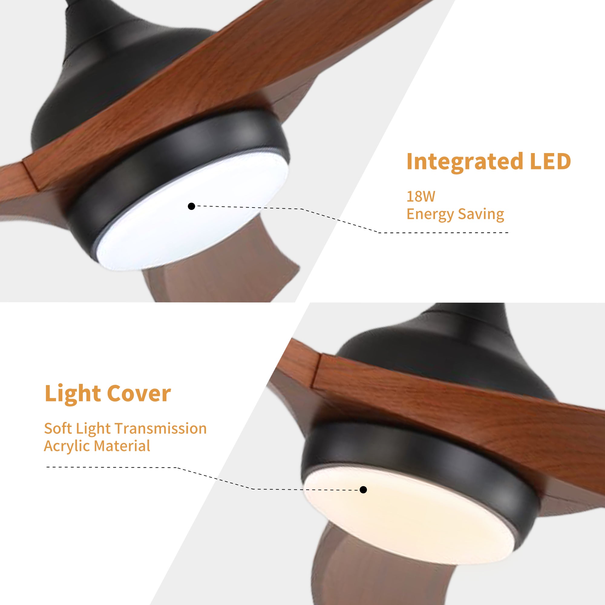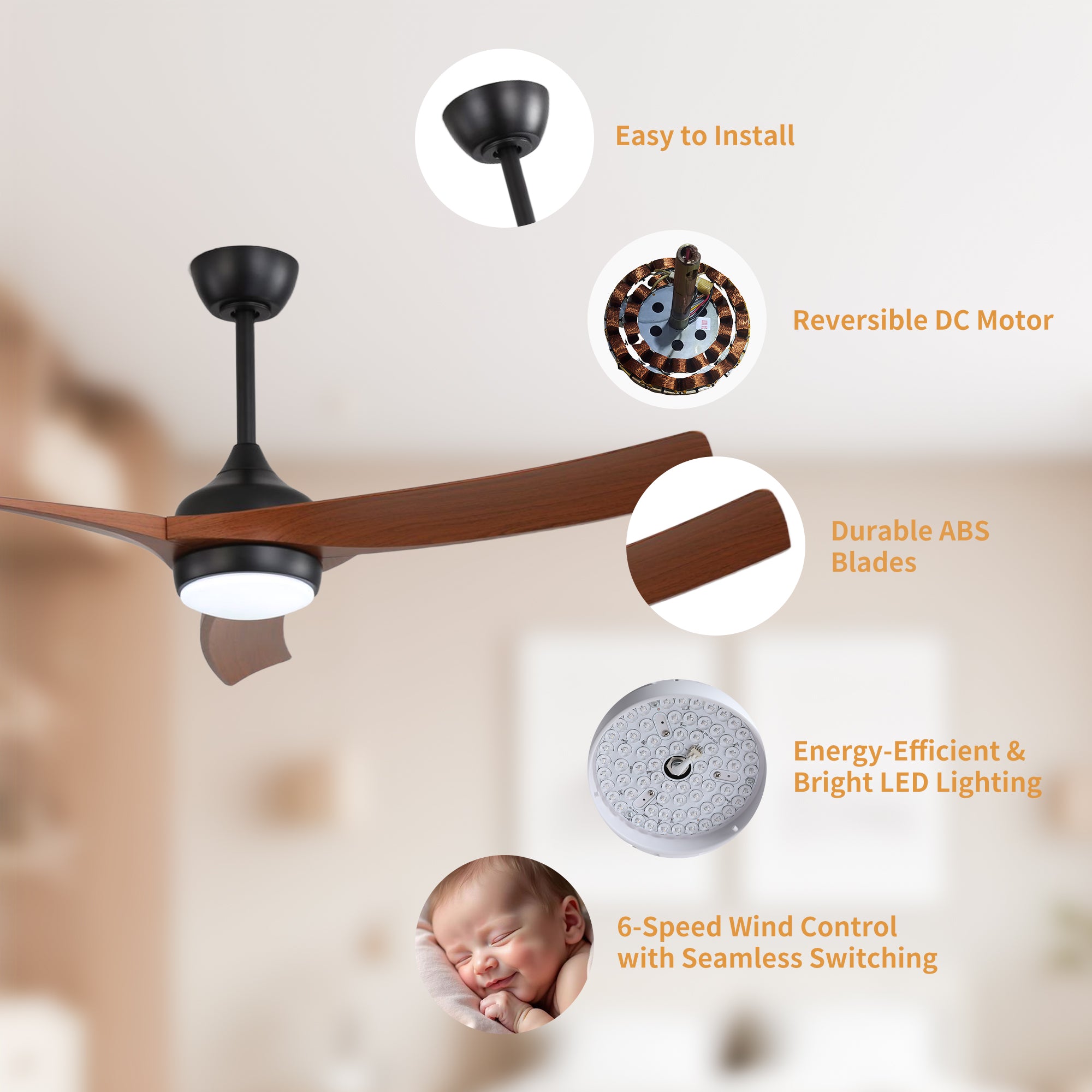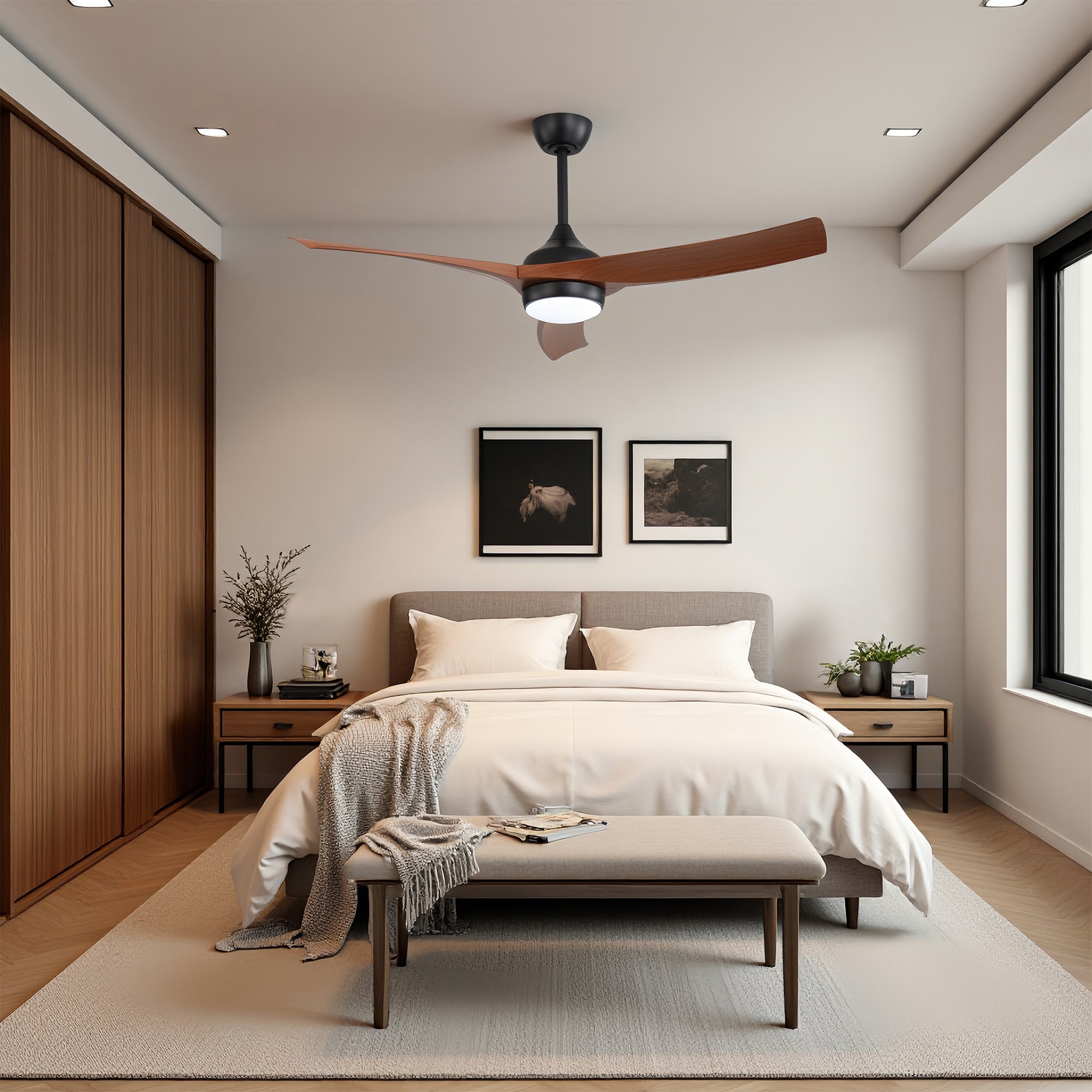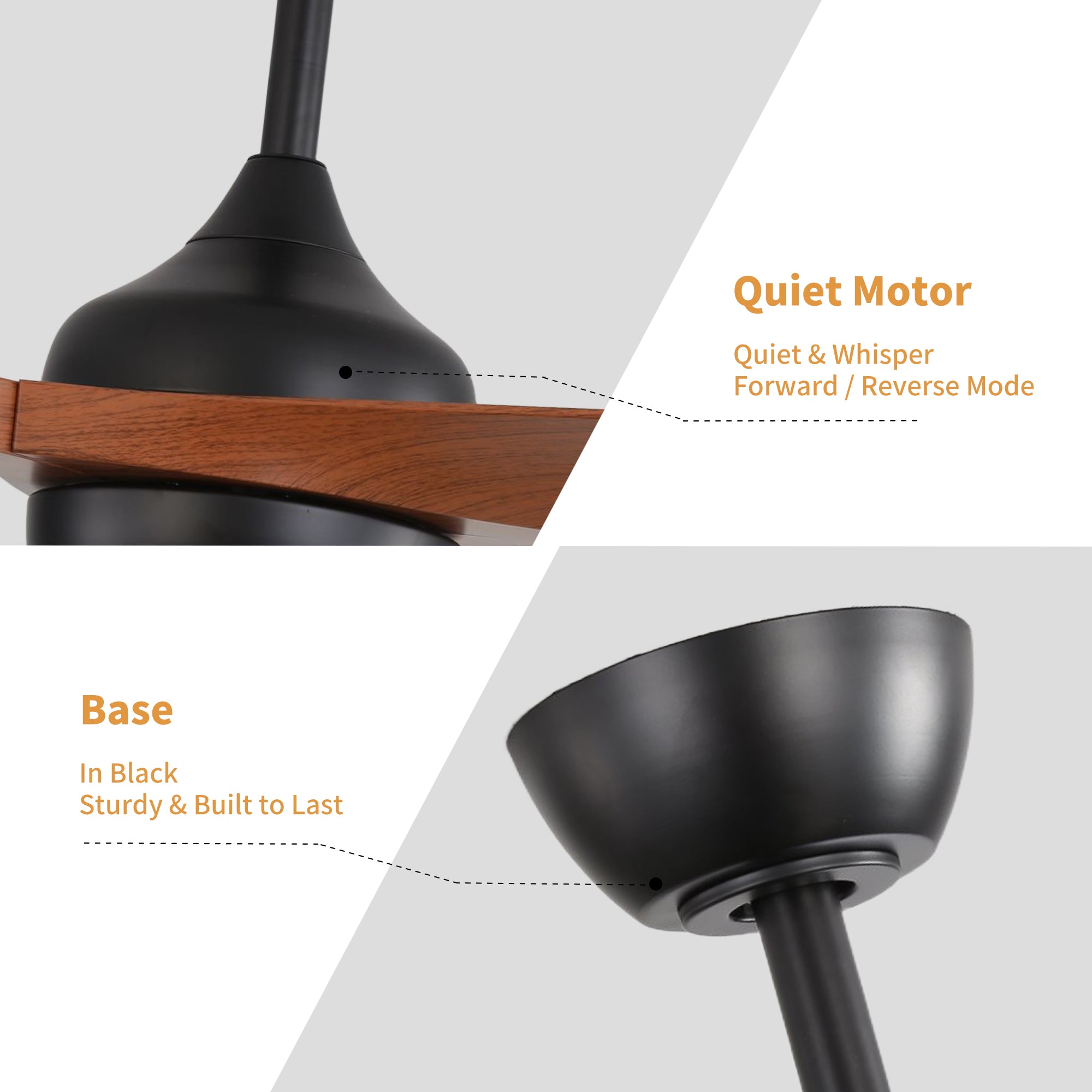 - 52 in. ceiling fan with natural Walnut ABS blades and modern Matte Black housing finish.