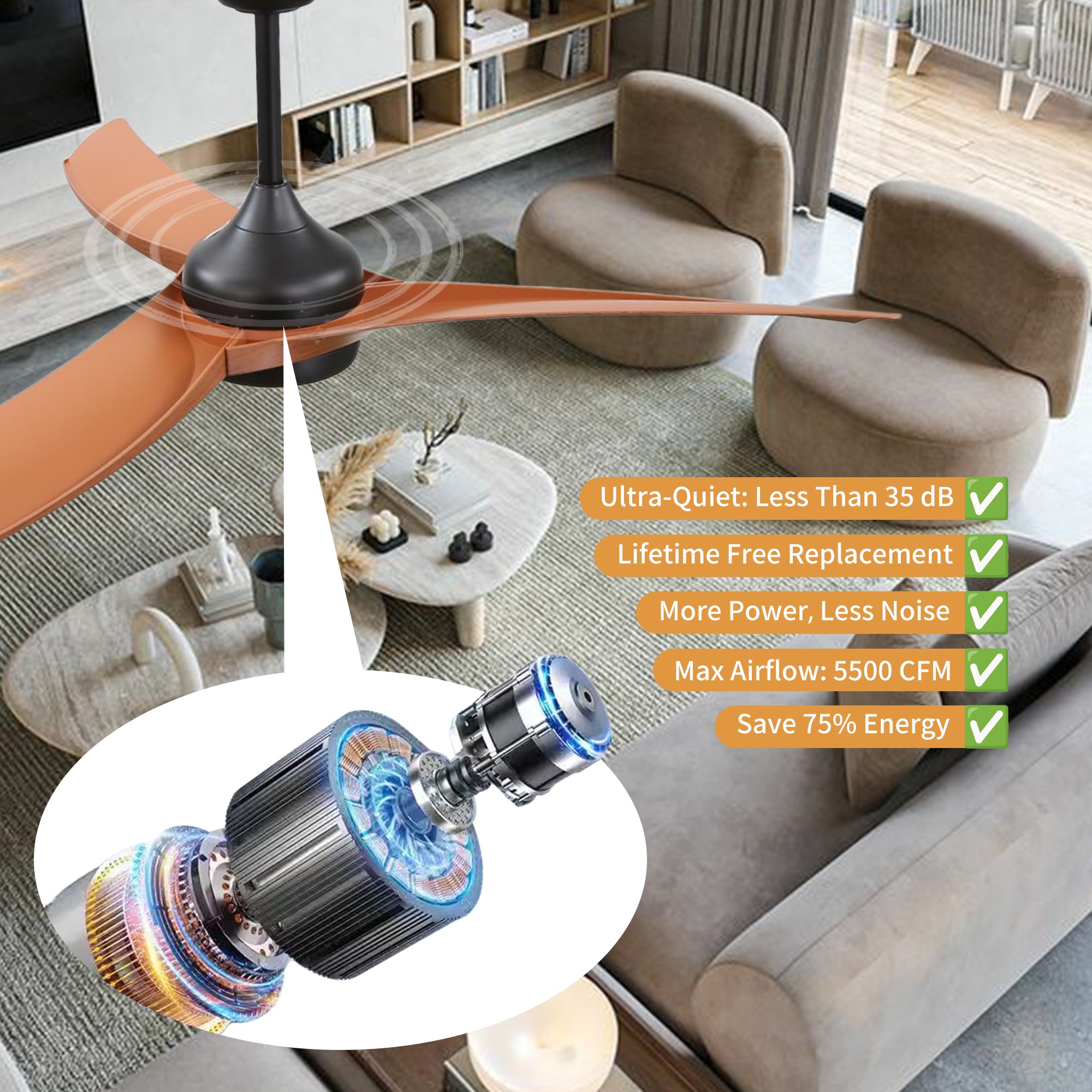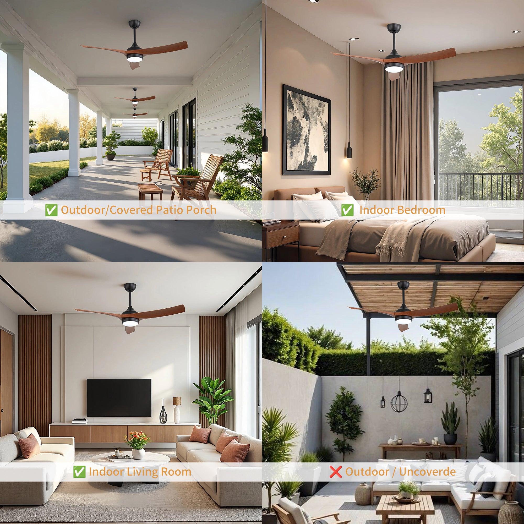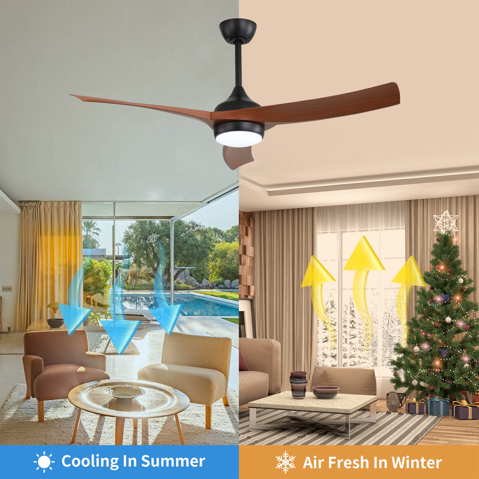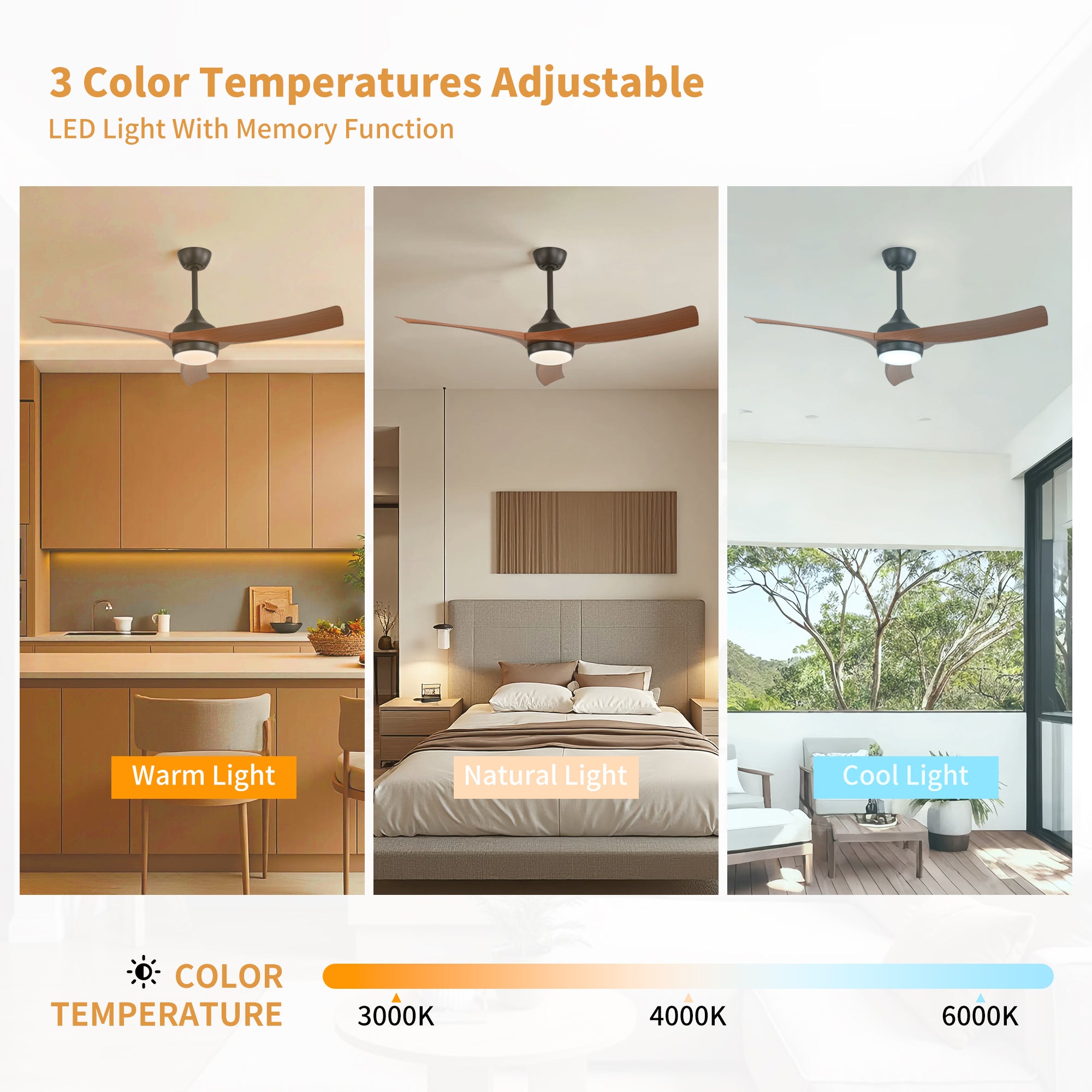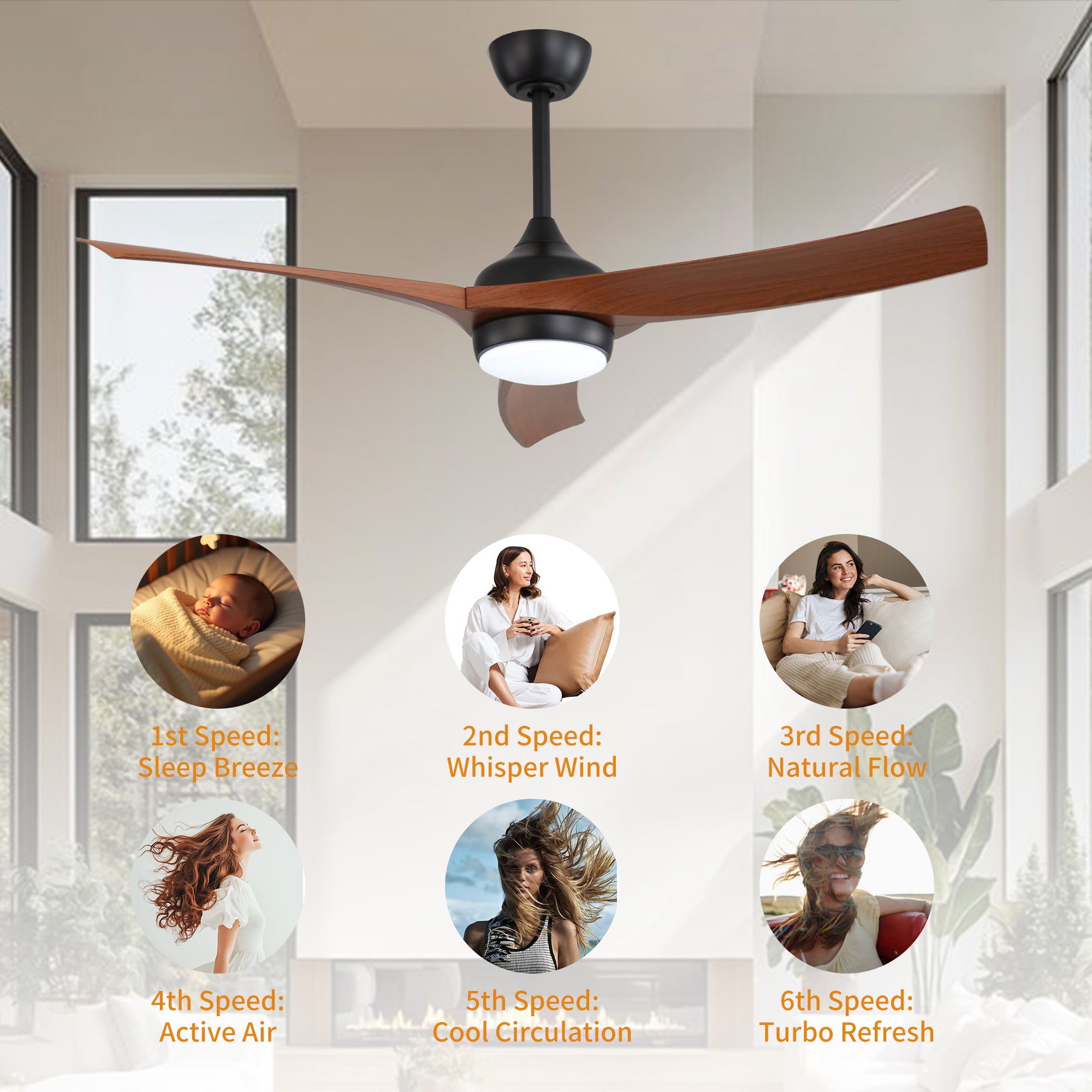 - 52 in. ceiling fan with natural Walnut ABS blades and modern Matte Black housing finish.