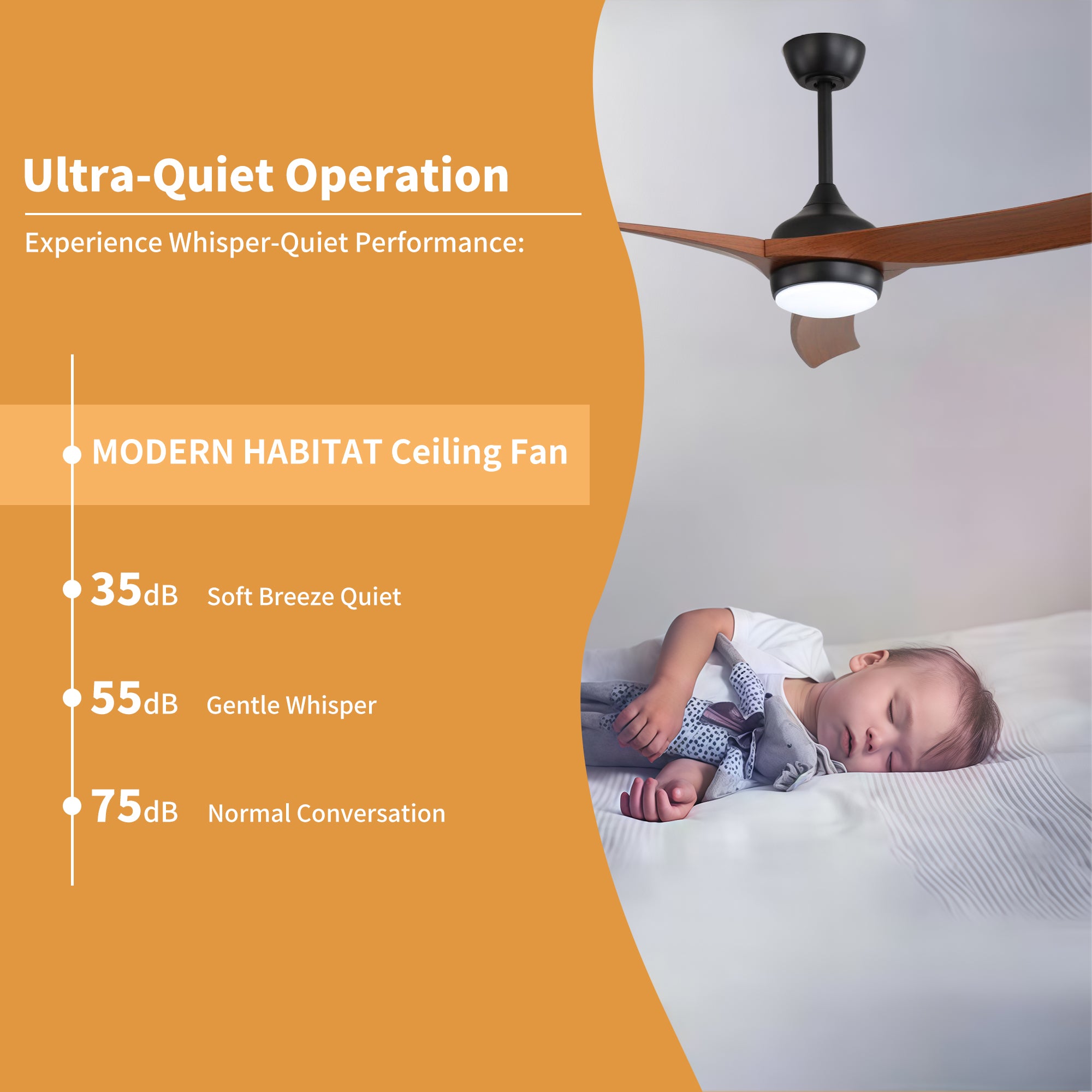 Refresh your living space, whether indoor or outdoor, this summer, with the AuraVista Collection 52 in. Matte Black ceiling fan with light from Modern Habitat. The three blades feature a modern farmhouse style with a quiet DC motor that provides six adjustable speeds and timer settings with remote control. lt comes with three downrod sizes (5, 10, and 24 in) to fit spaces from 200-400 square feet, from living rooms and kitchens to home office bedrooms, accommodating various ceiling heights from close-mount to high ceiling. The mounting options also allow installation on a pitched ceiling at a max angle of 15 degrees. The fan features easy-install Quiet Motor technology with two airflow models, auaranteein a minima noise.