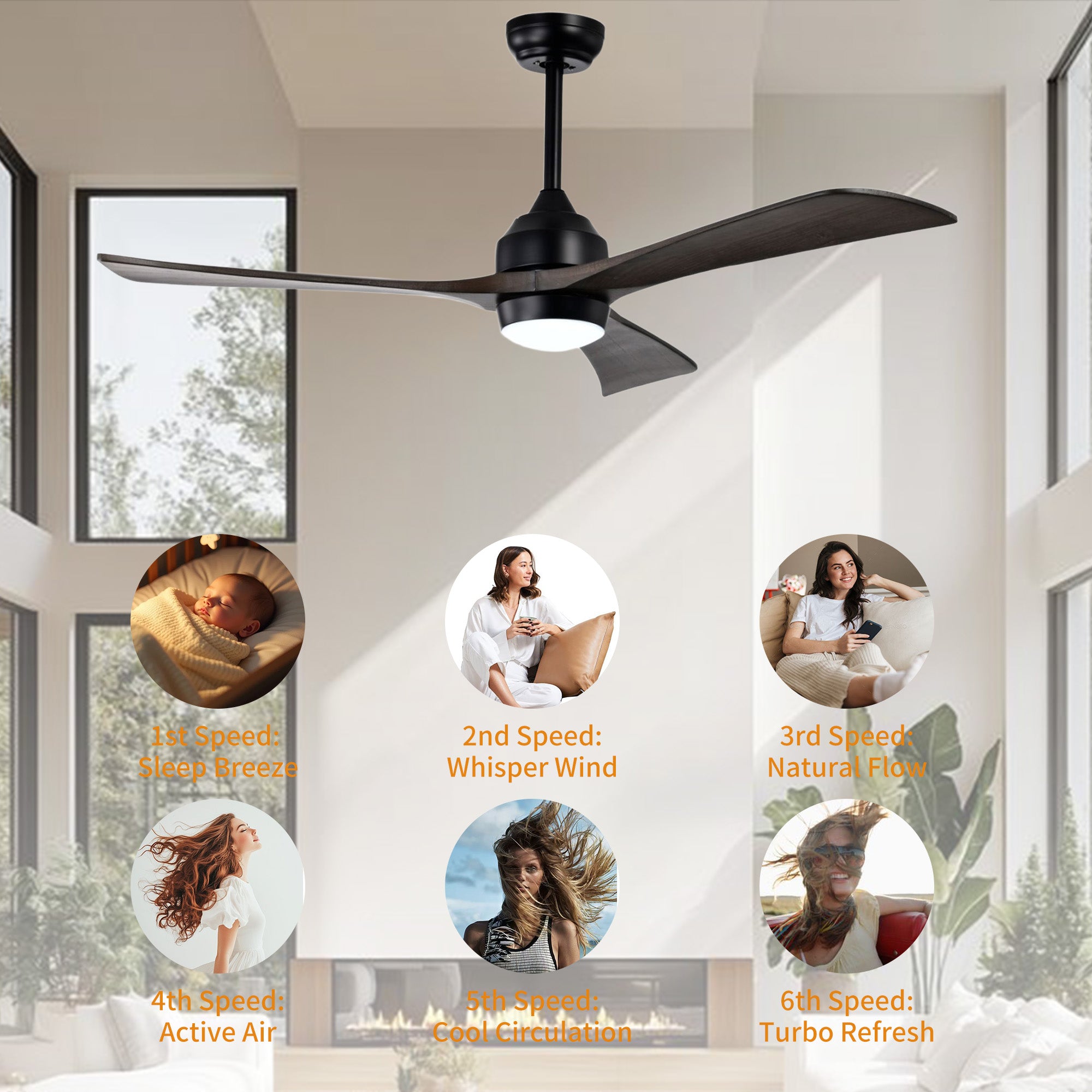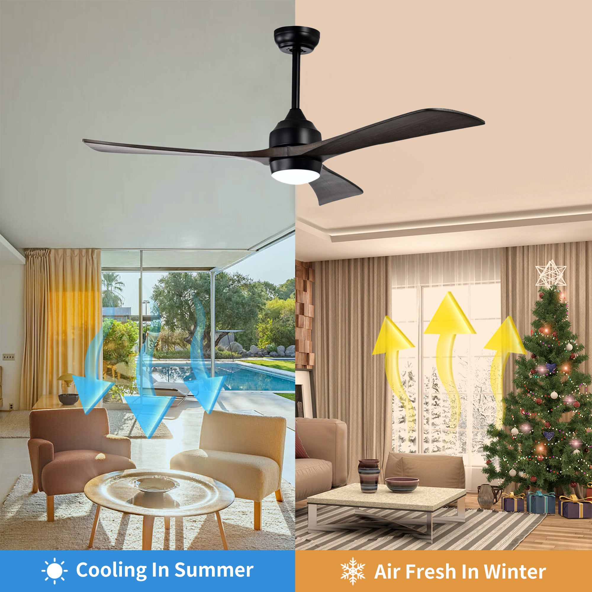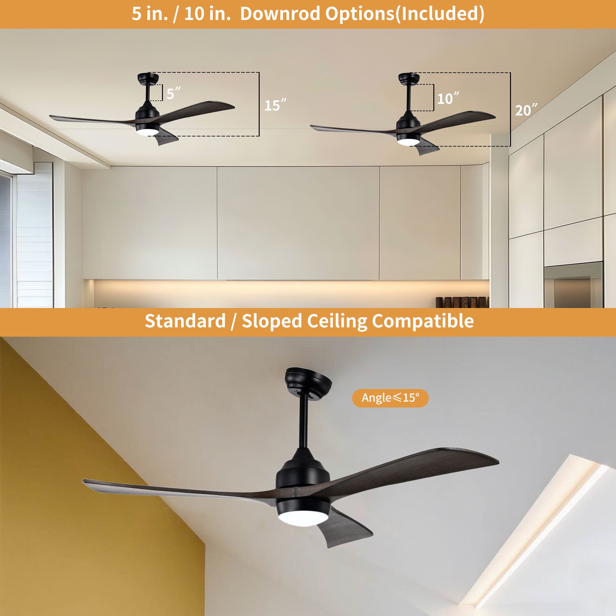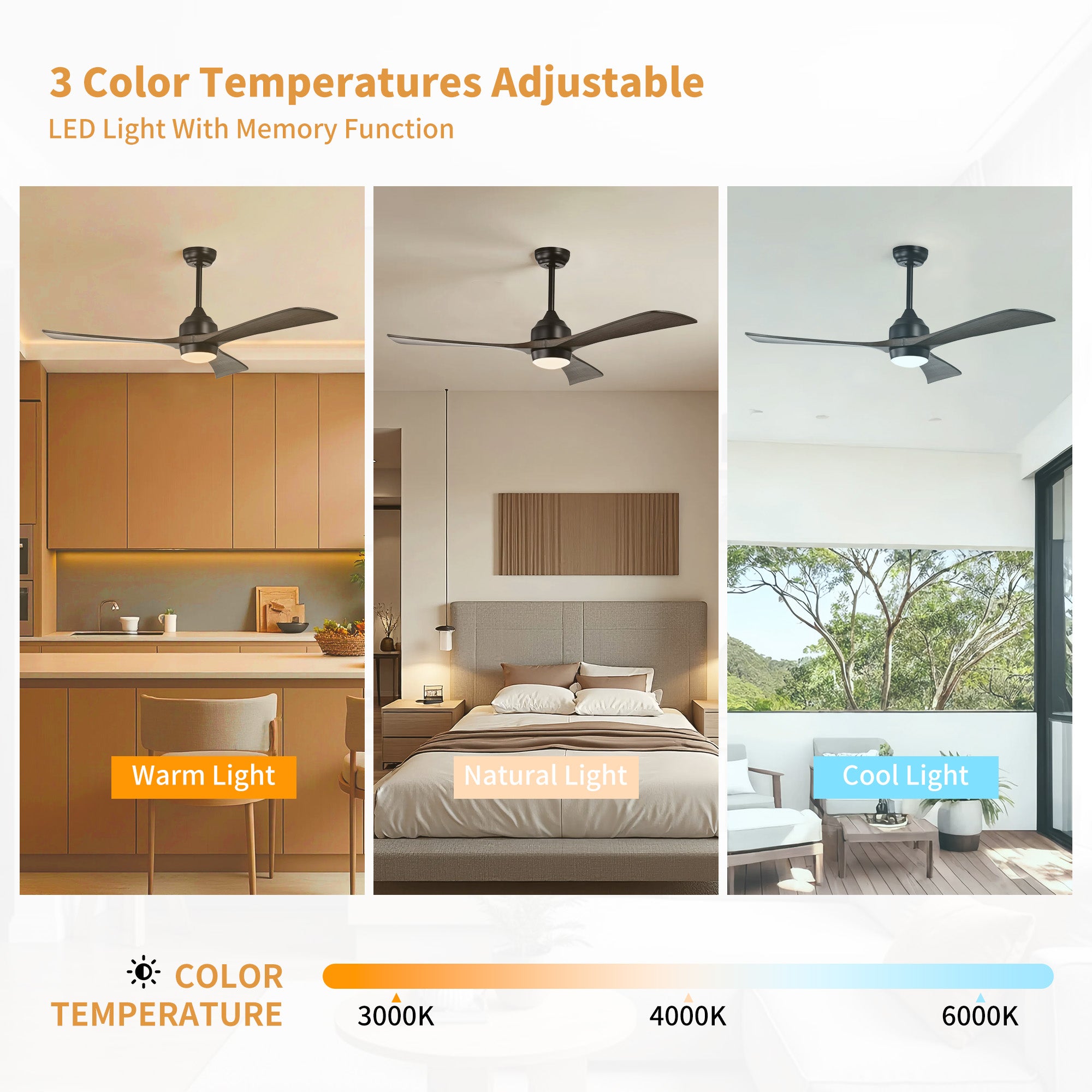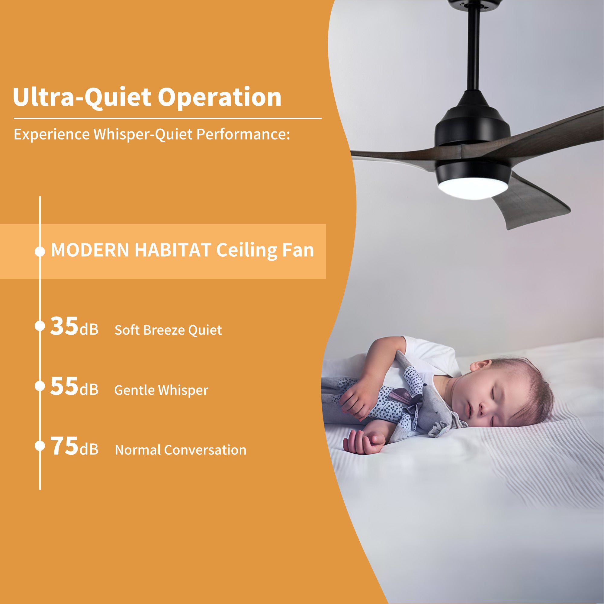 Stay warm and comfortable all winter with the 52 in. Matte Black Metal ceiling fan with light from Modern Habitat. Featuring three Solid wood blades with a reverse function that provides a winter ceiling fan setting mode, and comes with a remote control. The minimal design fits interiors that present both traditional and modern American lifestyles. The fan features easy-install Quiet Motor technology with three airflow modes, guaranteeing minimal noise. A quiet DC motor provides six adjustable speeds and Four timer settings. It comes with a 5 and 10 in. downrod to fit spaces from 200–400 square feet — from living rooms and kitchens to home offices and bedrooms — accommodating various ceiling heights from open-mount to high ceilings. The mounting options also allow installation on angled ceilings up to 15°. Warm lighting settings come with three lighting temperature options to help improve air circulation and enhance your holiday home living experience.