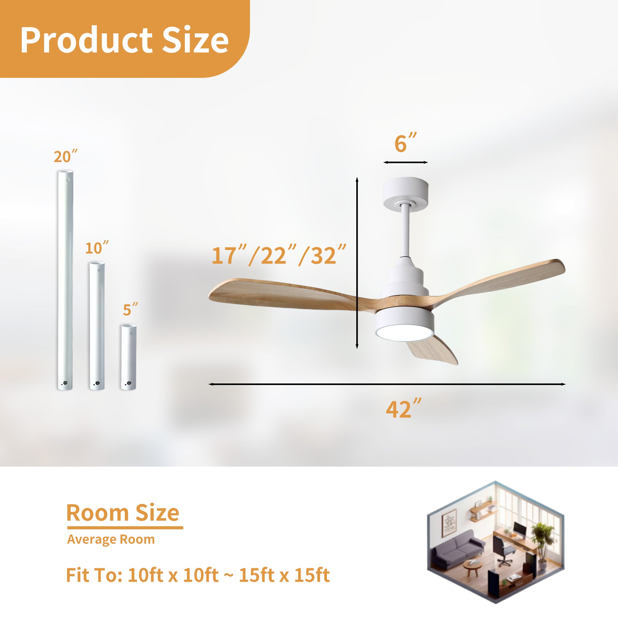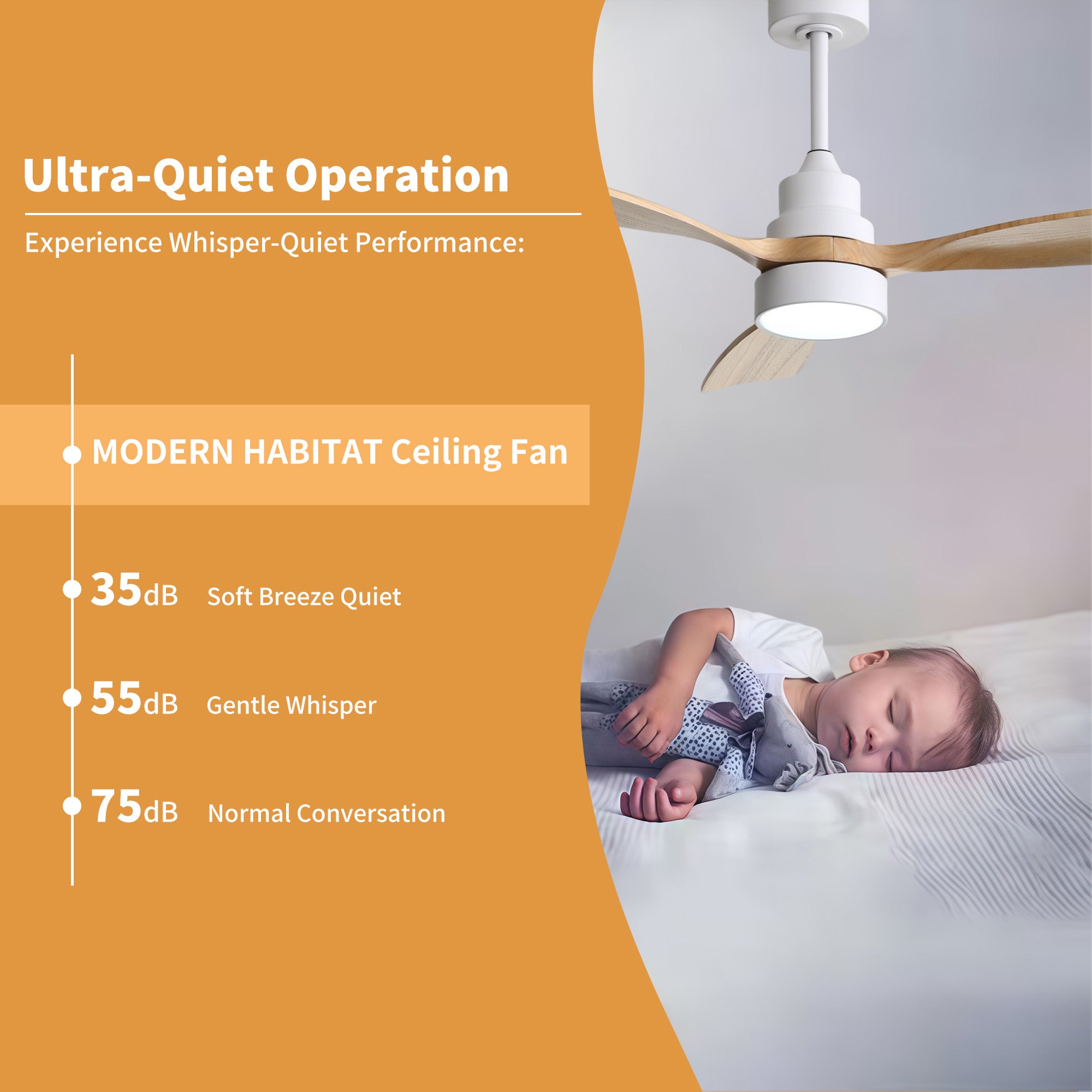 Stay warm and comfortable all winter with the 48 in. White Metal Ceiling Fan with Light from Modern Habitat. Featuring three solid oak wood blades in a smooth natural finish, this fan combines organic warmth with timeless farmhouse elegance.The quiet DC motor offers six speeds, timer settings, and a reversible airflow function to help circulate warm air during colder months. Ideal for rooms from 200-400 sq. ft., it includes dual-mount hardware and three downrod options for easy installation on flat or angled ceilings.The integrated LED light provides soft, dimmable illumination to create a cozy atmosphere - delivering warmth, balance, and year-round comfort in any space.