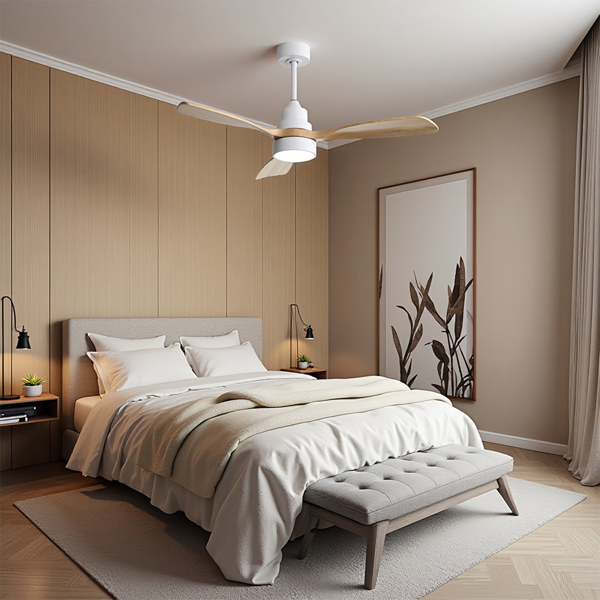 - 48 in. ceiling fan with natural oak solid wood blades and modern white housing for a warm, elegant look year-round.