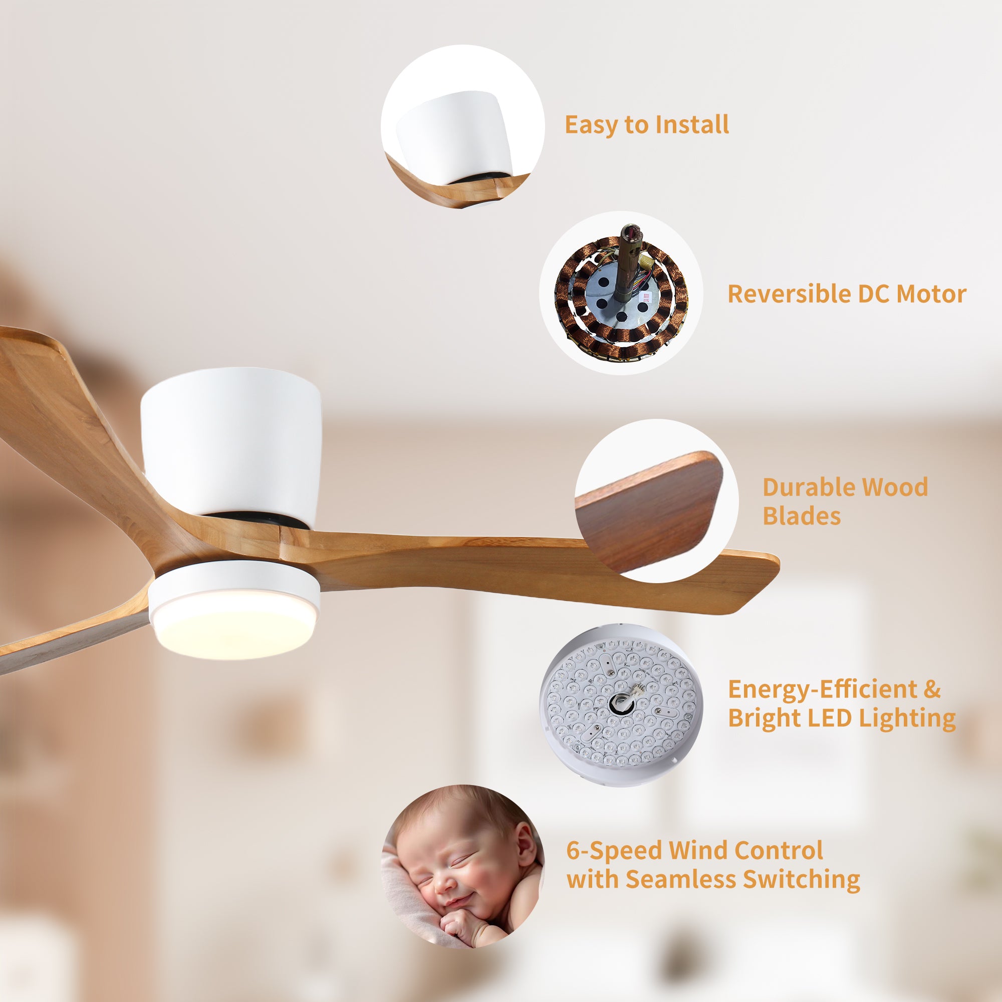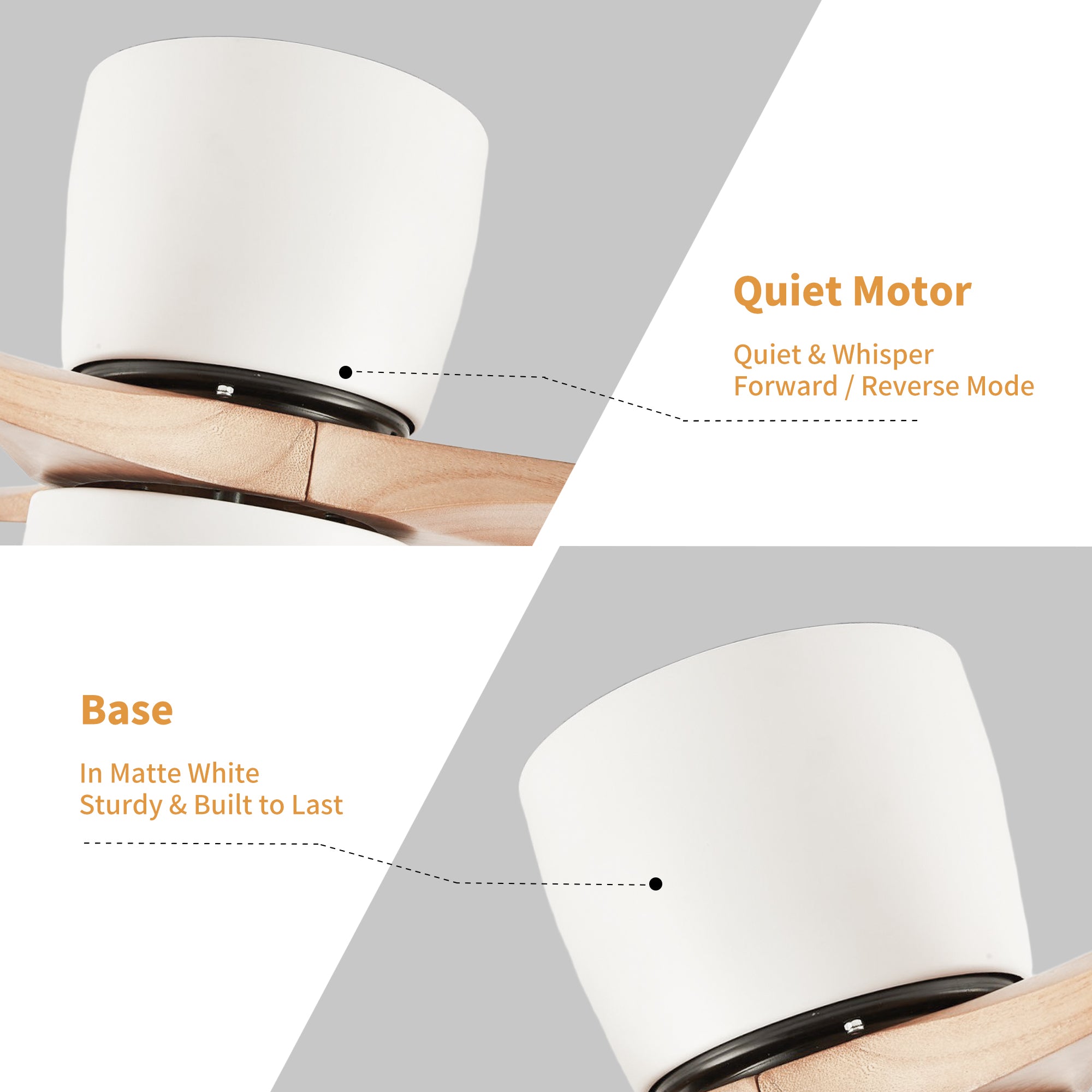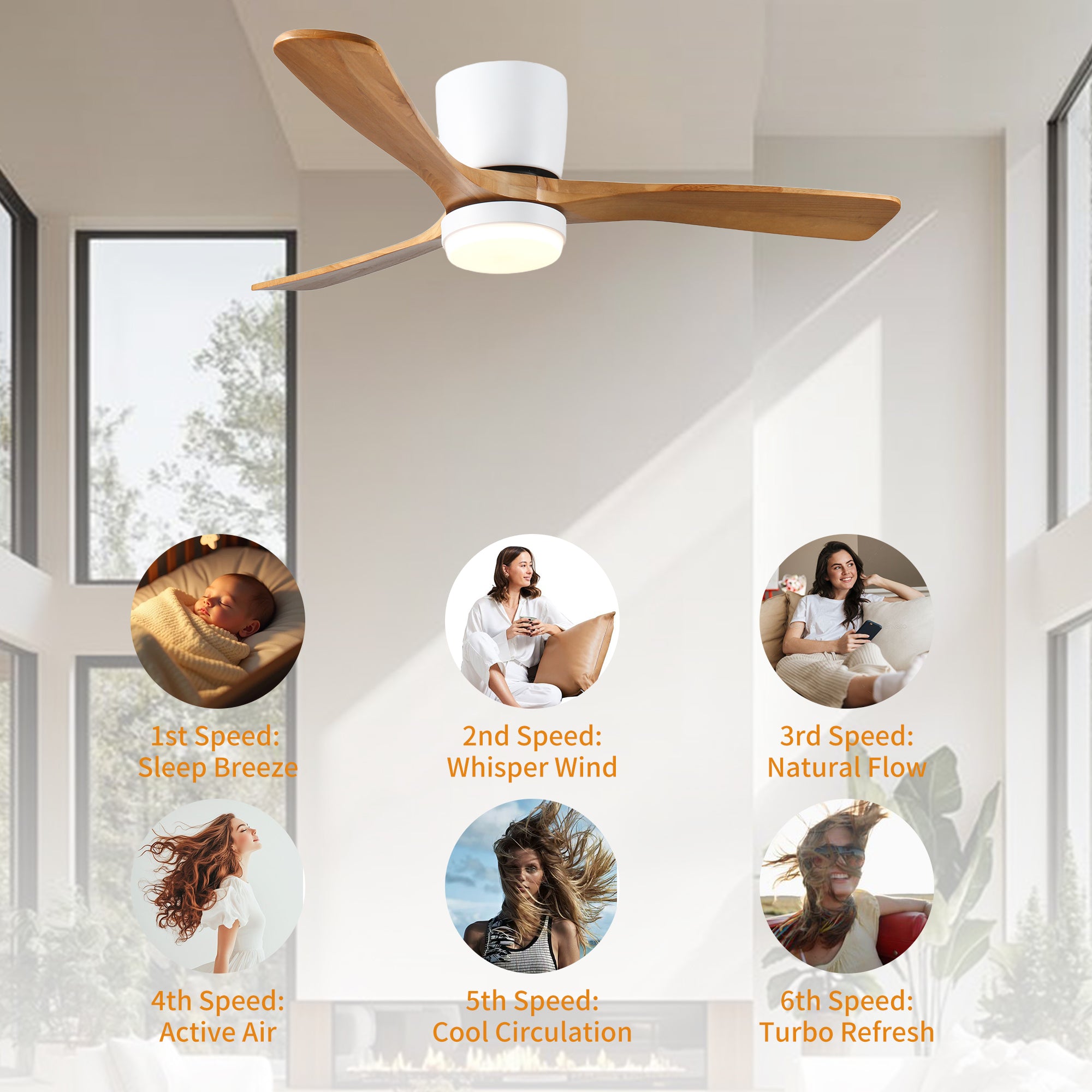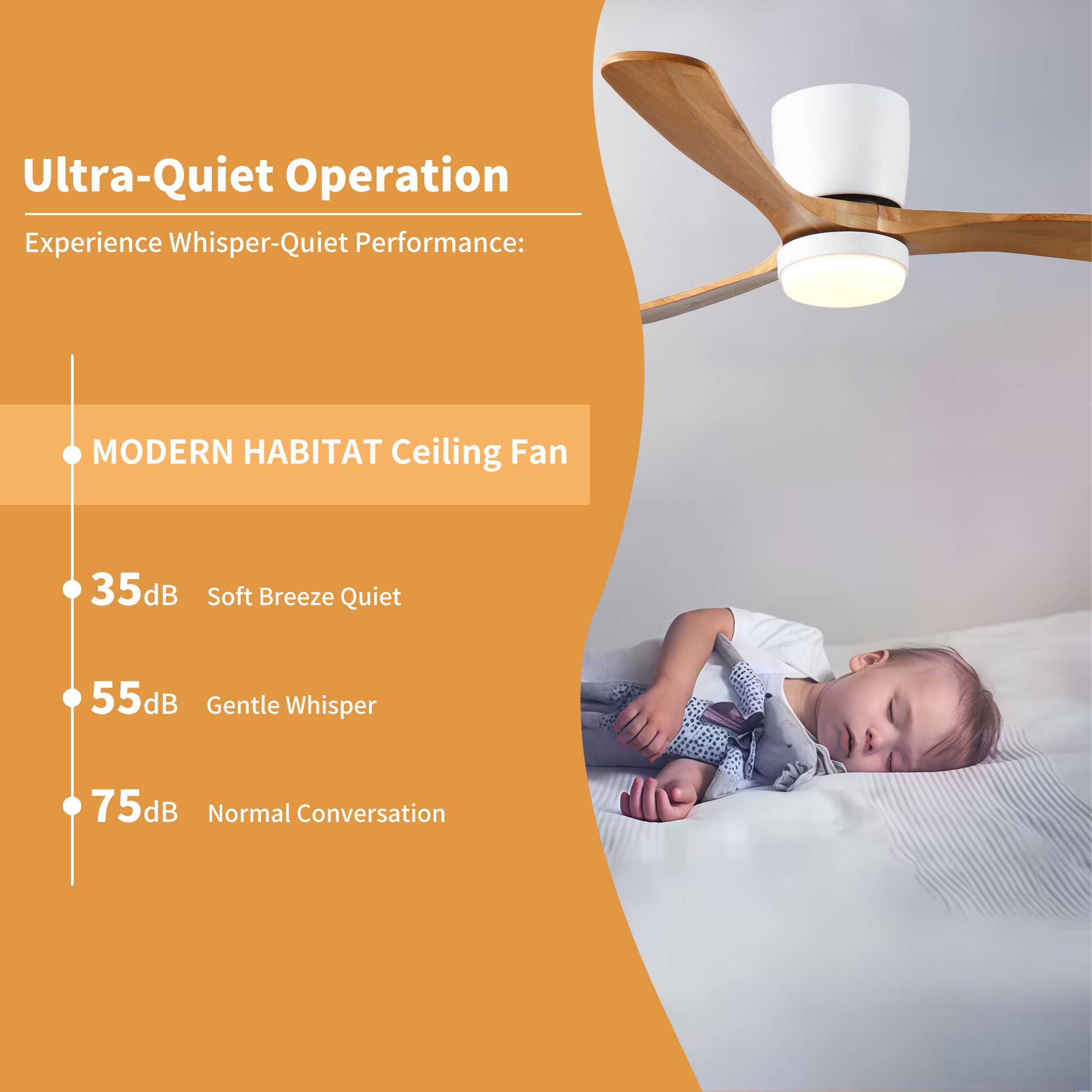 Enjoy your summer with the Serenityshine 42 in. Natural White ceiling fan with light-a quiet, flush-mount design from Modern Habitat Inc. The three Walnut wood blades feature a modern farmhouse style with a quiet DC motor that provides six adjustable speeds and two timeisettings with remote control. With a 10.8 in. height, it provide sample airflow for spaces between 200-400 square feet, perfect for living rooms, kitchens, and home office bedrooms-ideal for compact spaces. The fan features easy-install Quiet Motor technology with two airflow modes, quaranteeing minimal noise.