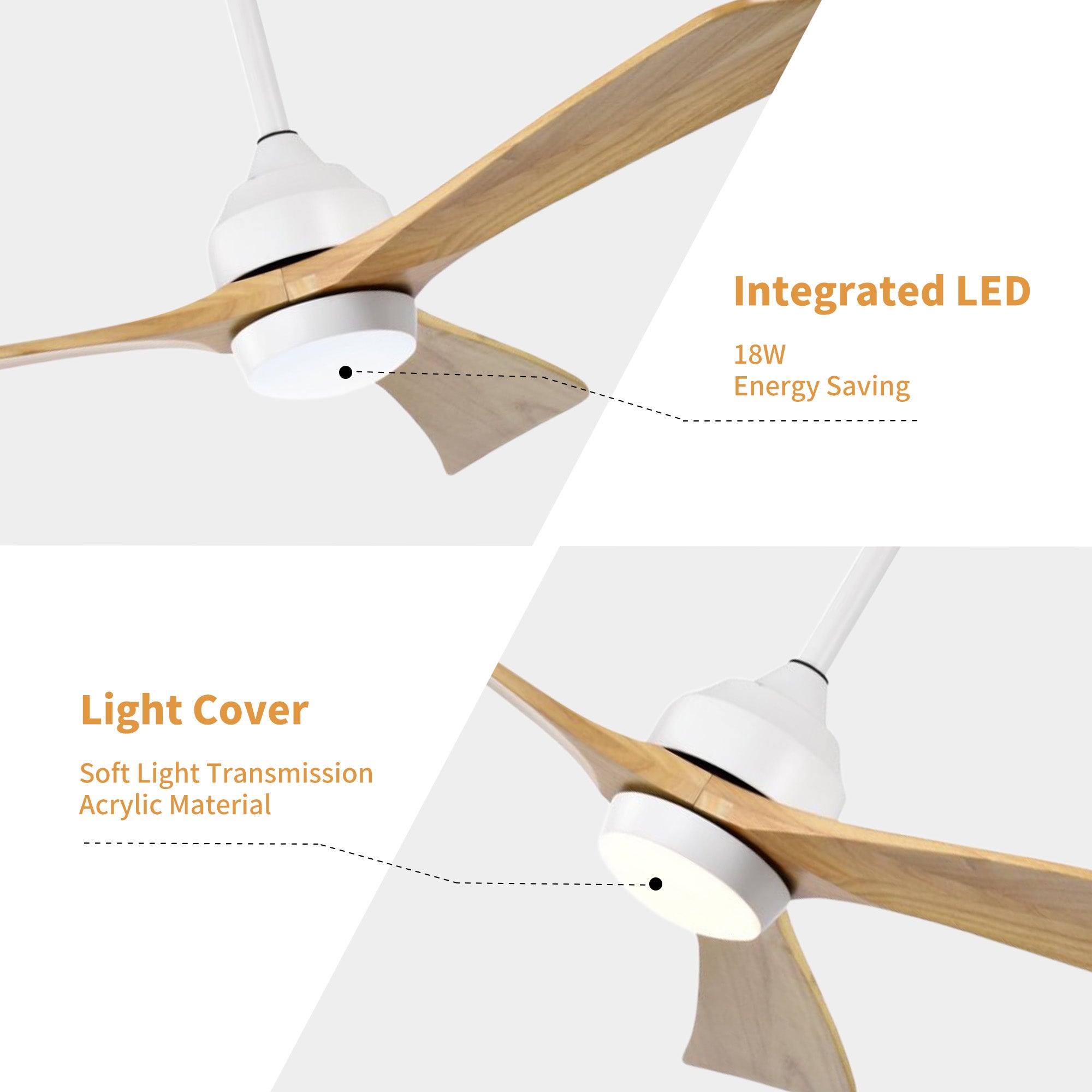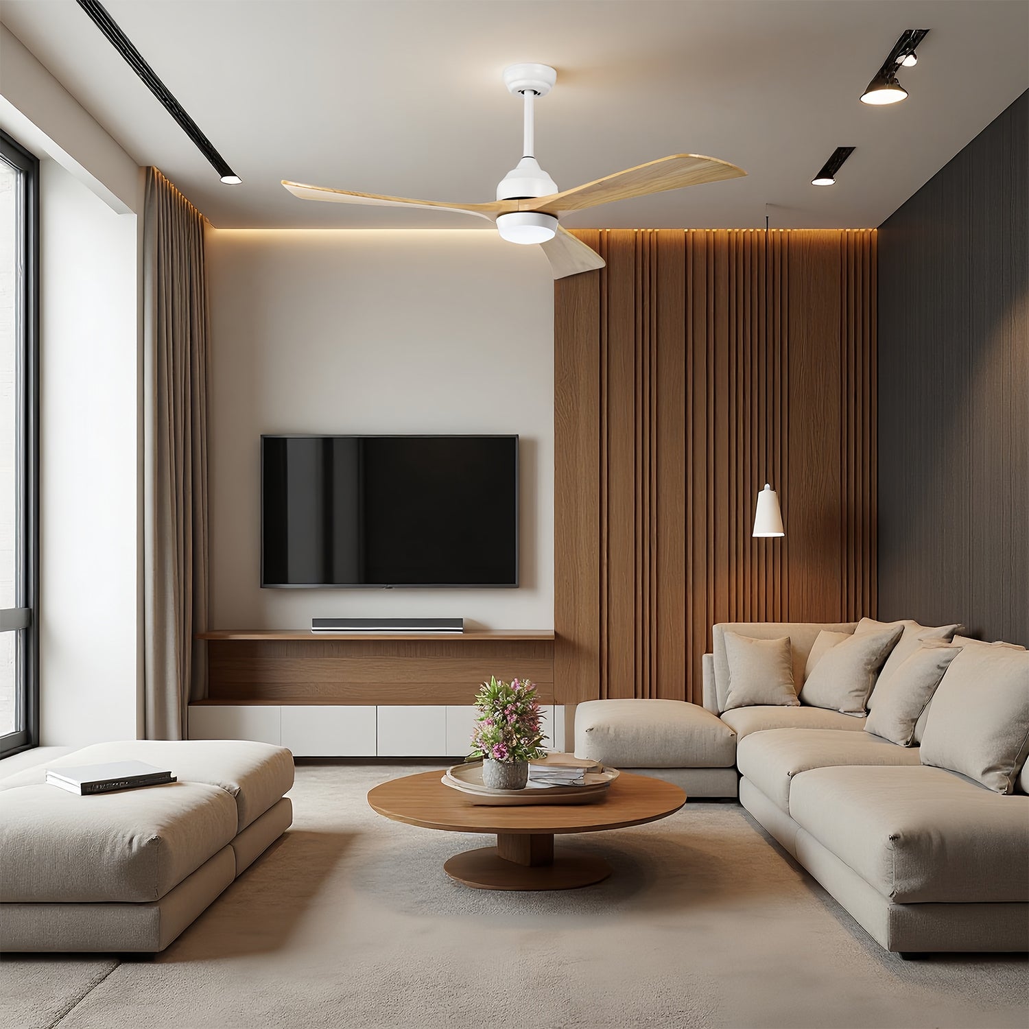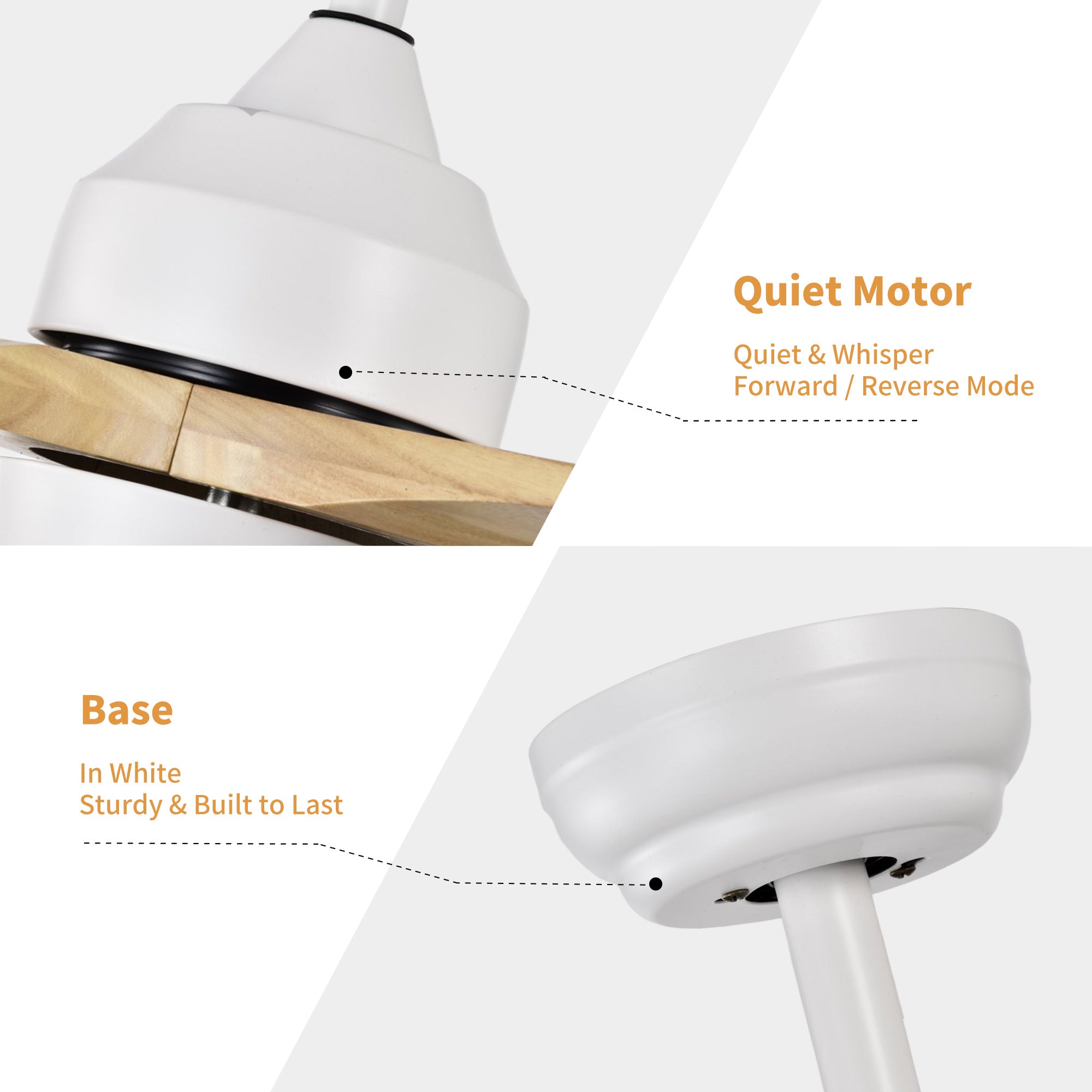 - Elegant white finish with oak wood blades offers a modern, sophisticated look for any decor.
