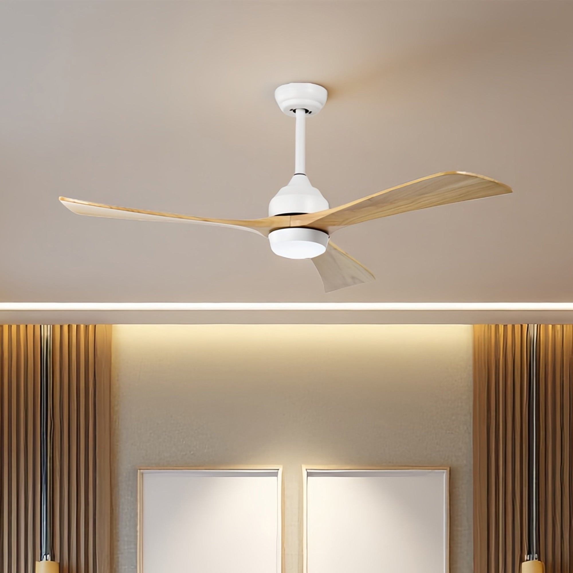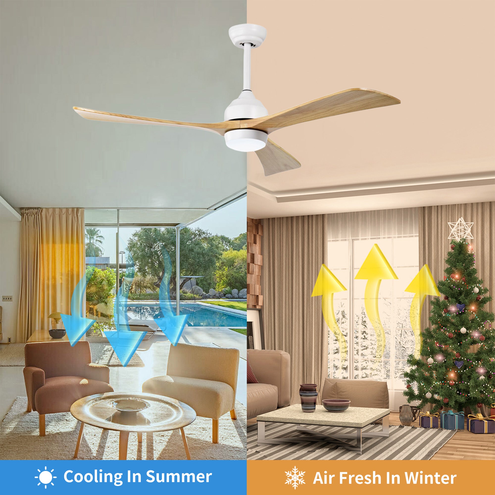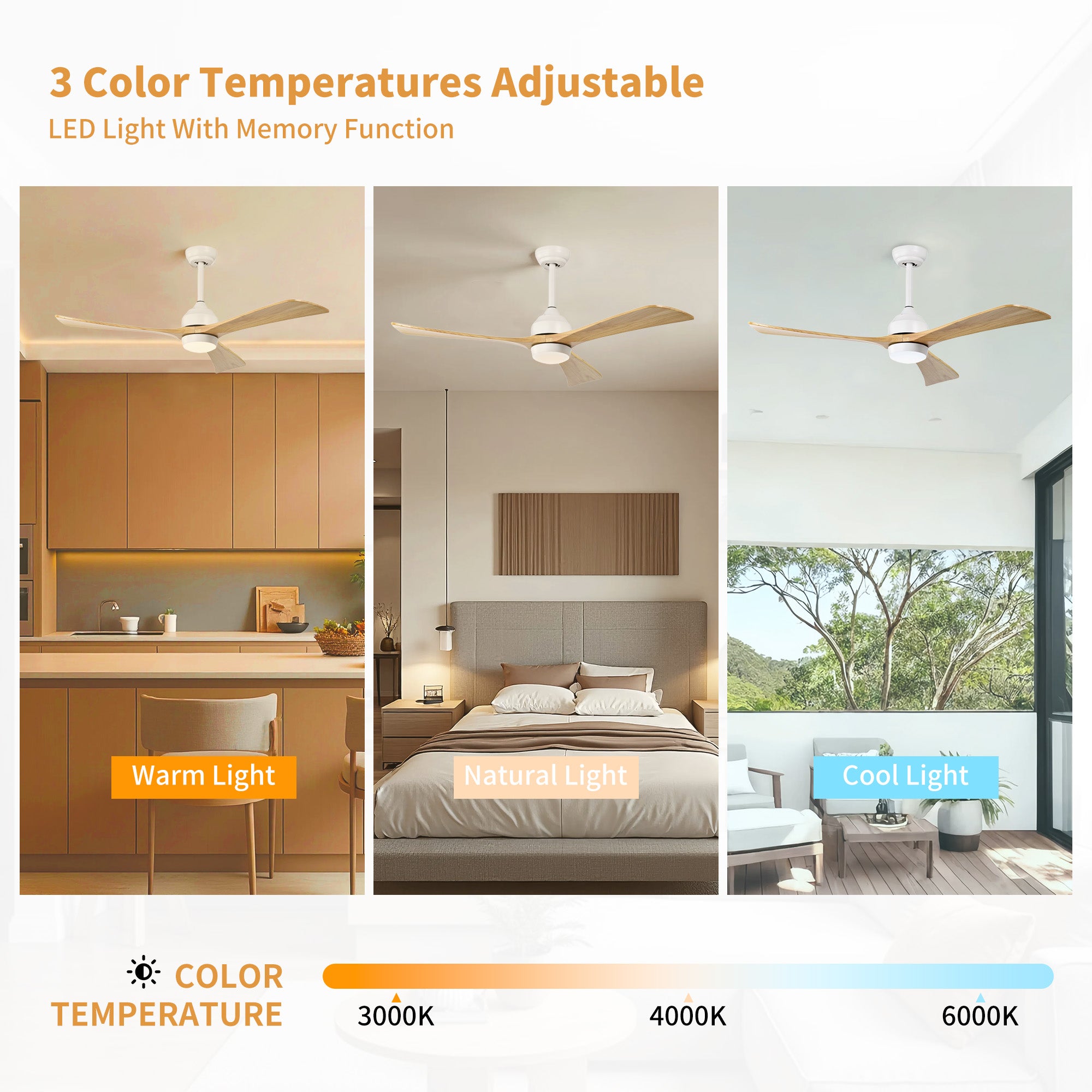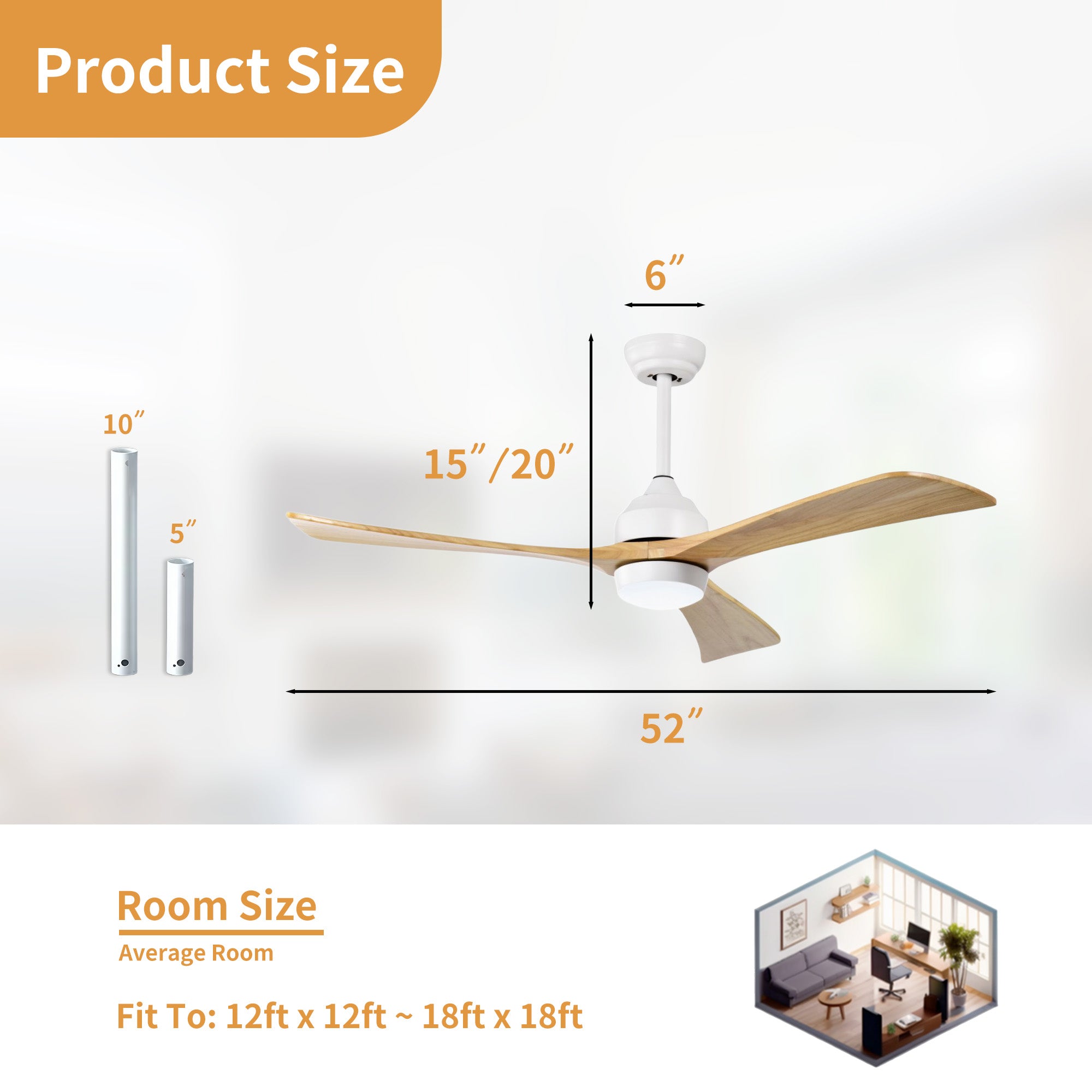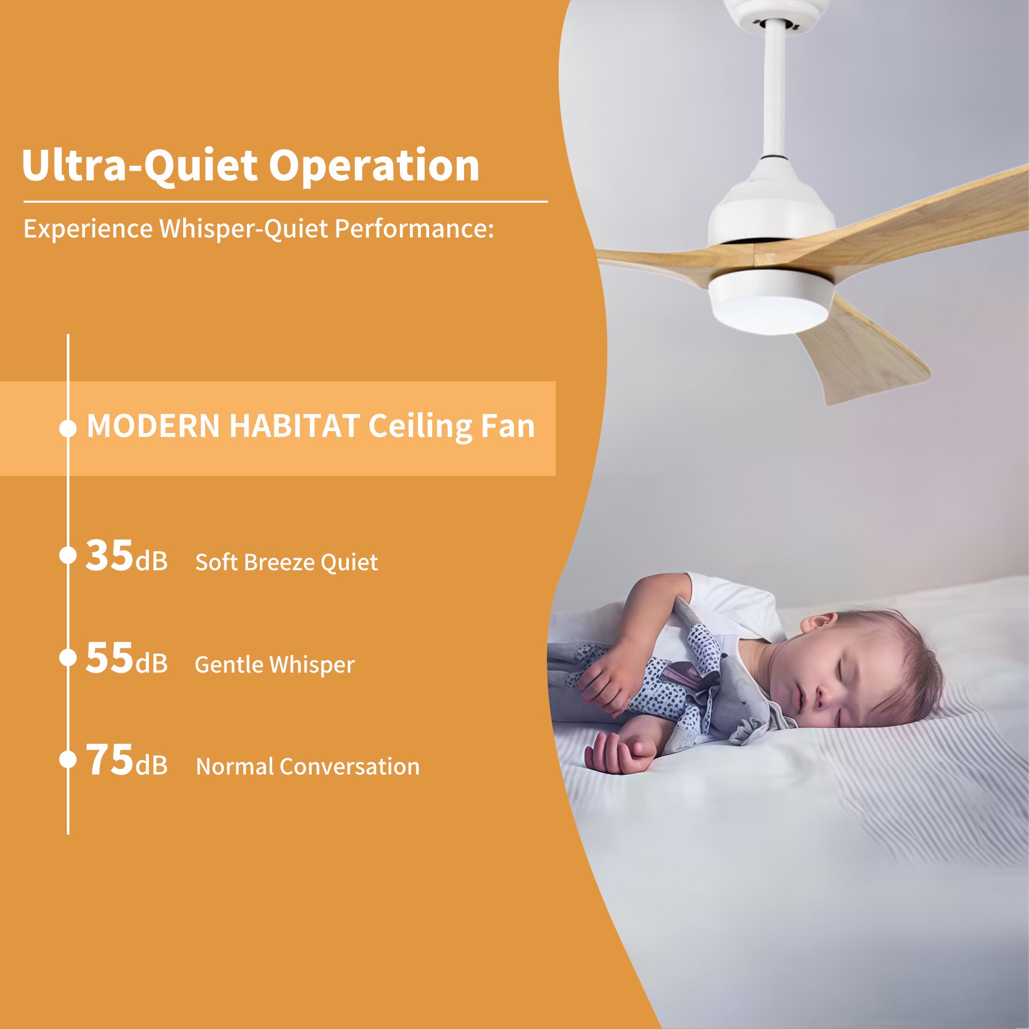 Stay warm and comfortable all winter with the 52 in. White Metal ceiling fan with light from Modern Habitat. Featuring three Solid wood blades with a reverse function that provides a winter ceiling fan setting mode, and comes with a remote control. The minimal design fits interiors that present both traditional and modern American lifestyles. The fan features easy-install Quiet Motor technology with three airflow modes, guaranteeing minimal noise. A quiet DC motor provides six adjustable speeds and Four timer settings. It comes with a 5 and 10 in. downrod to fit spaces from 200–400 square feet — from living rooms and kitchens to home offices and bedrooms — accommodating various ceiling heights from open-mount to high ceilings. The mounting options also allow installation on angled ceilings up to 15°. Warm lighting settings come with three lighting temperature options to help improve air circulation and enhance your holiday home living experience.