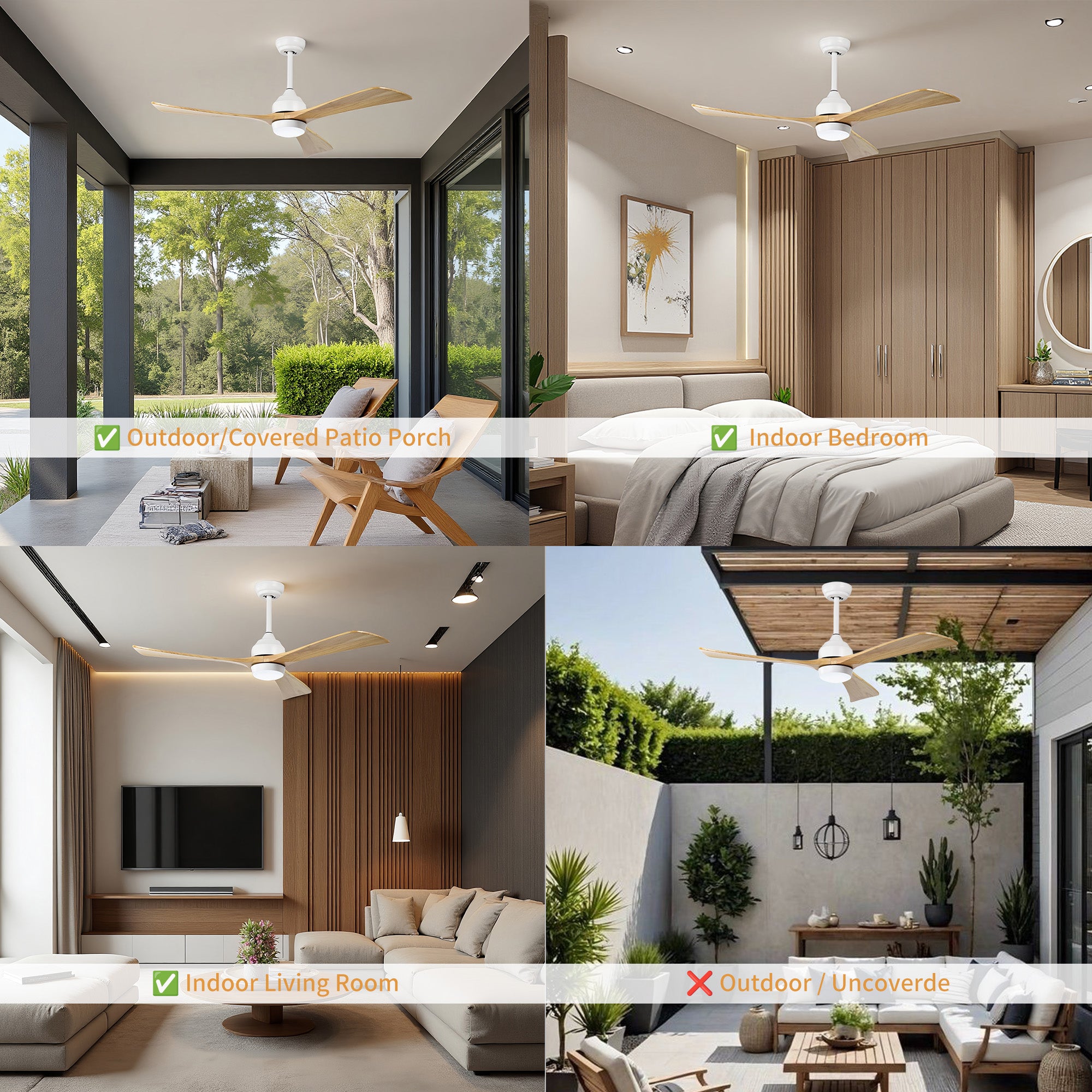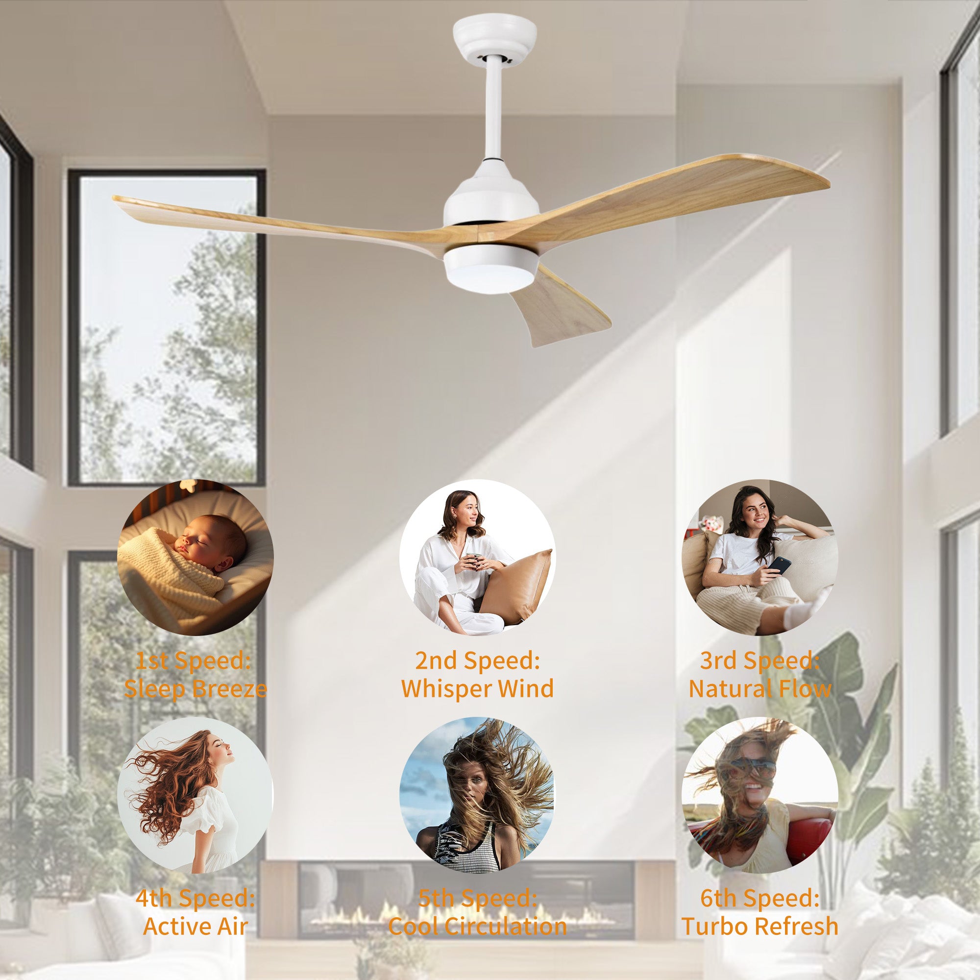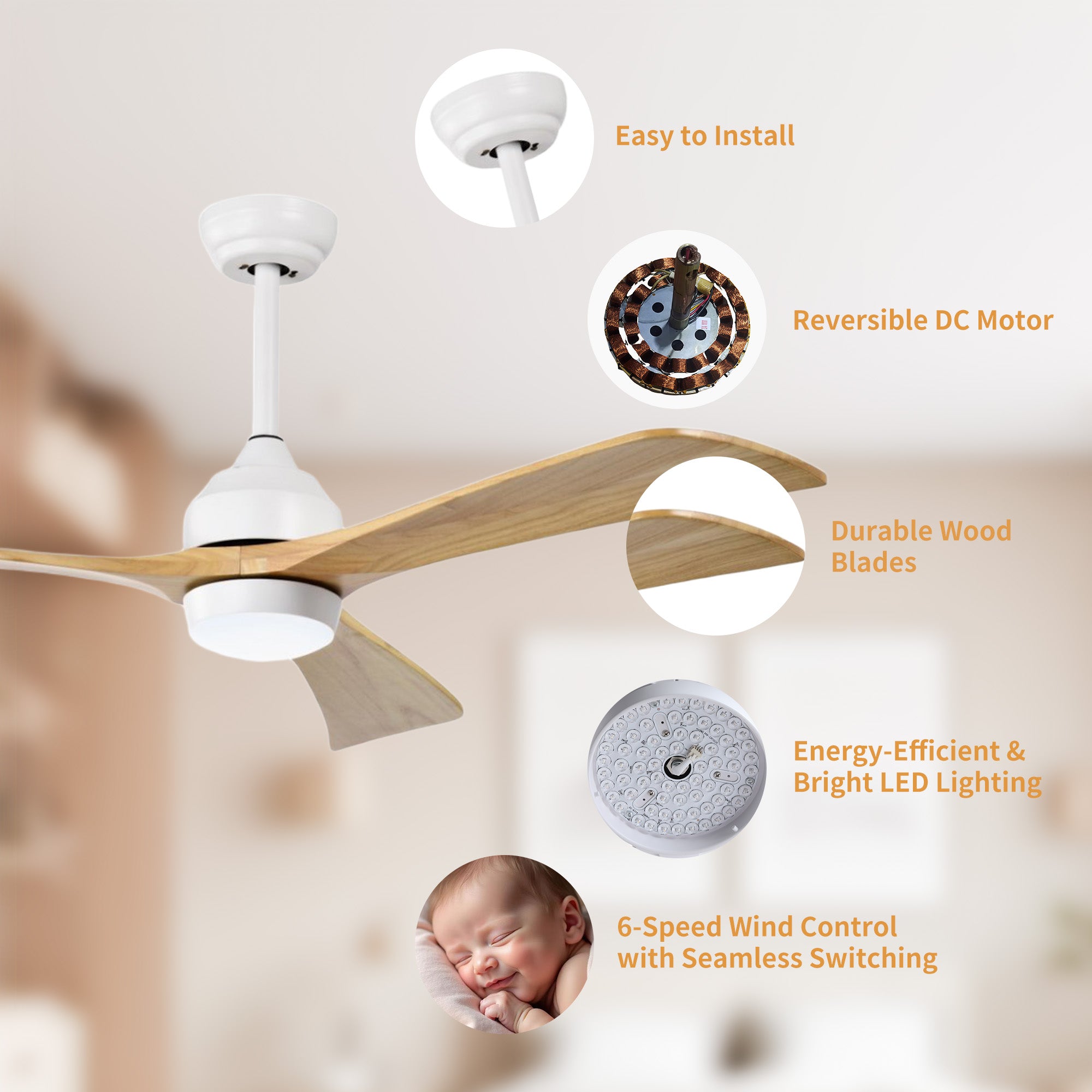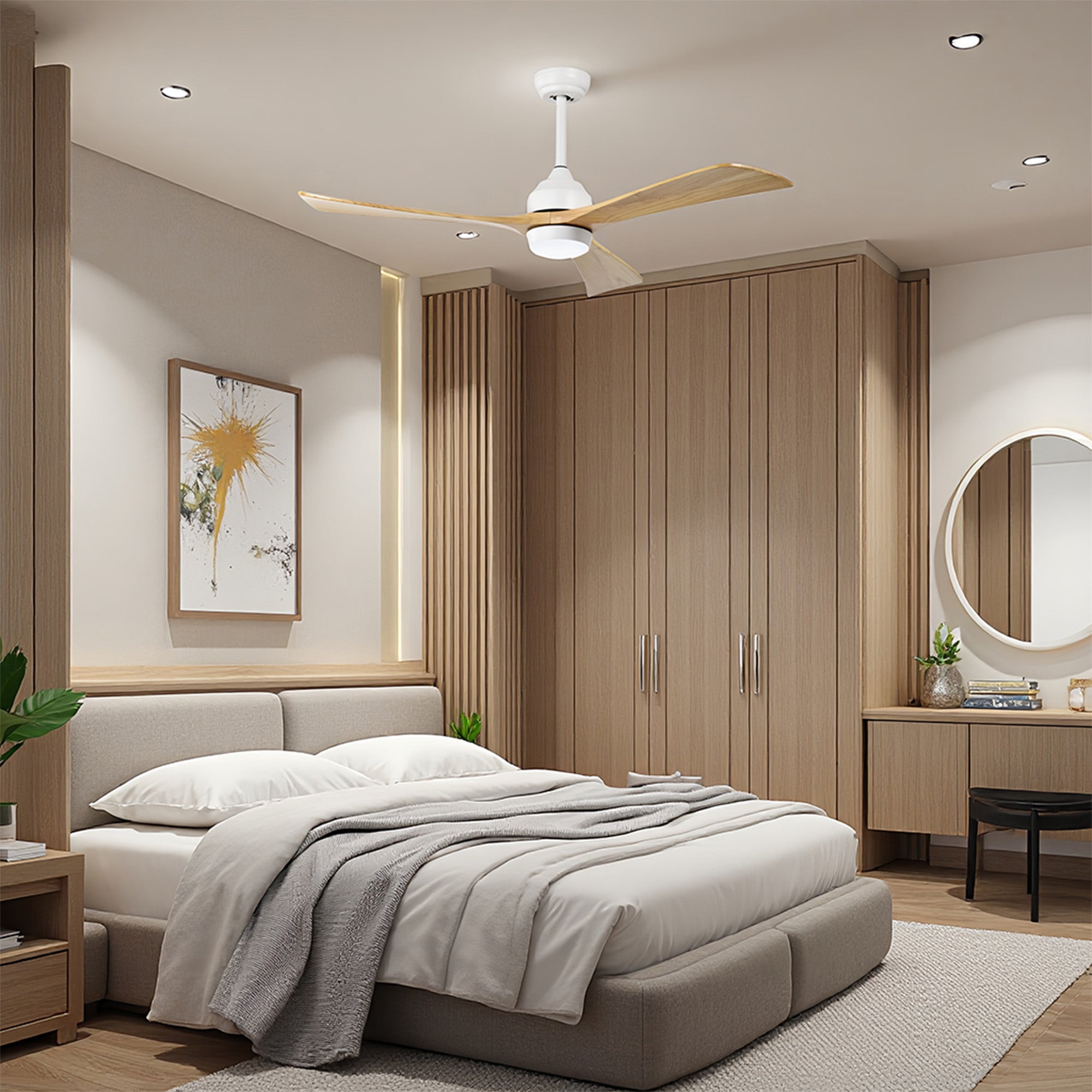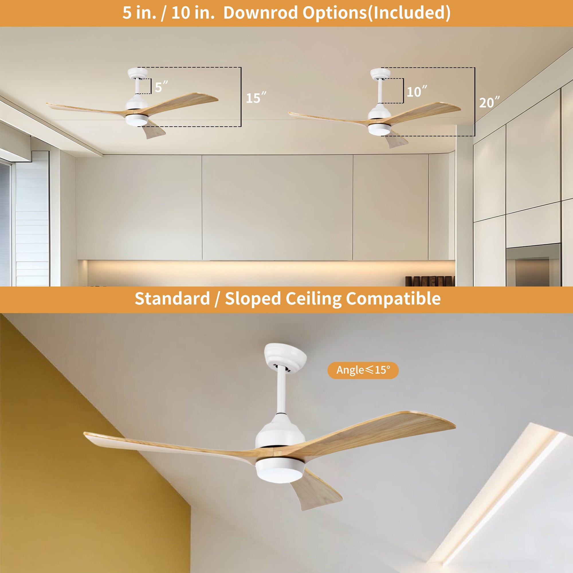 Stay warm and comfortable all winter with the 52 in. White Metal ceiling fan with light from Modern Habitat. Featuring three Solid wood blades with a reverse function that provides a winter ceiling fan setting mode, and comes with a remote control. The minimal design fits interiors that present both traditional and modern American lifestyles. The fan features easy-install Quiet Motor technology with three airflow modes, guaranteeing minimal noise. A quiet DC motor provides six adjustable speeds and Four timer settings. It comes with a 5 and 10 in. downrod to fit spaces from 200–400 square feet — from living rooms and kitchens to home offices and bedrooms — accommodating various ceiling heights from open-mount to high ceilings. The mounting options also allow installation on angled ceilings up to 15°. Warm lighting settings come with three lighting temperature options to help improve air circulation and enhance your holiday home living experience.